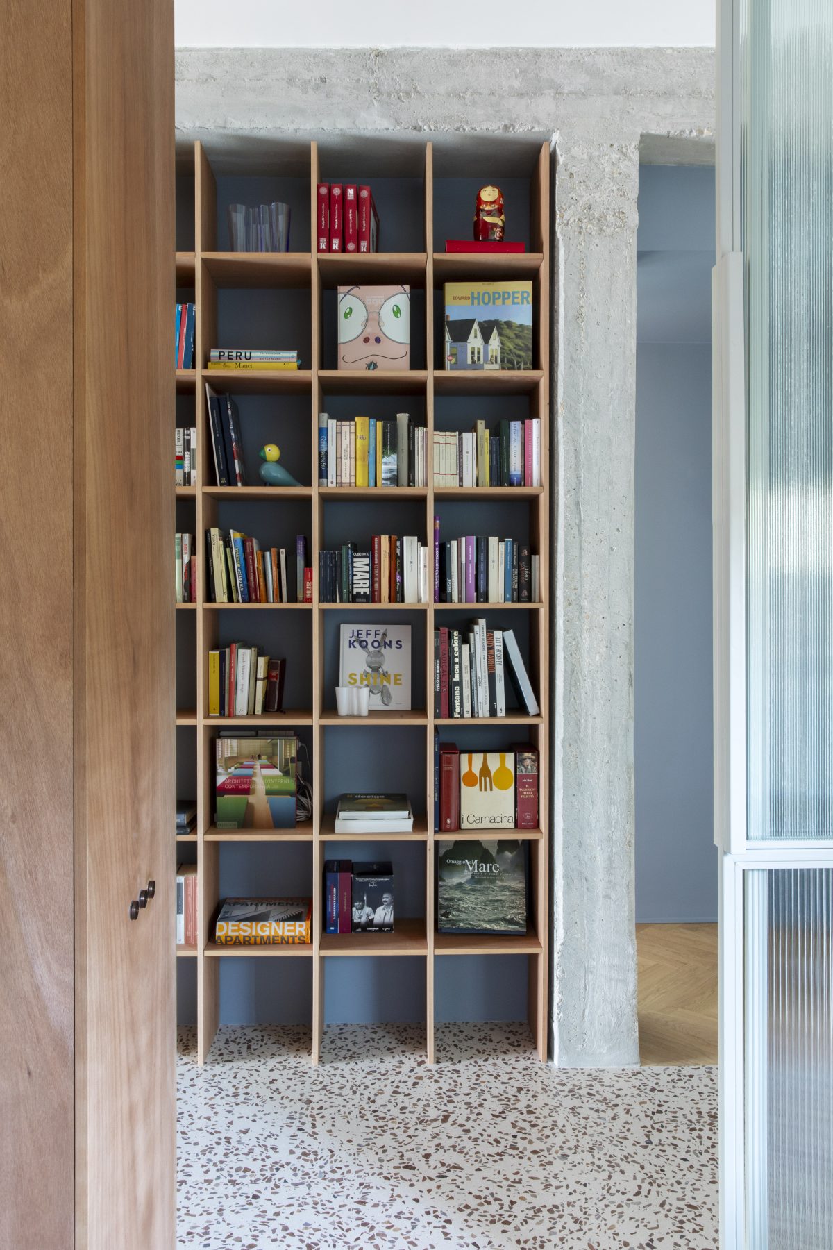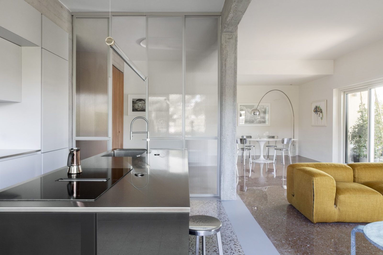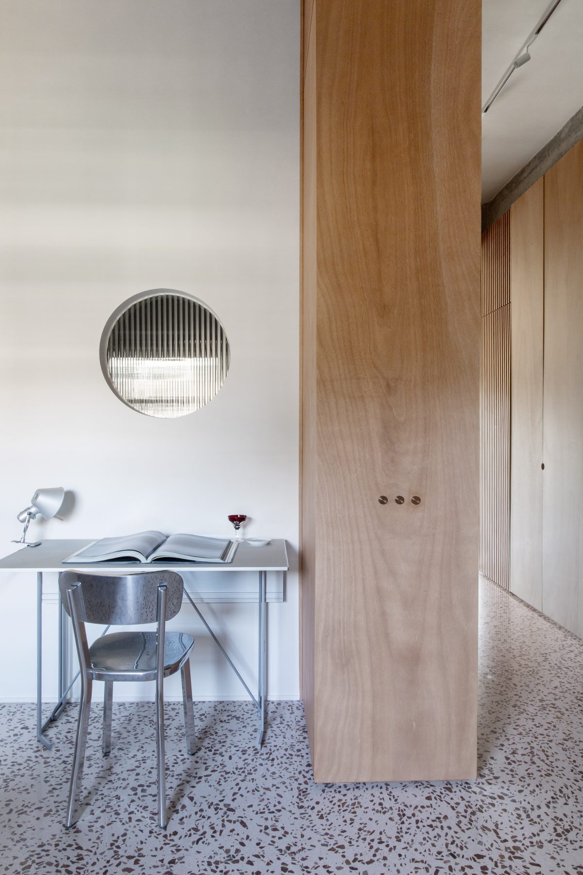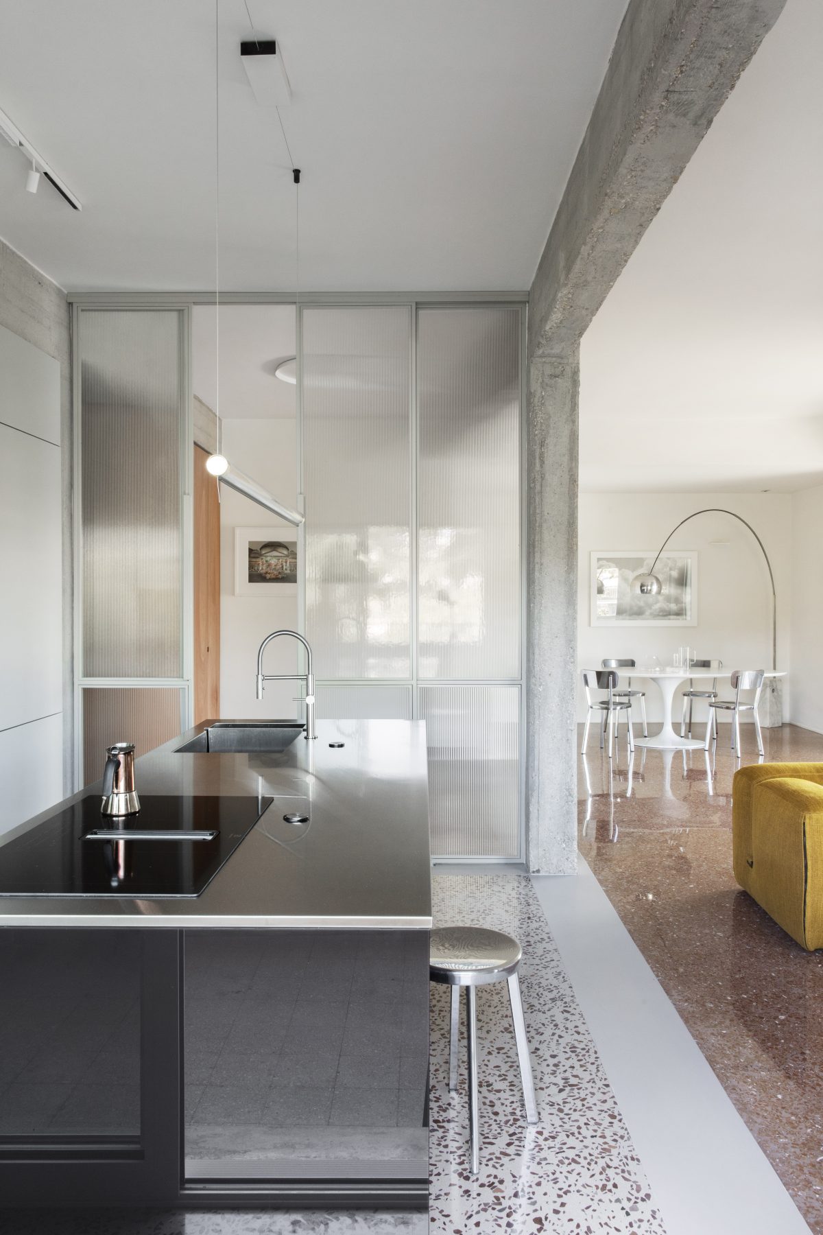 In Rome’s EUR district—known for its blend of classical Roman references and modernist forms—Maria Adele Savioli reimagines a 160-square-metre apartment as Casa Viale della Tecnica. Preserving the original Venetian flooring and exposed concrete structure, the project introduces fluid spatial sequences, glazed partitions, and bespoke furnishings that shape a quietly elegant contemporary interior. At the centre of the design, a multifunctional architectural volume subtly organises the plan, mediating between the living and private areas while reinforcing the apartment’s sense of openness and continuity.
