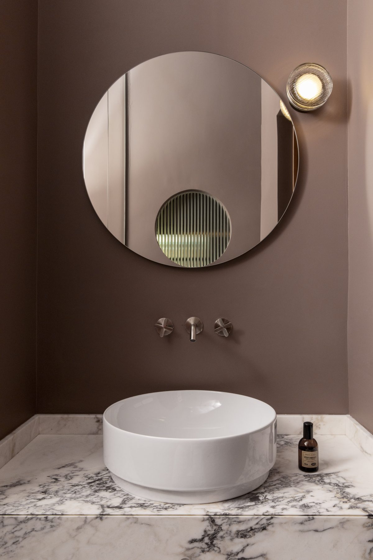 Both subtle and central, it integrates wardrobes, a bookcase, and a study, while discreetly concealing access to the private spaces. Passing through this volume reveals a corridor wrapped in a delicate powder-blue tone, guiding movement toward the more intimate areas of the apartment with quiet discretion.