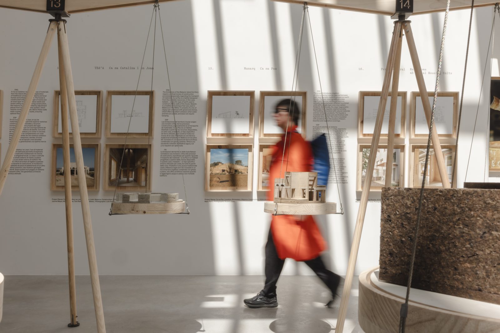 The exhibition is structured around a central room that serves as an introduction and five side rooms that present different research topics. The central room, titled Balance, brings together 16 architectural projects from different studios selected through a call for entries, each presented through two models, giving 32 in total. The buildings on display employ different types of stone (granite, limestone, sandstone, and slate), use varieties of wood (pine, fir, cork, teak) adapted to the species available in each geography, use materials originating from the soil itself (clay, compacted earth, or bricks), incorporate natural fibres and insulation, or develop urban mining techniques.