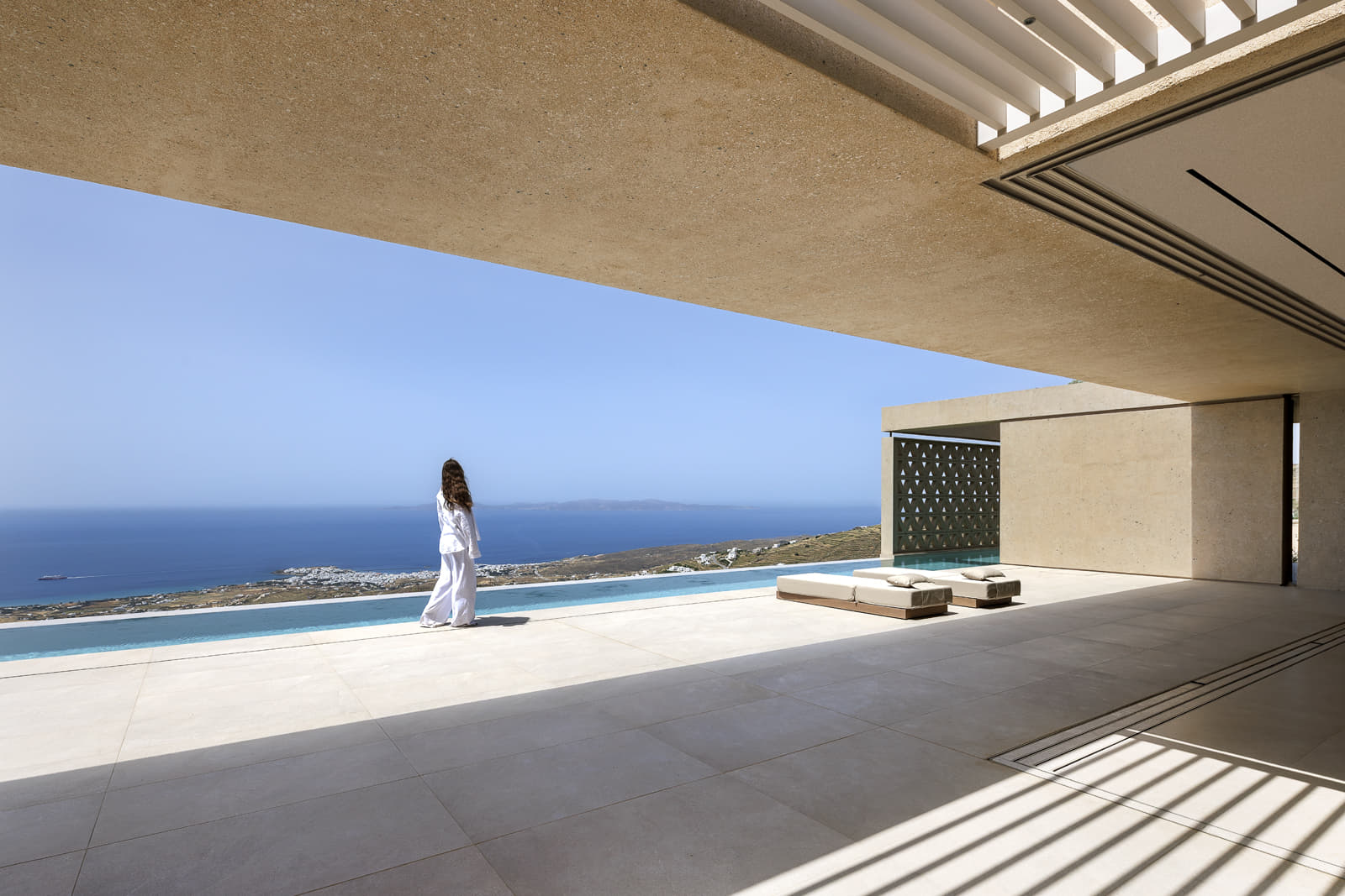 Ο ήλιος φιλτράρεται από τις πέργκολες ενώ oι έντονες σκιές στη συνέχειά τους αποτελούν έκφραση της αρχιτεκτονικής απλότητας του σπιτιού.
