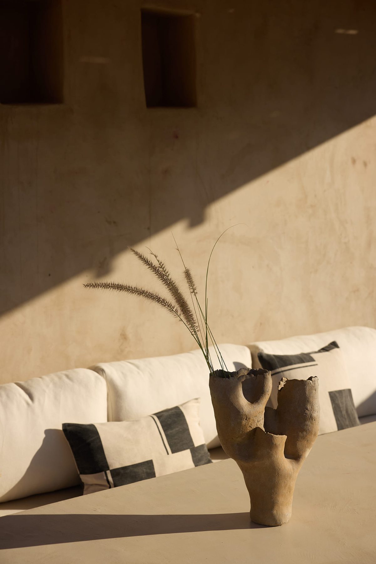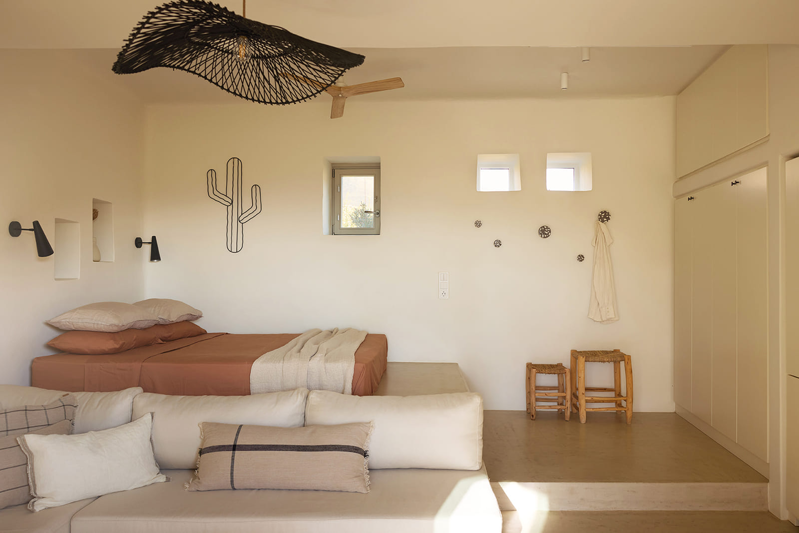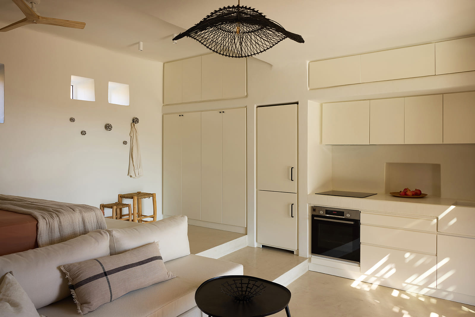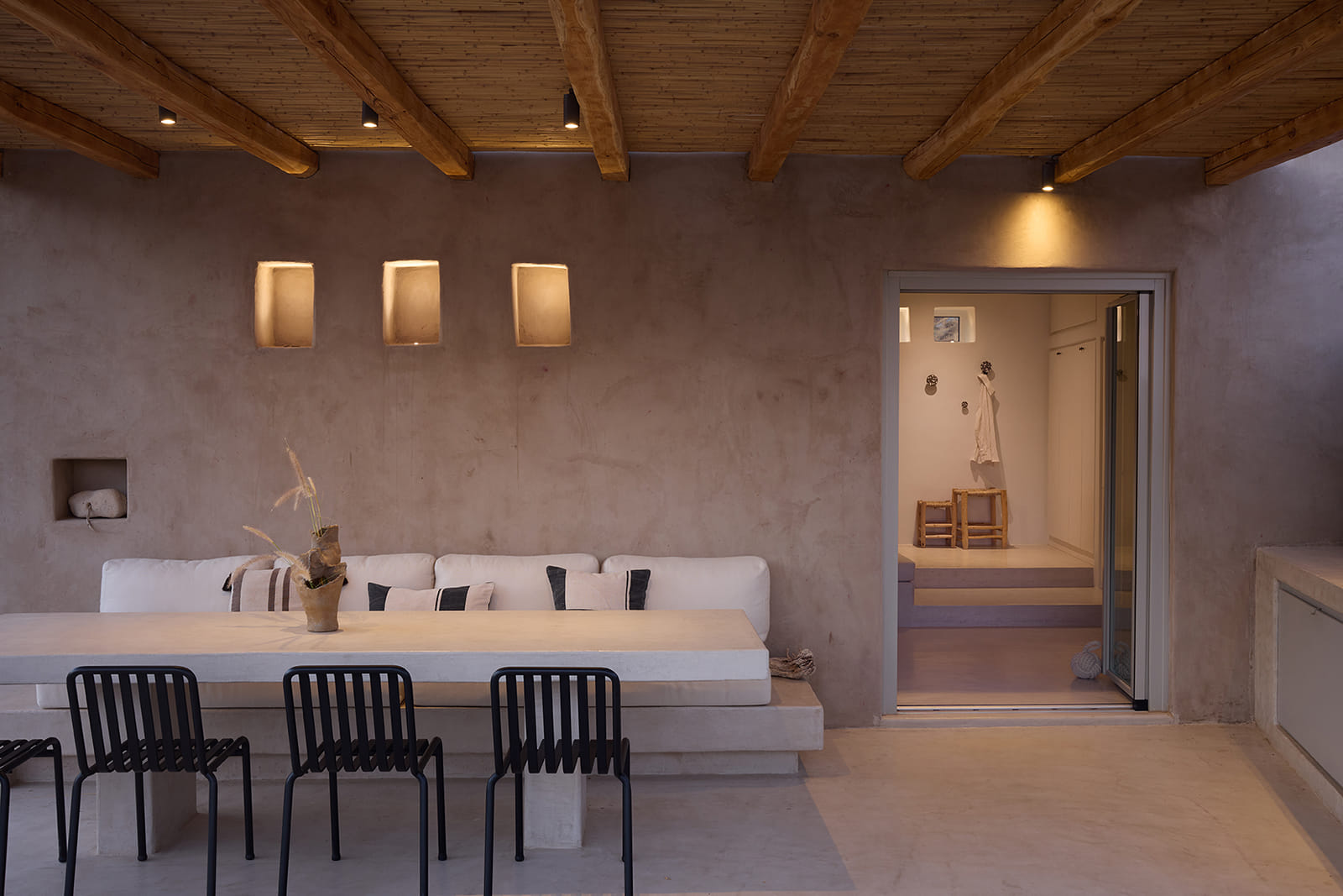 The outdoor courtyard, protected from the Cycladic winds, was designed as a space for relaxation and enjoyment of the view. It includes a large built-in dining area with a built-in sofa, an outdoor kitchen, and a daybed oriented toward the view of Chora. Shading is provided by a pergola made of natural chestnut wood and reed, creating a cool and inviting atmosphere, ideal for outdoor living.