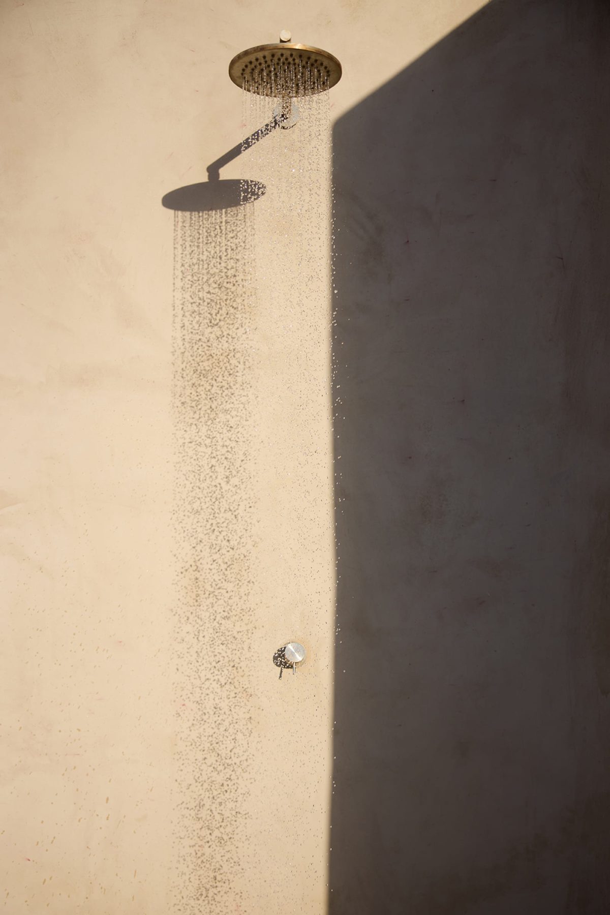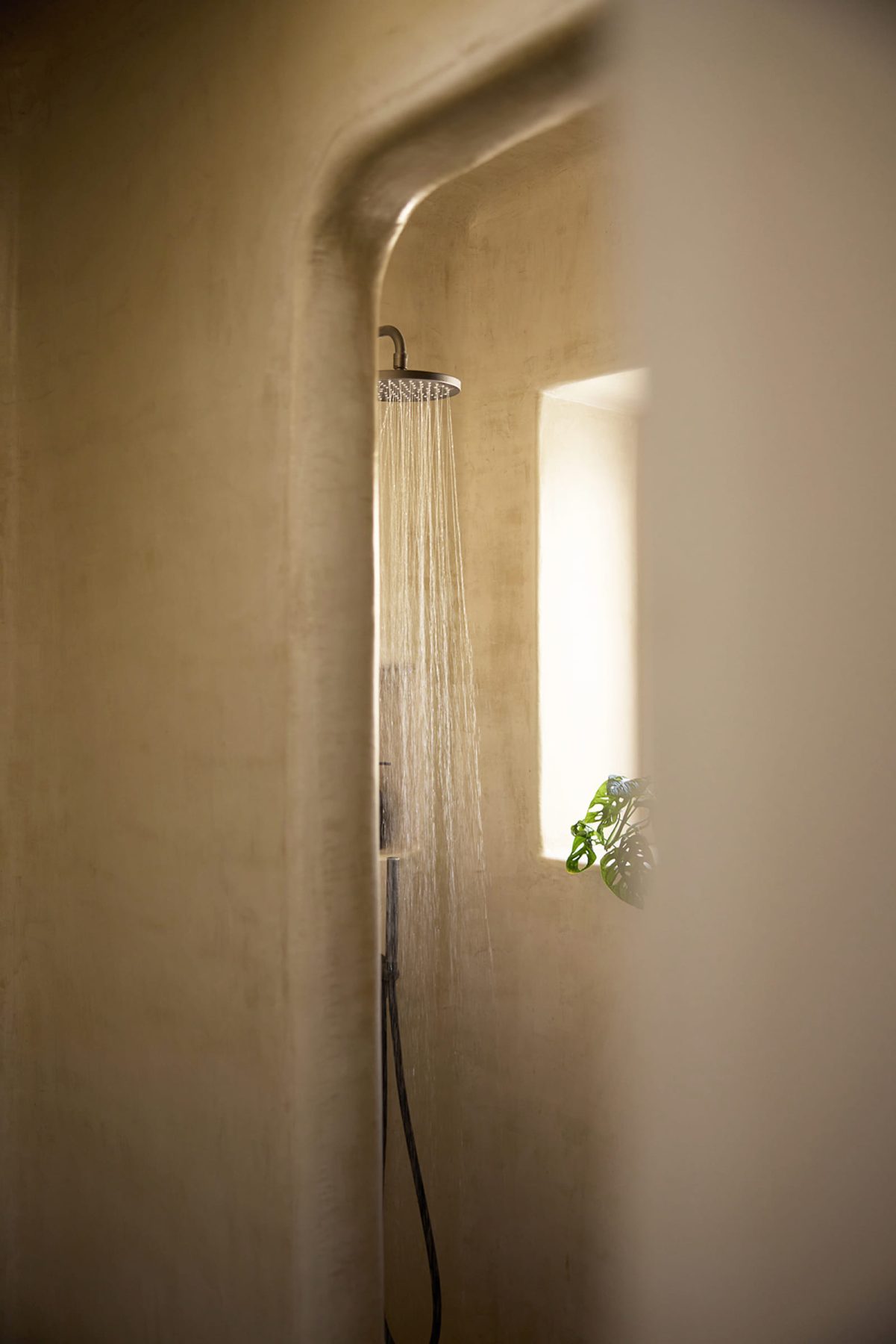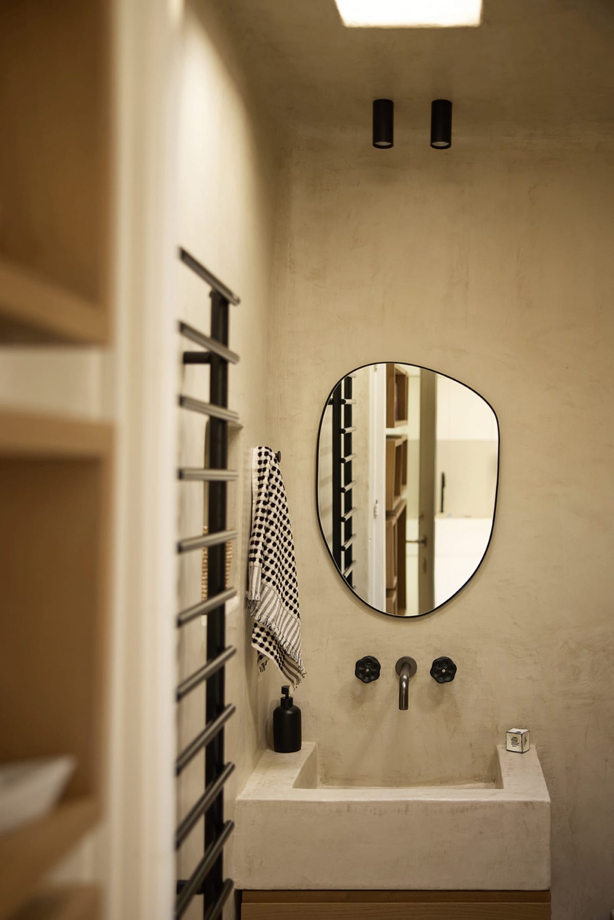Στο λουτρό, τρεις μικροί φεγγίτες στην οροφή εξασφαλίζουν άπλετο φυσικό φως, ενώ προσδίδουν μια ιδιαίτερη αισθητική στο χώρο.