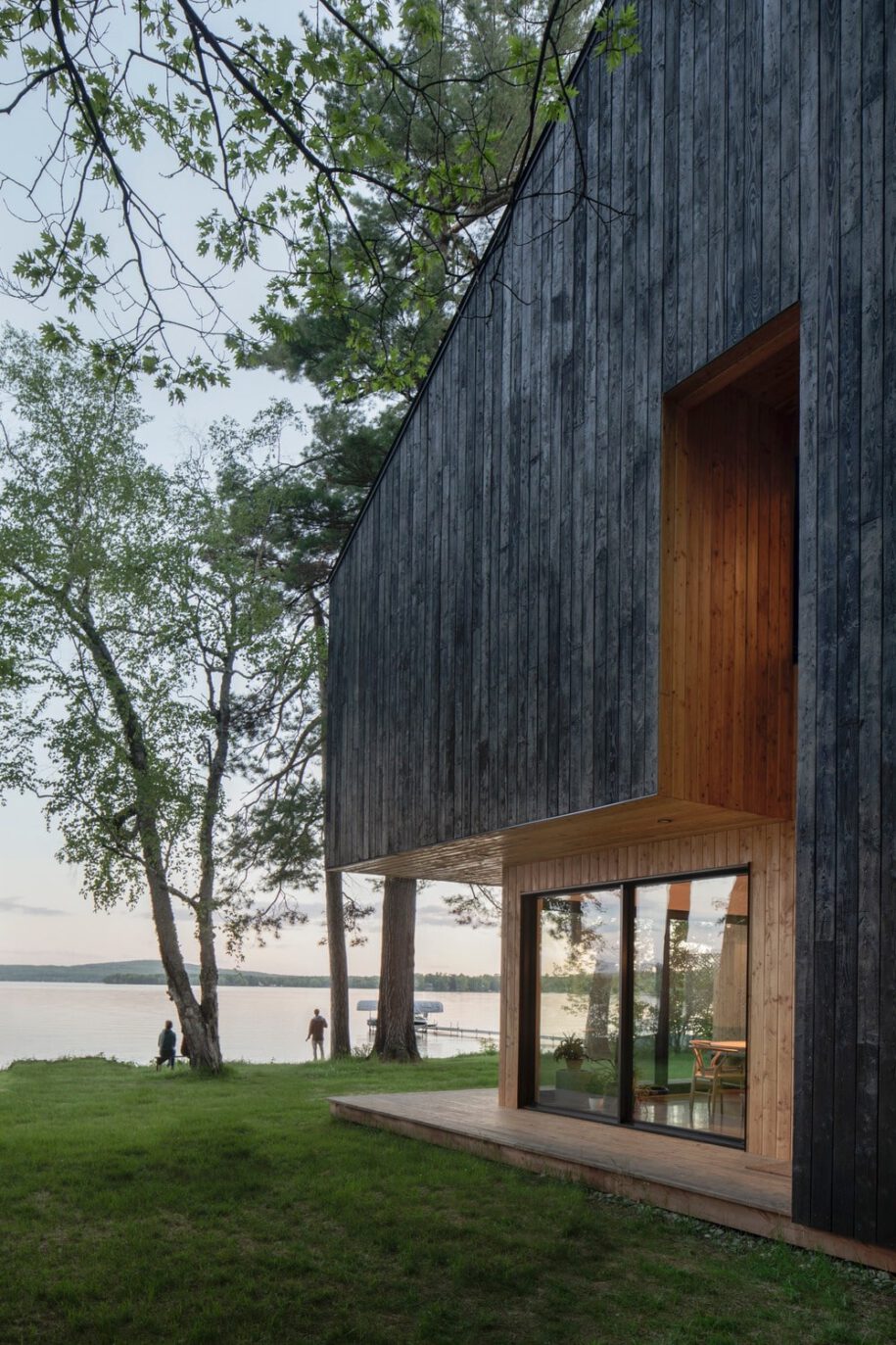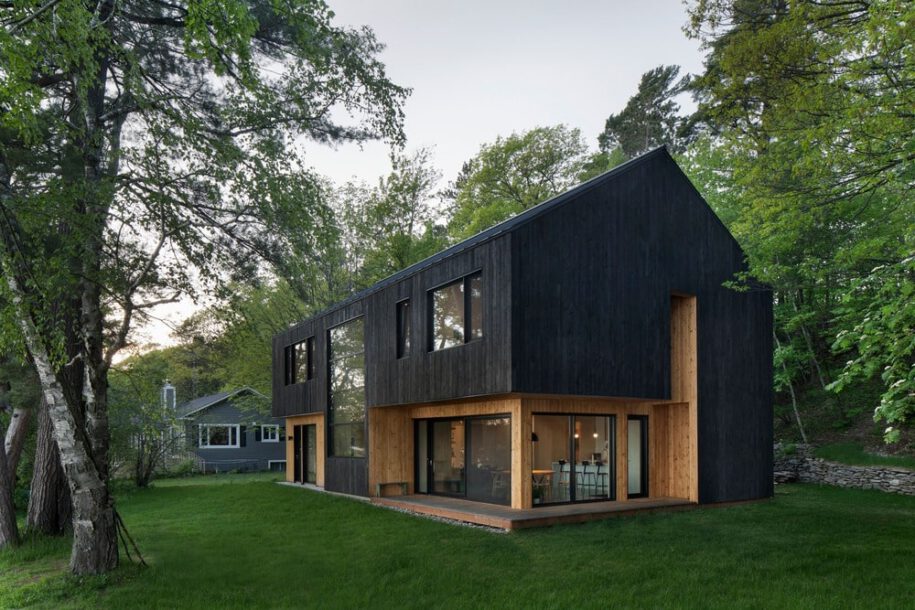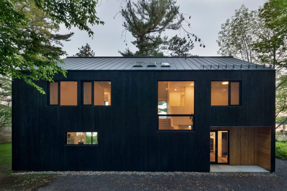 The tension rooted in the site stems from urban-size width that squeezes the house between a number of others houses on its sides and its infinite view over the lakefront sheltered by a natural wall created by the tree-filled hill in the back. We have created the Black Cabin situated near a small town in the Eastern Townships, set amongst classical 19th- century houses and more recently built modest cottages.