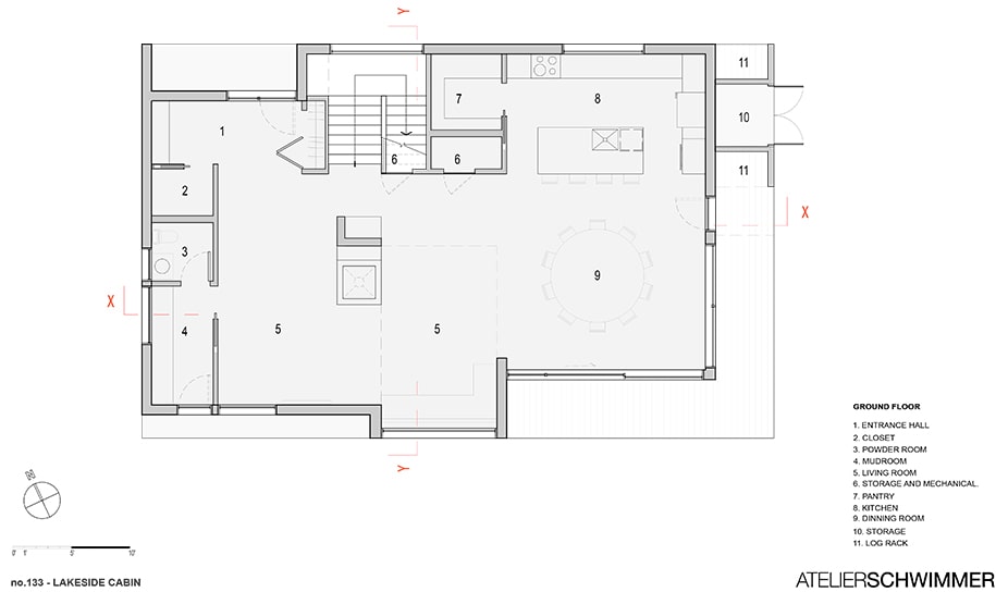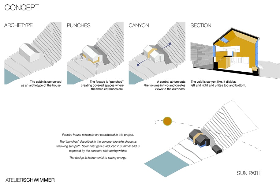 The cabin is centered around an atrium that opens to the outdoors. The design was developed around a fireplace set beside a triple-height area that makes it visible from everywhere within the cabin thus generating a canyon of hospitality.