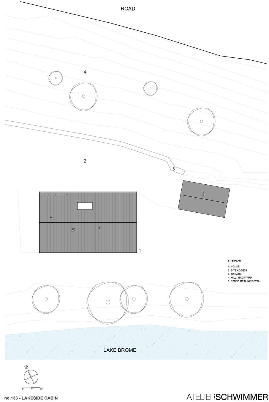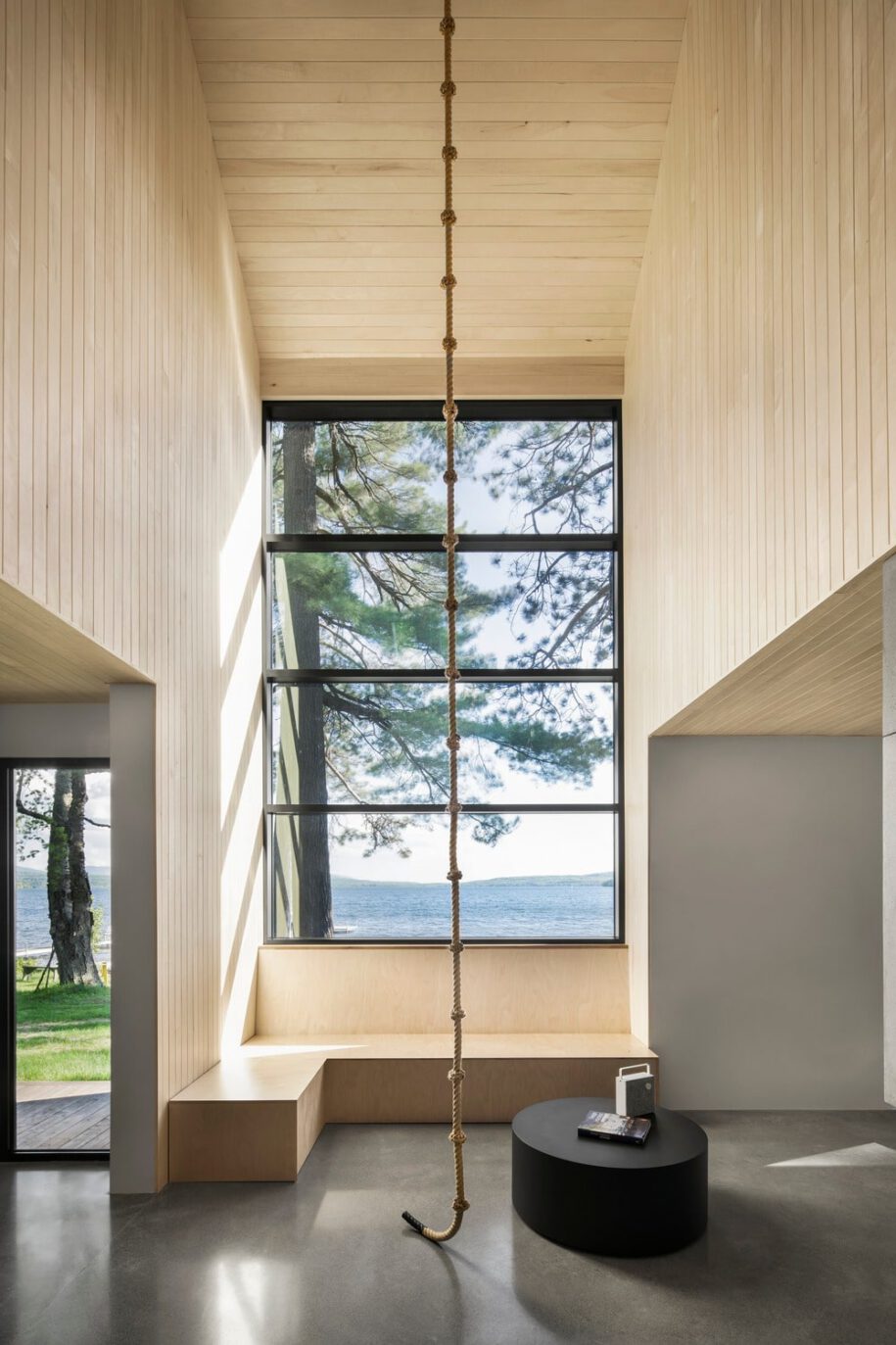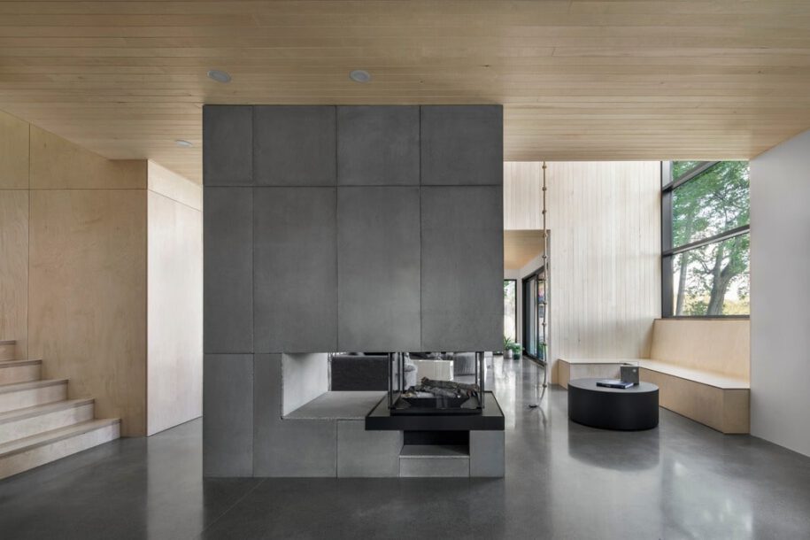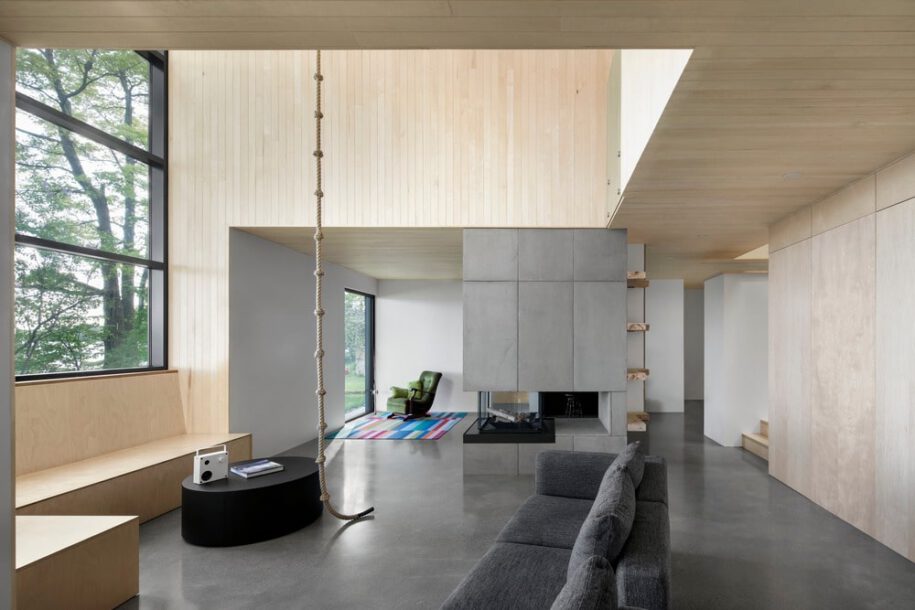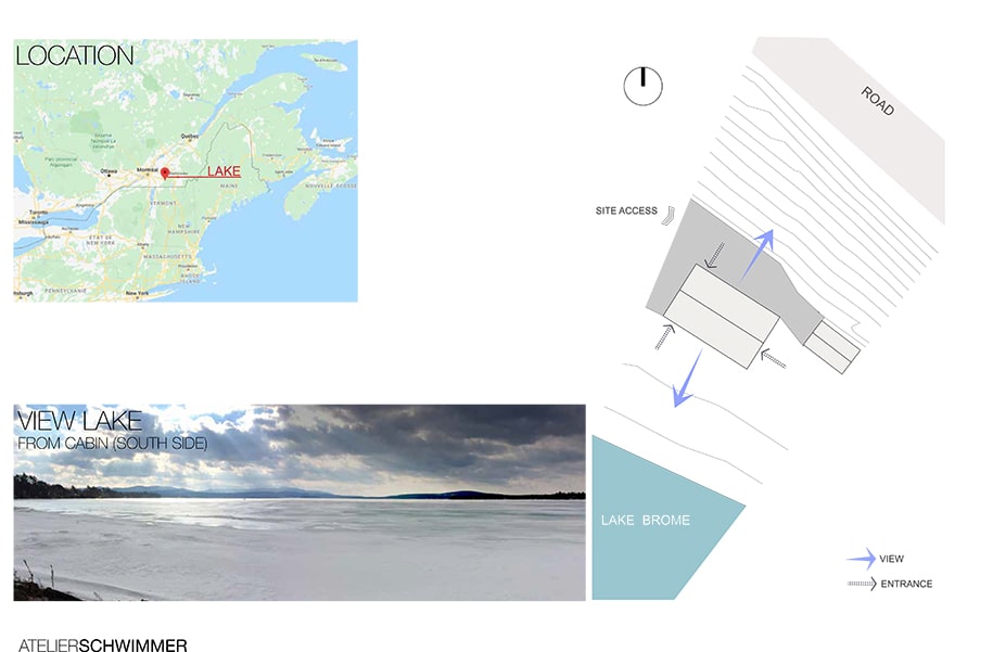 Two brothers have embraced outdoor activities as part of their fast-paced city life. A new building on the banks of Lake Brome, will act as a symbol of and a tool for the fulfillment of this commitment – a building in which to share time with friends. Bisected by a vertical atrium that opens on to the lake, the essence of the design is a concrete floor with a fireplace at its center that creates a place to mingle.