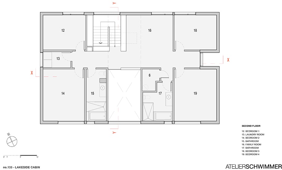 Located in the center of a concrete slab floor on the ground floor, it divides the open space into areas of various spatial qualities. On both sides of the canyon, glazed walls offer views on the outdoors. Traversing the canyon on the second floor is a bridge that creates more common space. Four bedrooms open onto the bridge. The exterior cladding is made of larch treated with two methods. Charred planks face directly the elements and natural oil protects the recessed less exposed planks. This play of dark and light increases the singular aspect of the house.