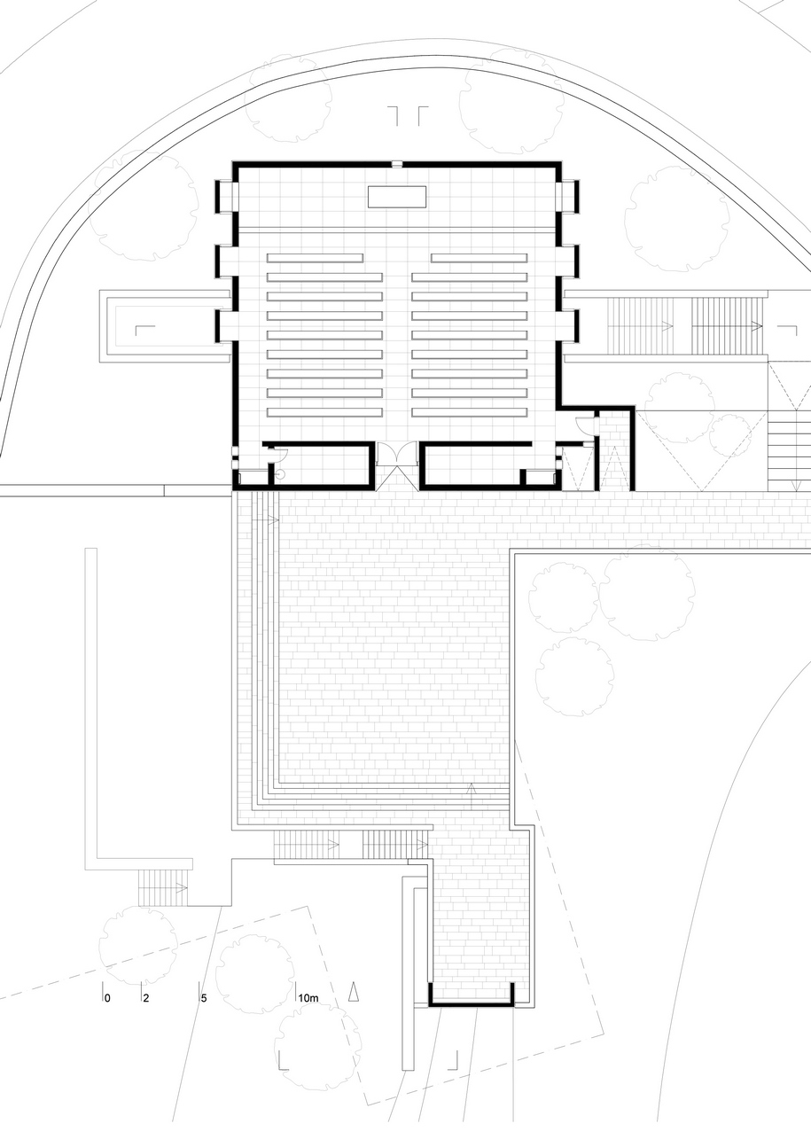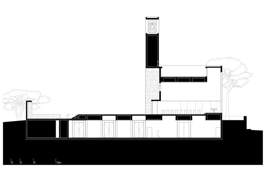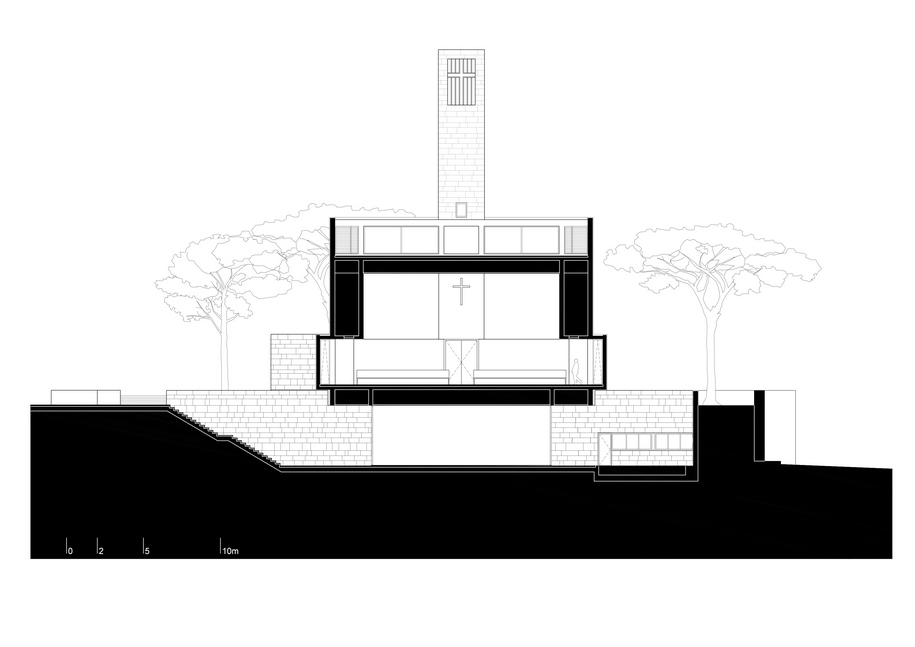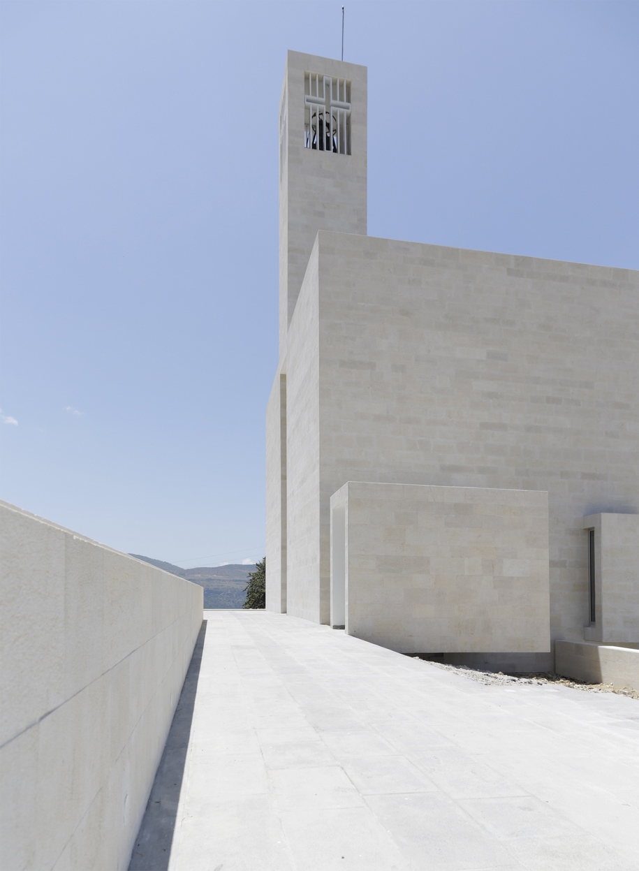It comprises the church and its square, all dressed in white, solemnly setting on a dry stone walled base, that remodels the topography of the hillside to house the multipurpose hall and its annexes.