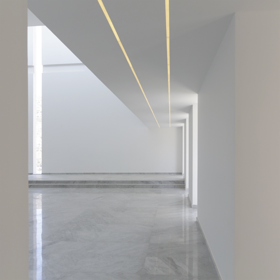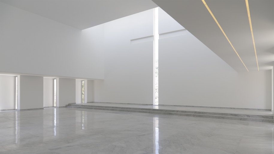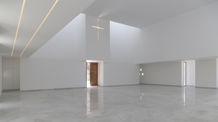 The interior is crafted and hierarchized by indirect lighting schemes that define its spiritual dimension: zenithal lighting above the altar, sacristy and confessional, parietal along the lateral circulations, and discreet at the back.