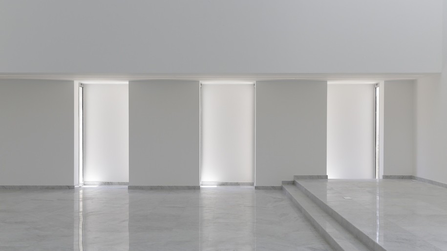 From the entrance we are drawn to an imposing slit that draws a cross; oriented north, it avoids any unwanted backlighting effect during mass. In this natural light box, white walls seem to diffuse light, the Carrara marble flooring, with its milky, profound and living appearance, reflecting it in turn.