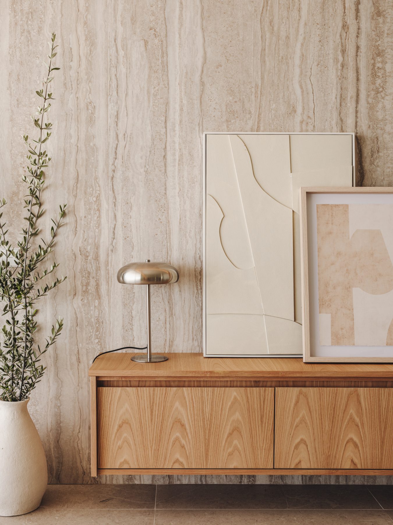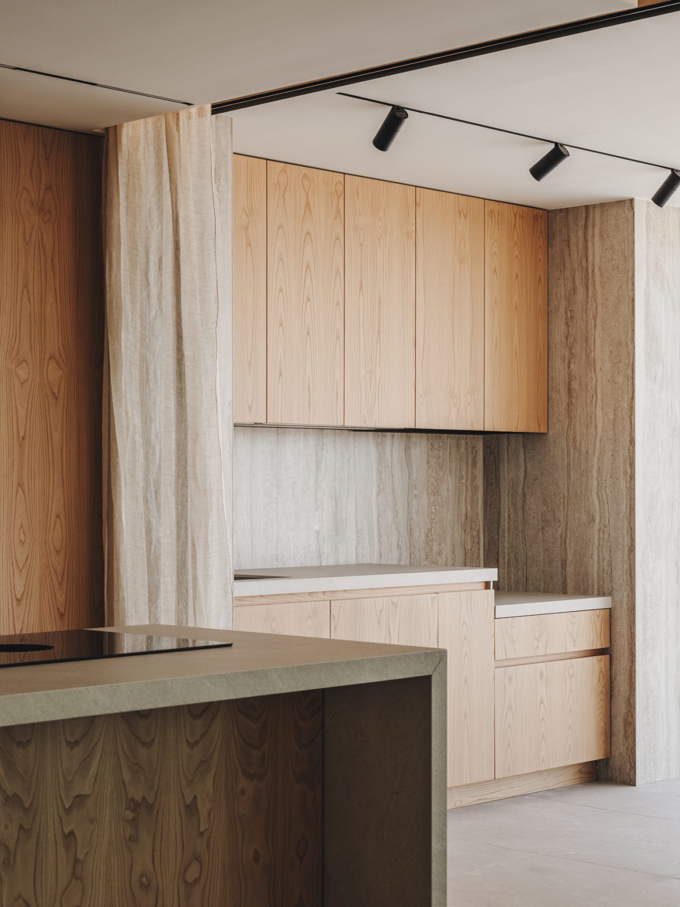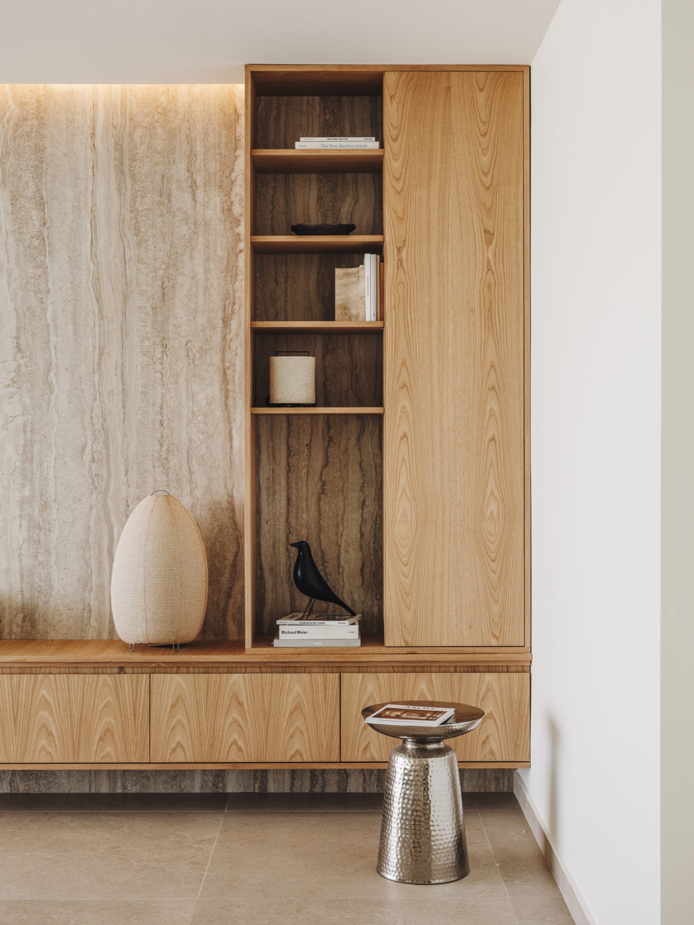Materiality forms the backbone of the project. Vertical surfaces clad in travertine create a dense, mineral reading of the space, while oak wood—used across custom millwork, wall cladding, and furniture—introduces warmth and tactile continuity.