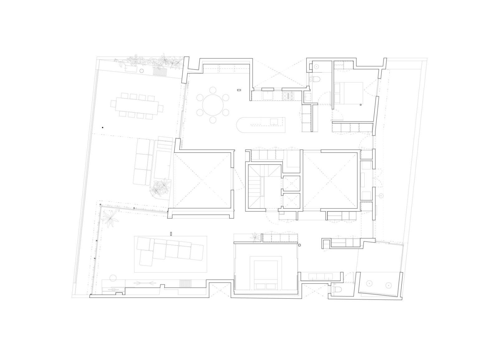 With 190 m² of interior space and nearly 100 m² of terraces at both ends, the apartment offered multiple possibilities for organization.