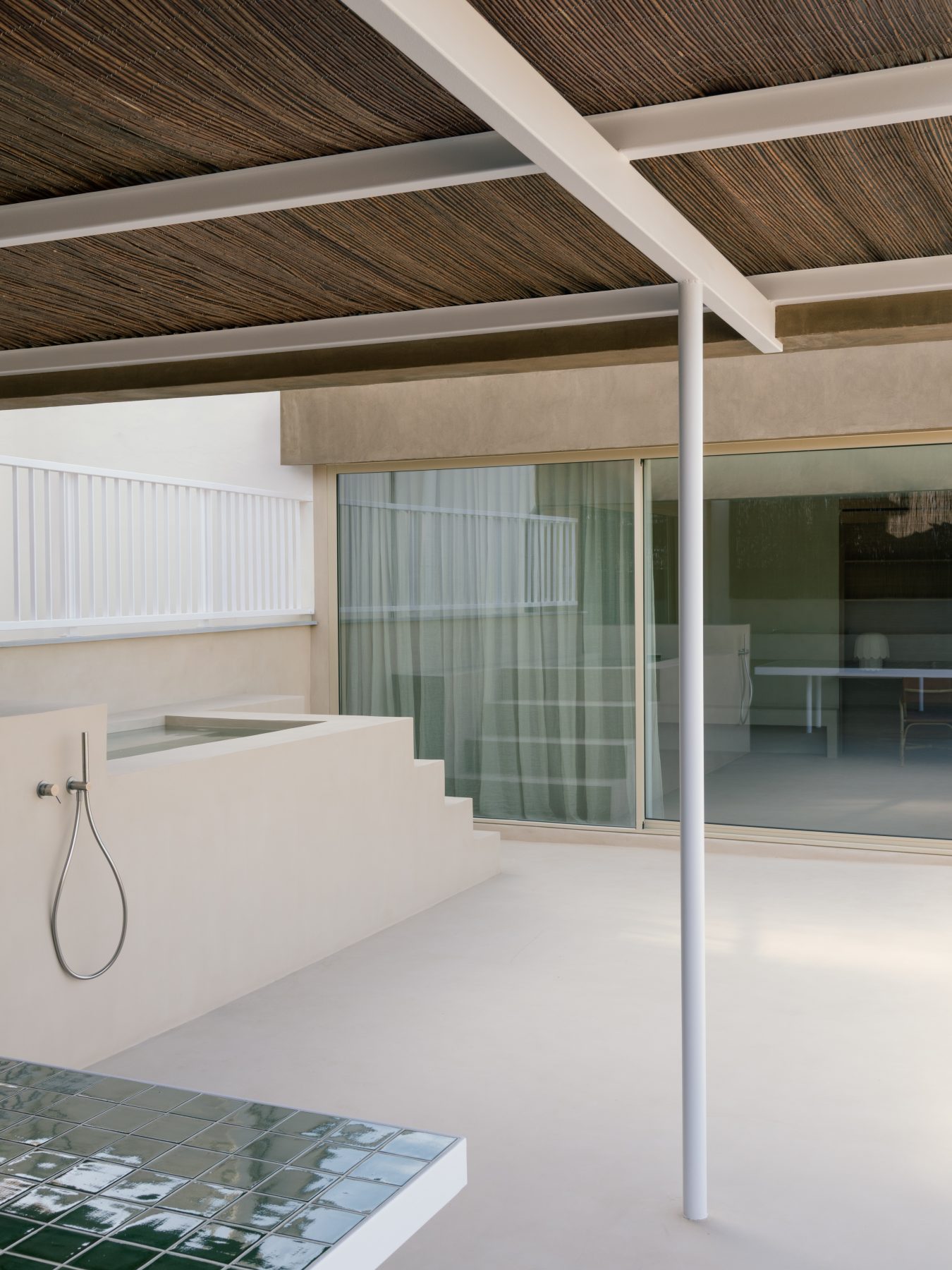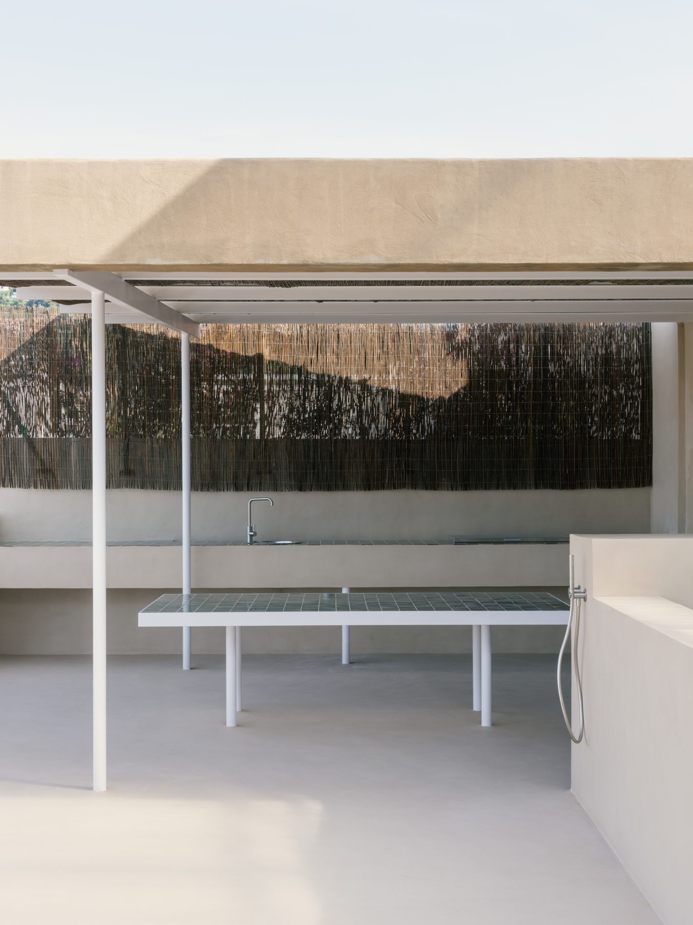 On the terrace, a pergola integrating solar panels provides shade for an outdoor kitchen and a large built-in table finished with local green tiles. A small pool completes the exterior space, reinforcing the Mediterranean spirit that anchors the project. Together, these elements define a domestic environment shaped by openness, collaboration, and continuity with the landscape.