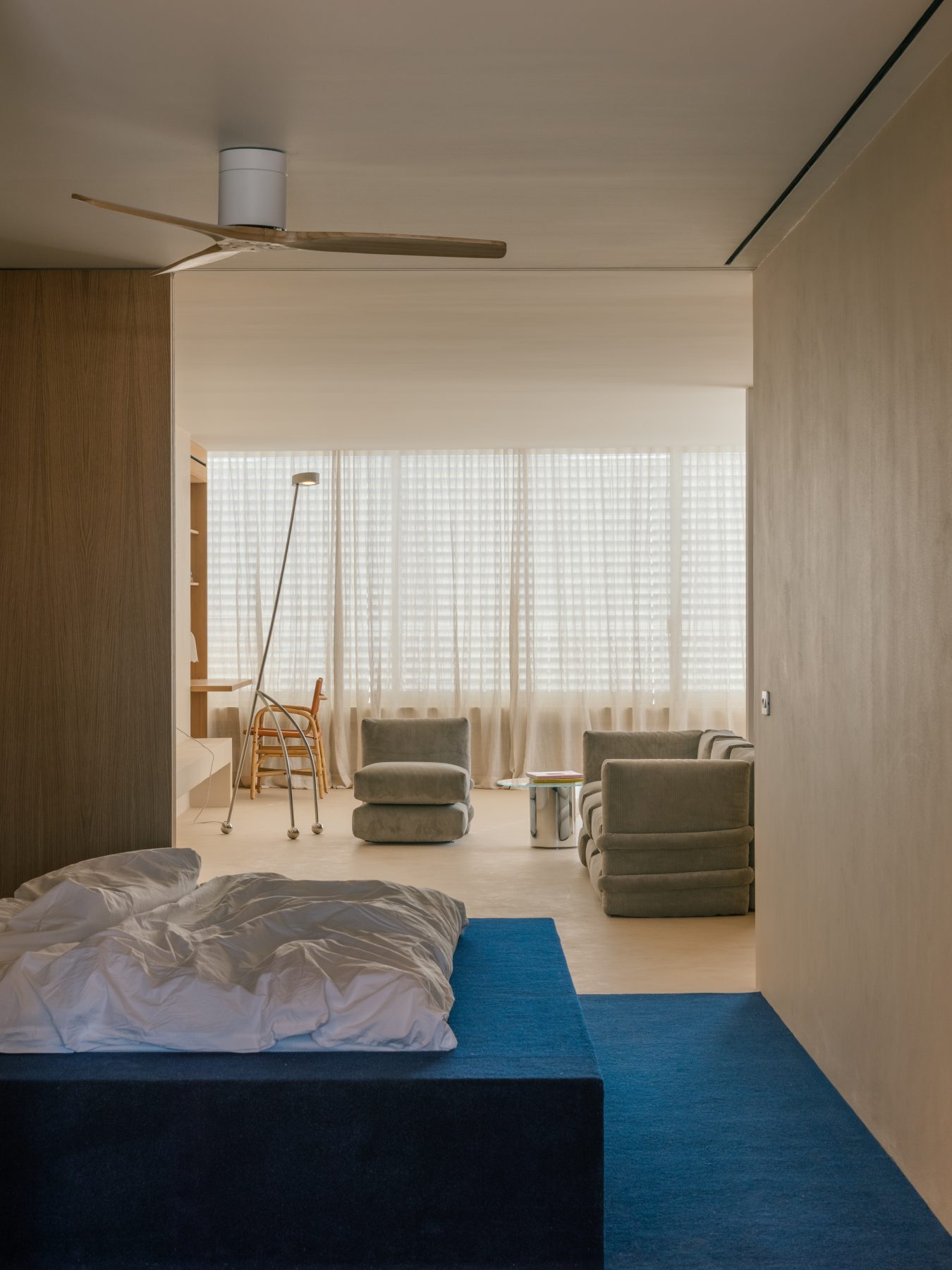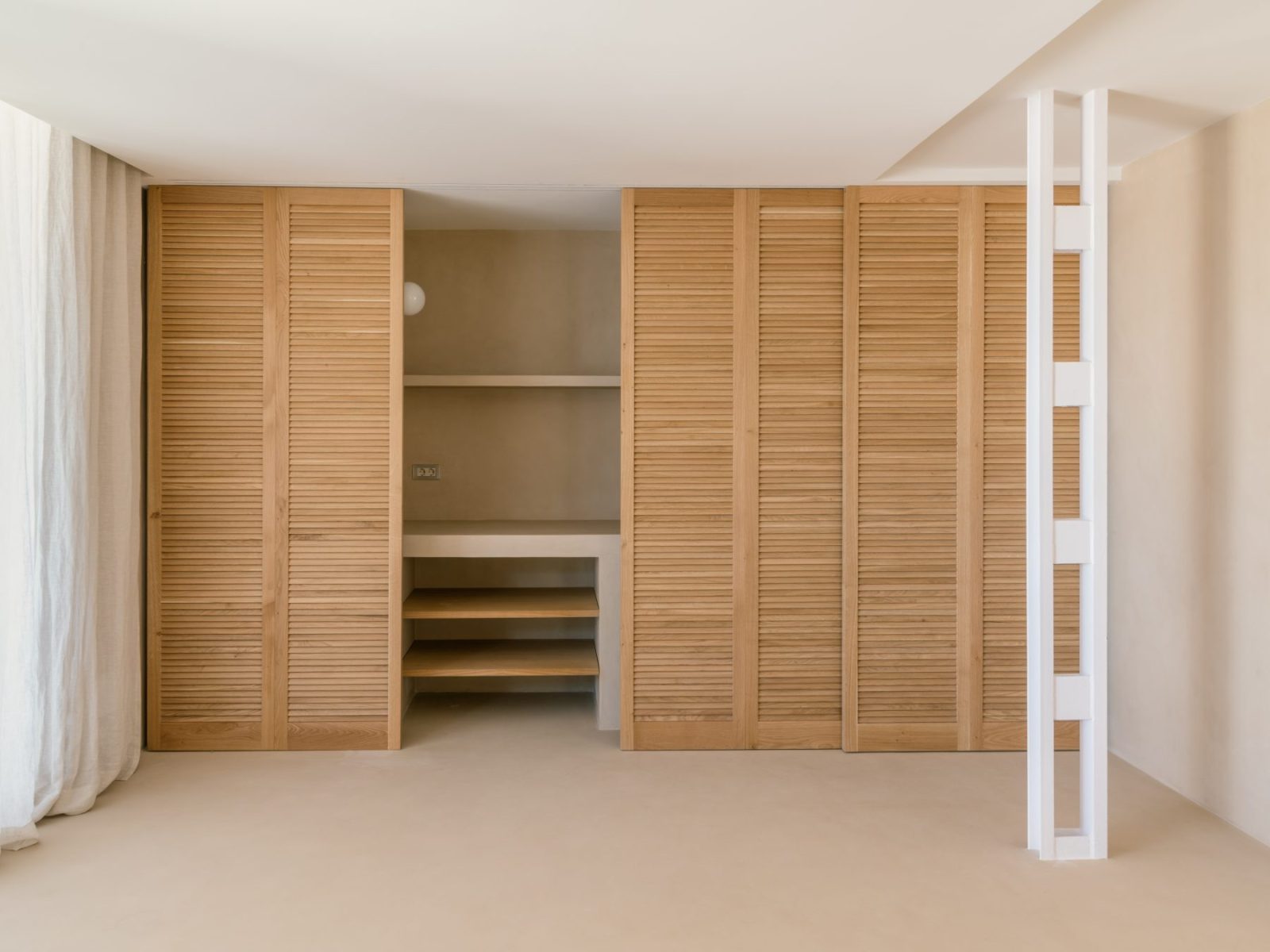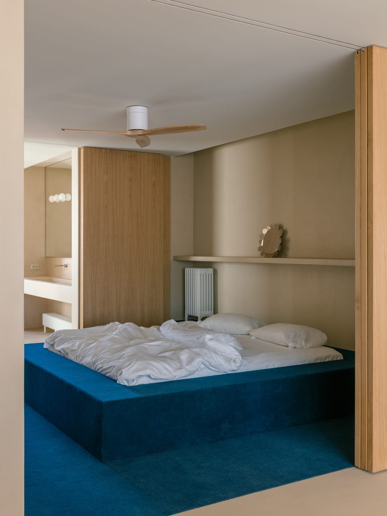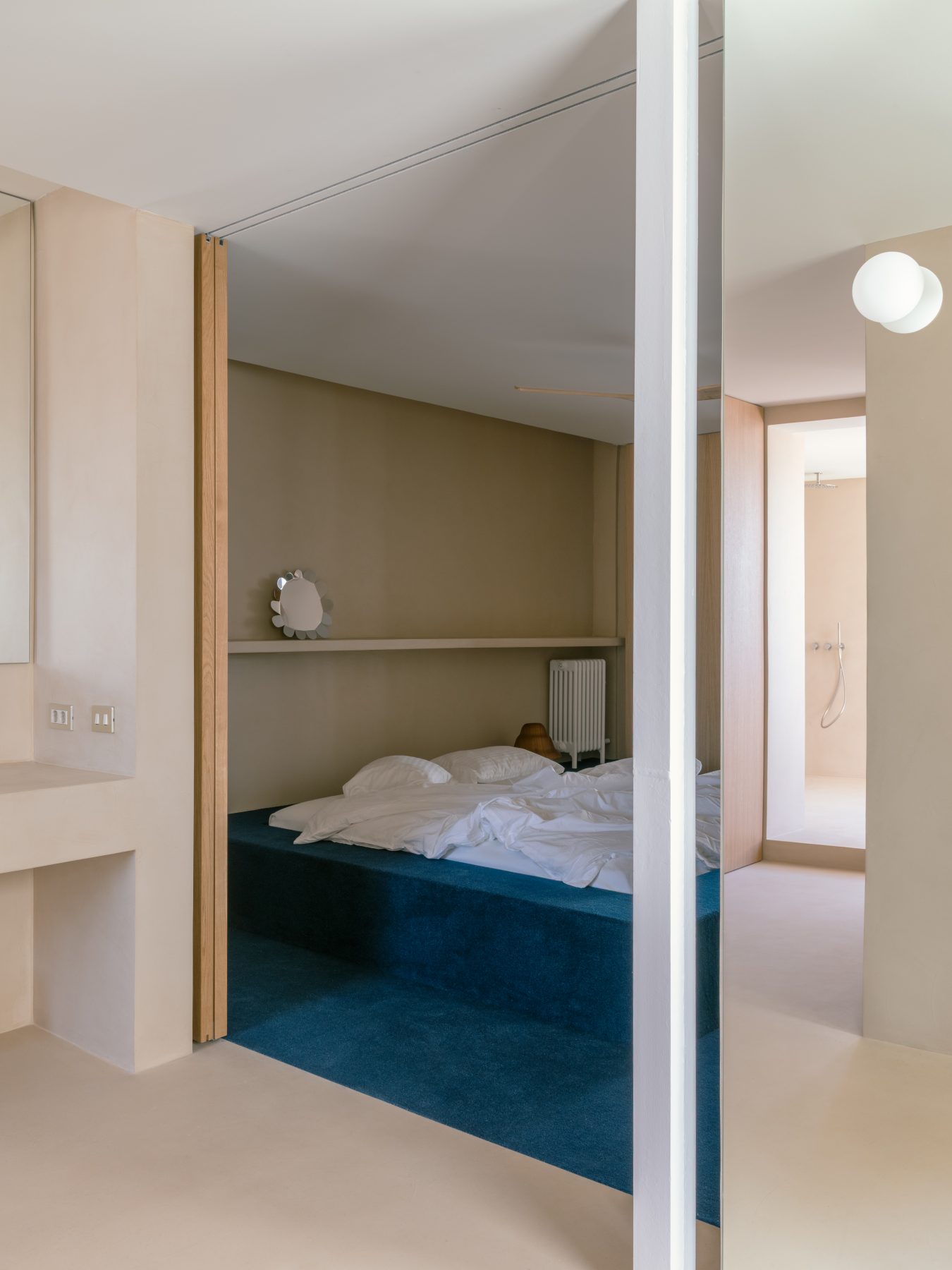 The plan is structured along a north–south axis. Bedrooms and bathrooms are positioned to the east, while the kitchen, dining area, and living room open toward the large west-facing terrace and the panoramic views. The main bedroom is conceived as a minimal and flexible unit, defined by sliding wooden panels at both ends that allow it to connect either to the living space or to the bathroom and dressing area, which together form a continuous open environment.