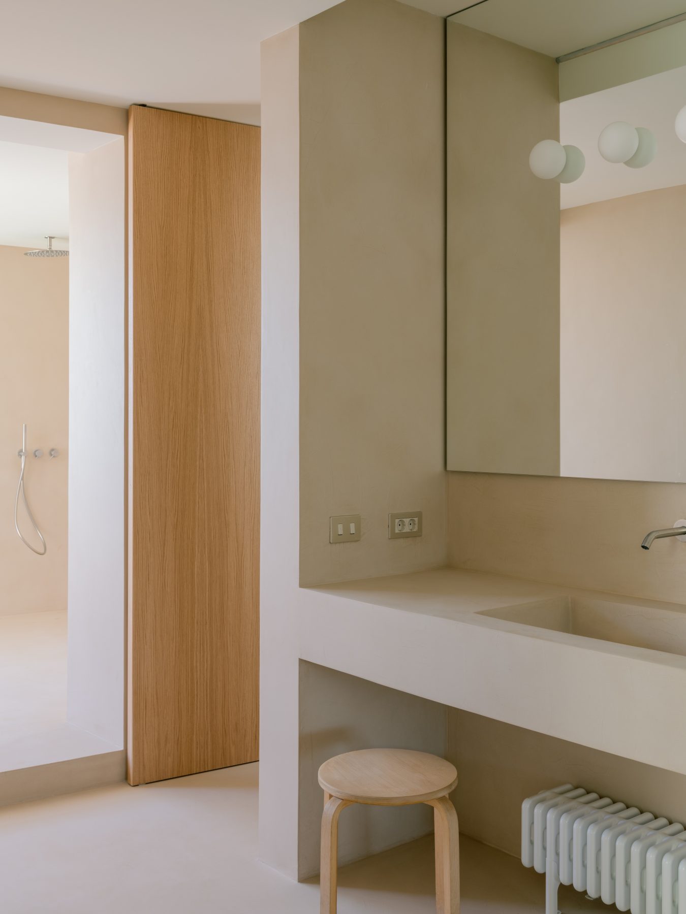 Kitchen and living room communicate across a central open space through large floor-to-ceiling openings. Material continuity reinforces this spatial flow, with warm and tactile finishes repeated inside and outside to create a coherent atmosphere.