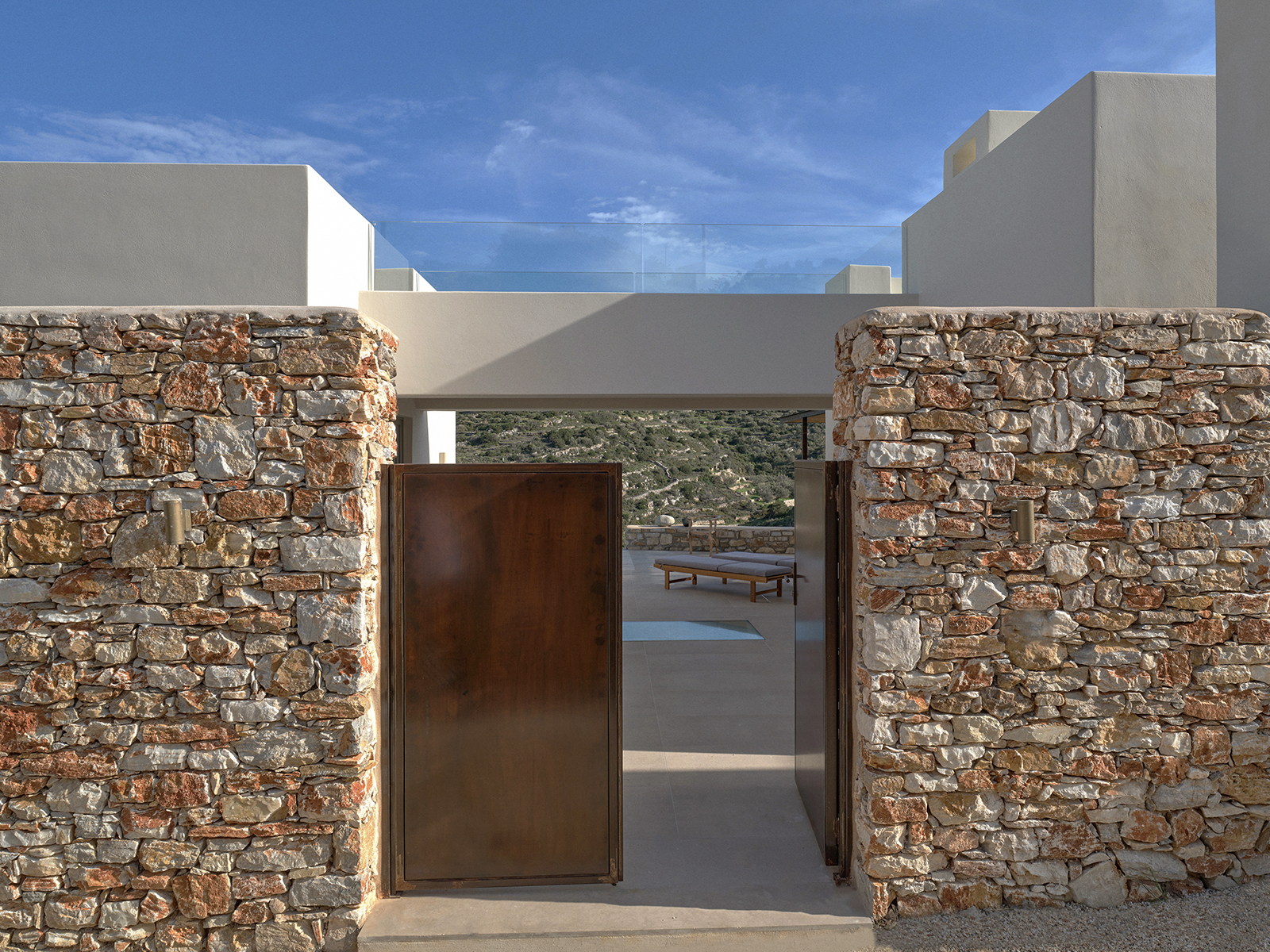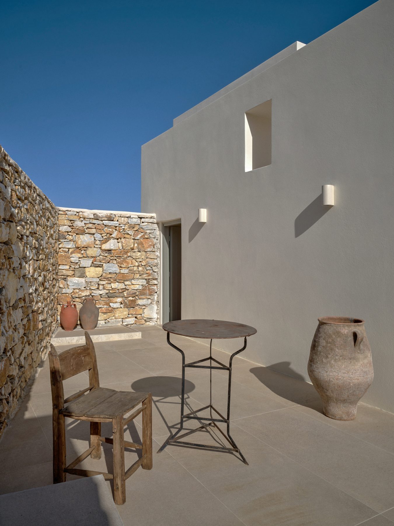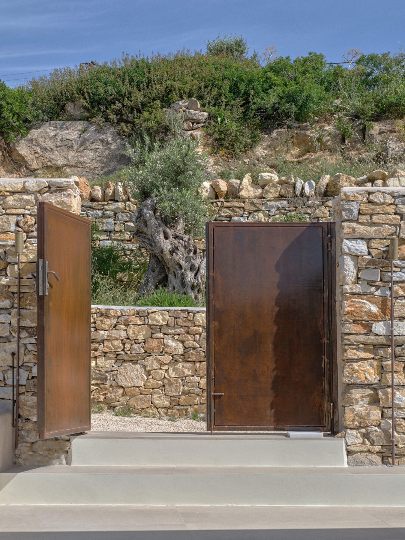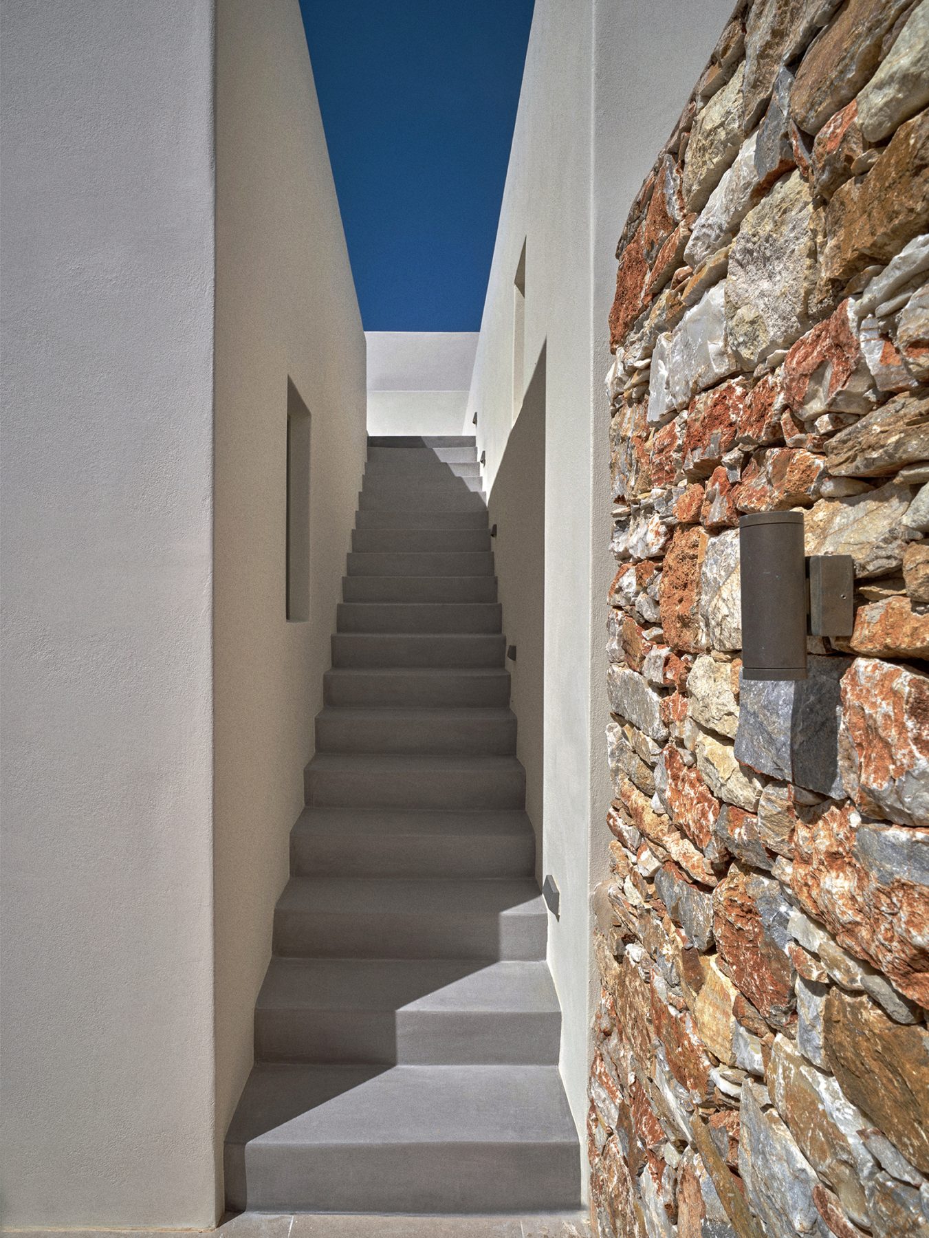 Inspired by Cycladic traditional architecture—namely, the use of natural materials, small openings for doors and windows, 60 cm-thick stone walls, polished cement screed for bathrooms and staircases, and custom-made wooden, metal, and stone constructions—but also incorporating modern elements (such as exposed concrete ceilings, thermally insulated windows and doors, stainless steel taps and sinks, designer furniture, and infinity pools), Pezoules House combines a contemporary architectural design with the refined simplicity of traditional building techniques and the wisdom of local craftsmanship.