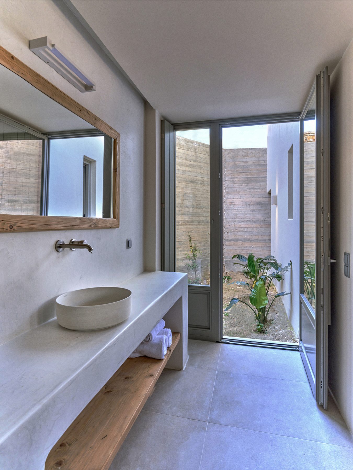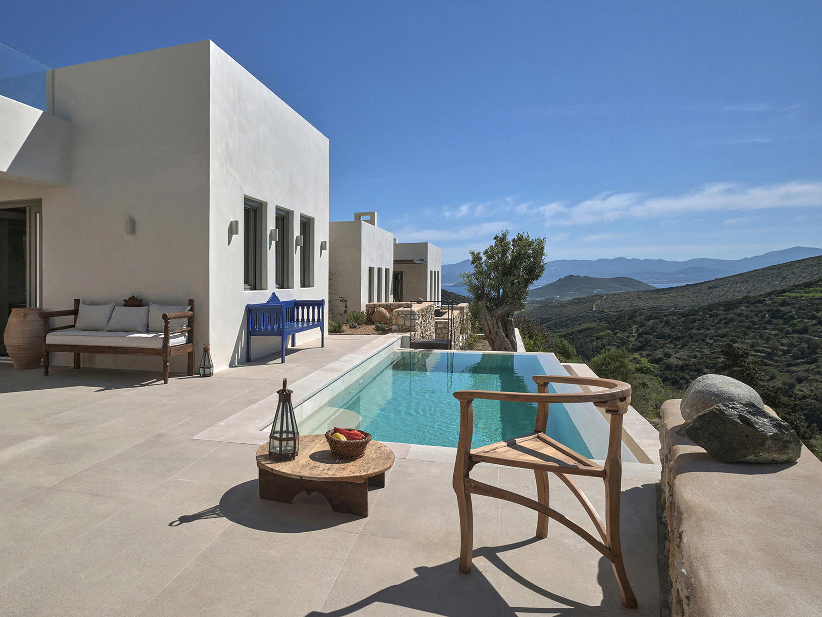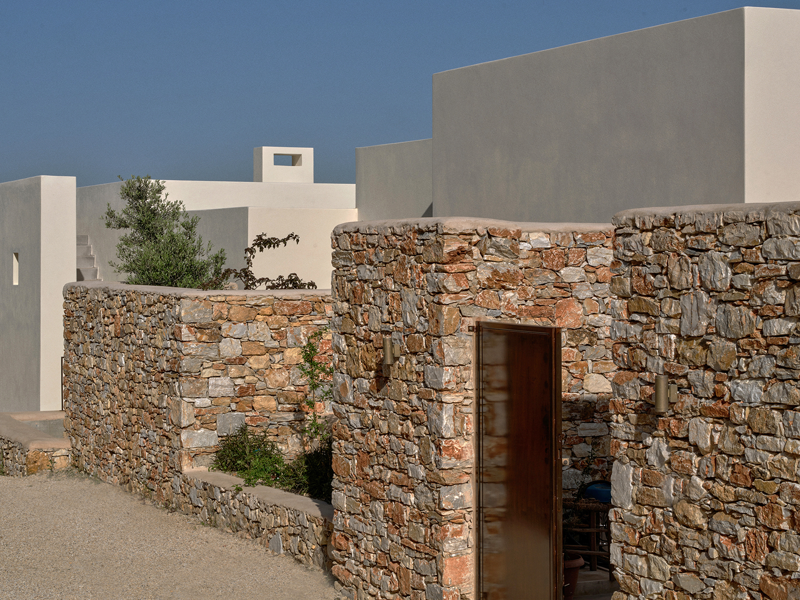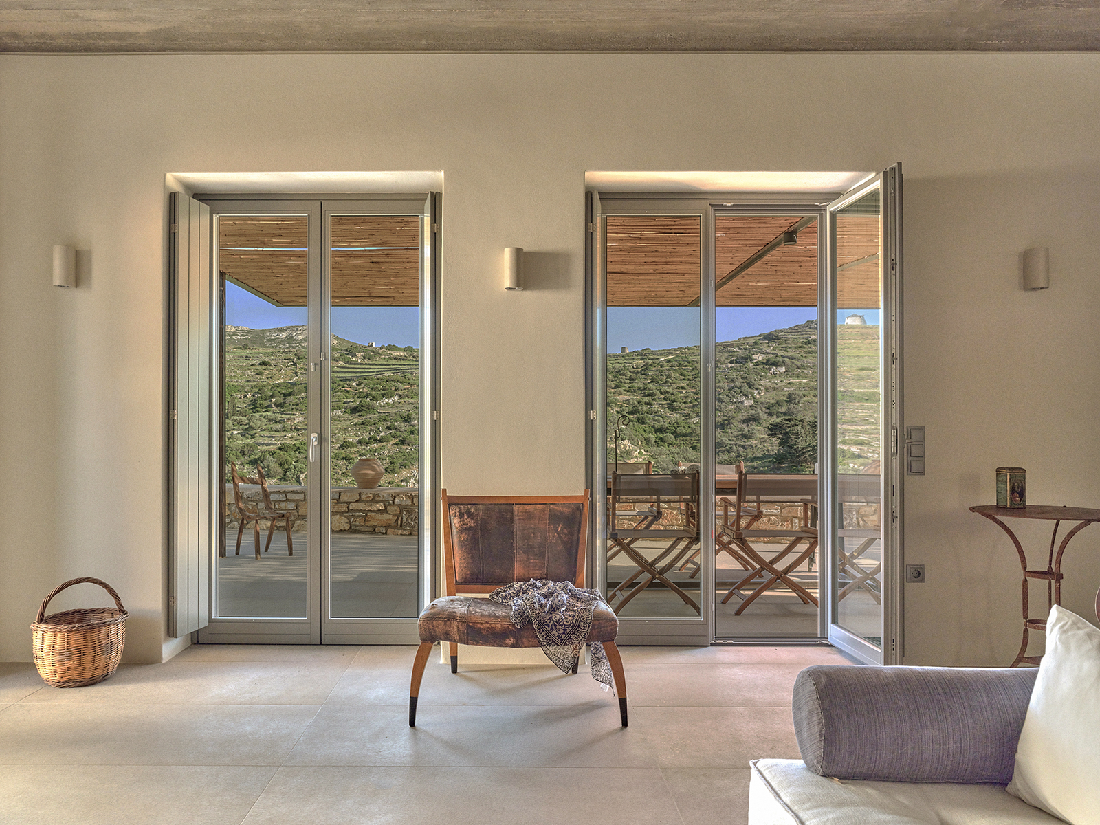 Inspired by Cycladic traditional architecture—namely, the use of natural materials, small openings for doors and windows, 60 cm-thick stone walls, polished cement screed for bathrooms and staircases, and custom-made wooden, metal, and stone constructions—but also incorporating modern elements (such as exposed concrete ceilings, thermally insulated windows and doors, stainless steel taps and sinks, designer furniture, and infinity pools), Pezoules House combines a contemporary architectural design with the refined simplicity of traditional building techniques and the wisdom of local craftsmanship.