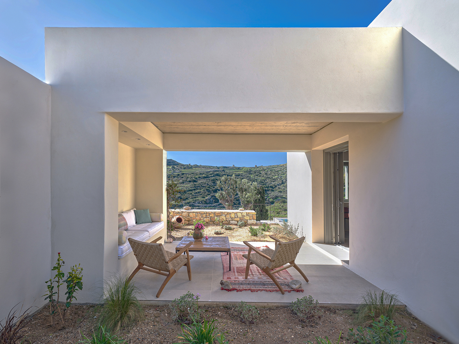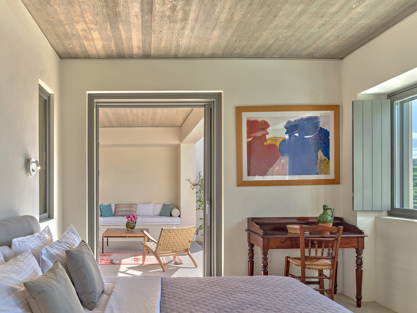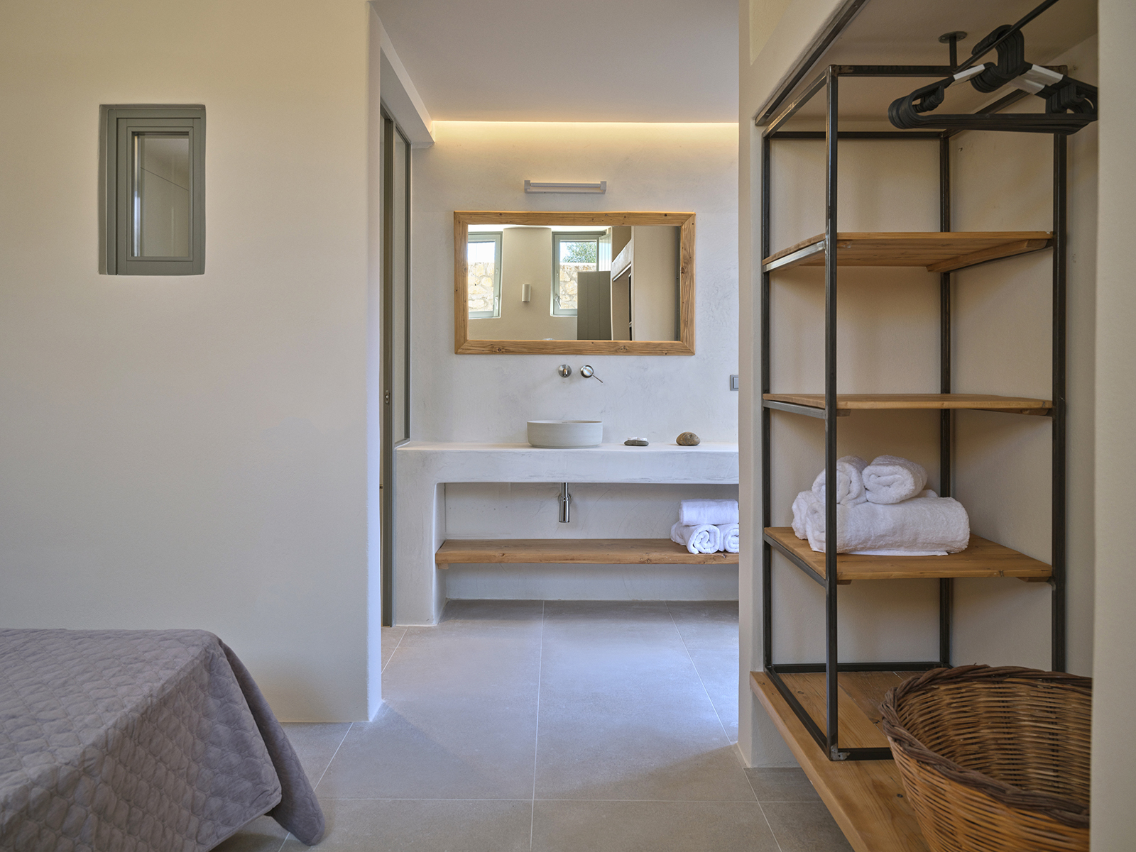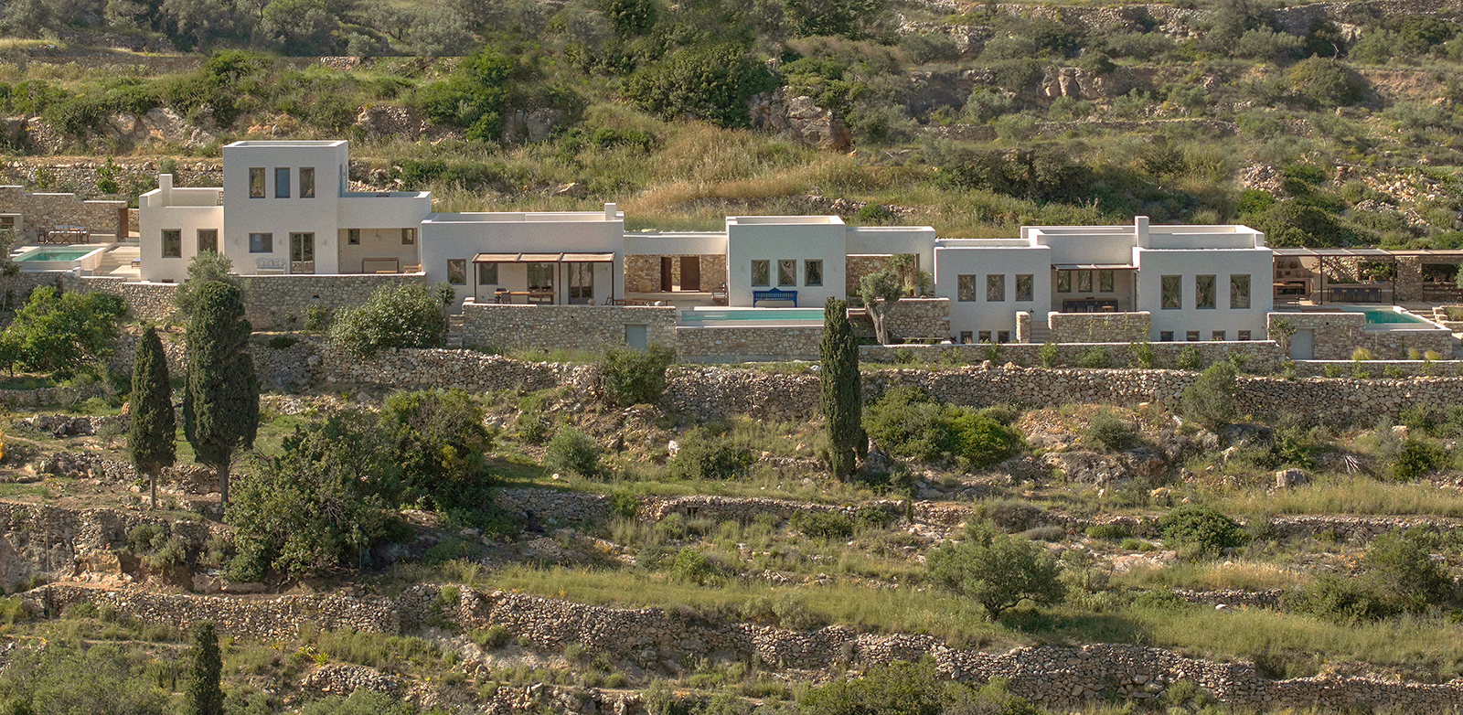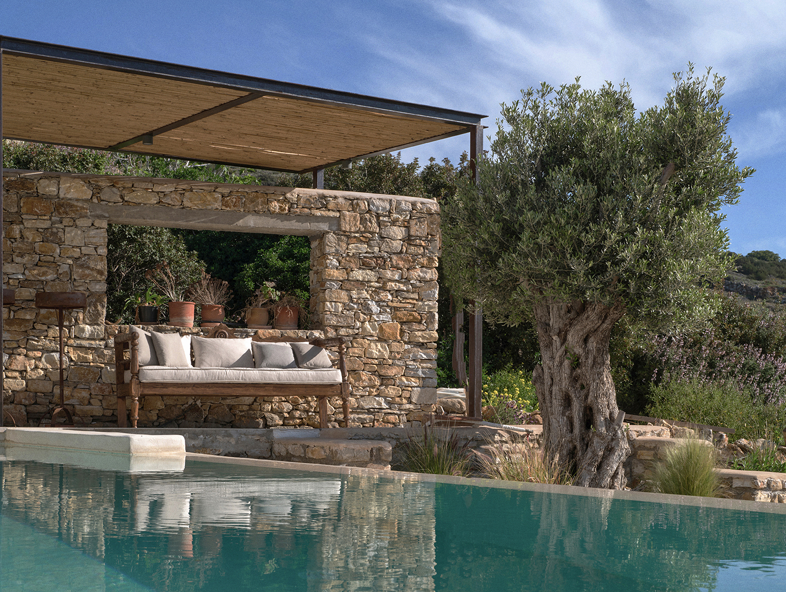 Inspired by Cycladic traditional architecture—namely, the use of natural materials, small openings for doors and windows, 60 cm-thick stone walls, polished cement screed for bathrooms and staircases, and custom-made wooden, metal, and stone constructions—but also incorporating modern elements (such as exposed concrete ceilings, thermally insulated windows and doors, stainless steel taps and sinks, designer furniture, and infinity pools), Pezoules House combines a contemporary architectural design with the refined simplicity of traditional building techniques and the wisdom of local craftsmanship.