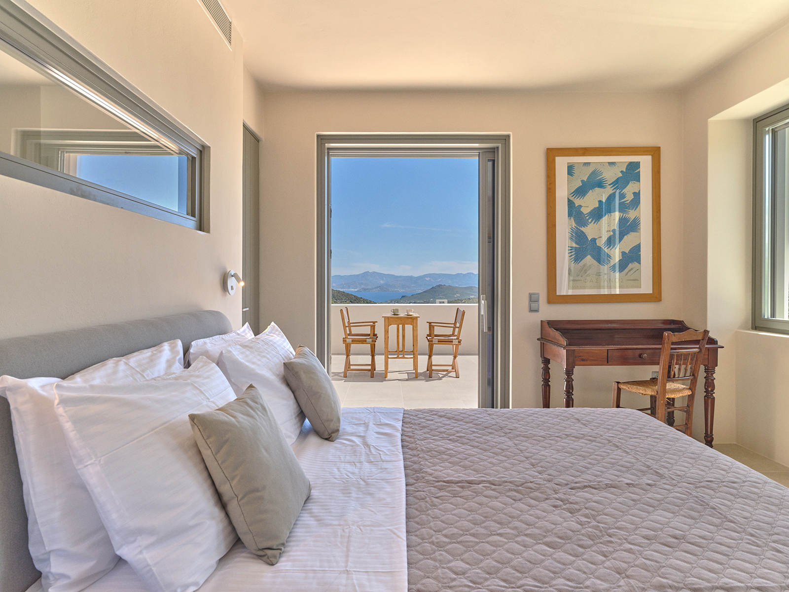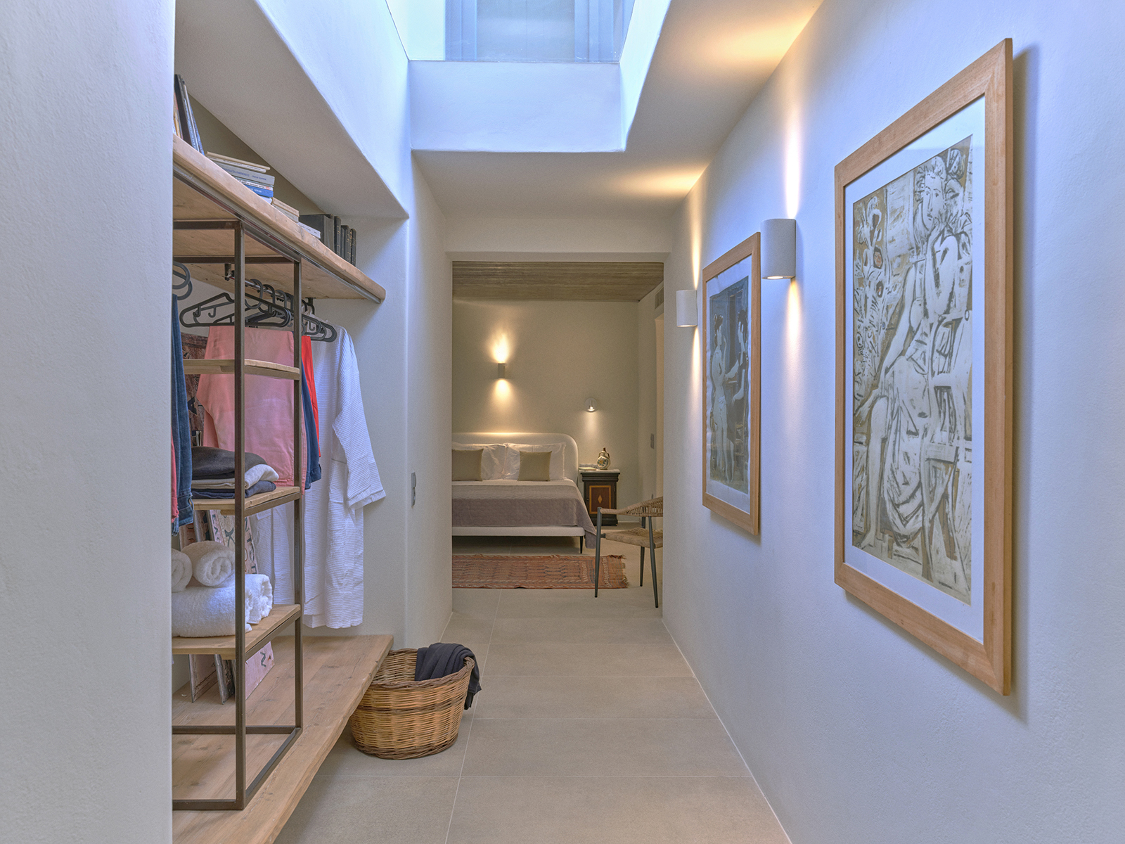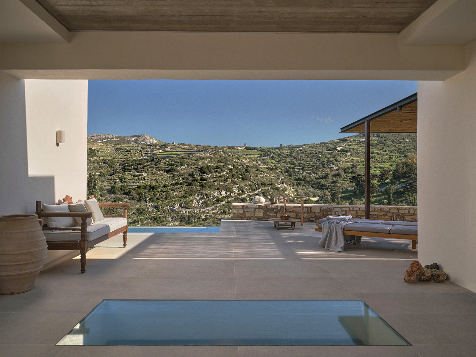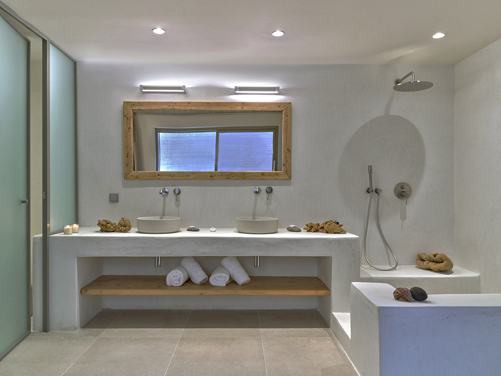 Inspired by Cycladic traditional architecture—namely, the use of natural materials, small openings for doors and windows, 60 cm-thick stone walls, polished cement screed for bathrooms and staircases, and custom-made wooden, metal, and stone constructions—but also incorporating modern elements (such as exposed concrete ceilings, thermally insulated windows and doors, stainless steel taps and sinks, designer furniture, and infinity pools), Pezoules House combines a contemporary architectural design with the refined simplicity of traditional building techniques and the wisdom of local craftsmanship.
