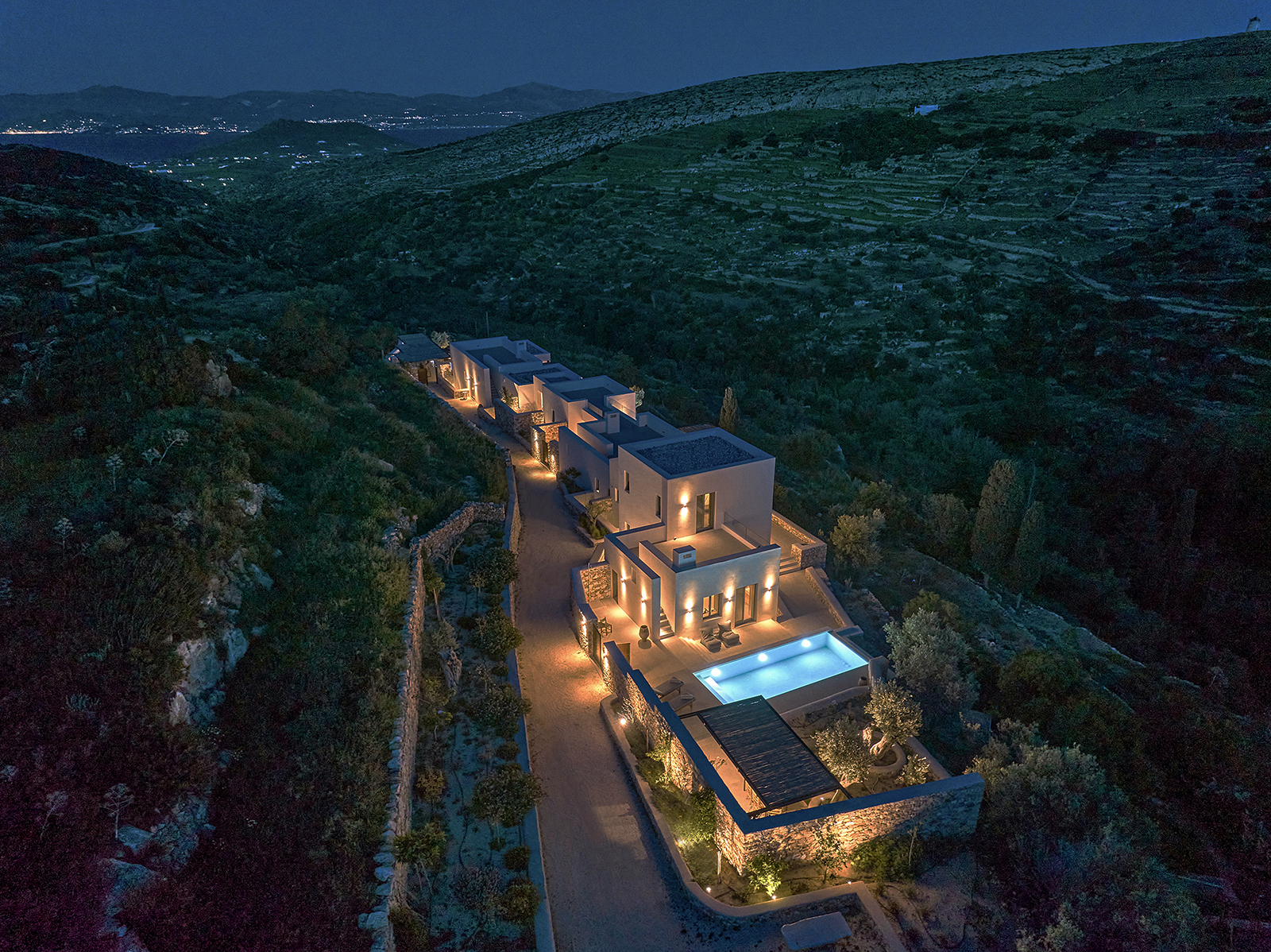 Pezoules House is a complex of three houses located in Lefkes, the most traditional village on Paros Island. The name of the complex derives from its location, as it sits along a pair of terraces (pezoules), and also because it lies opposite the best-preserved terraces on the island. Pezoules are the small terraces of arable land on the slopes of the Cycladic mountains, supported with dry-stone walls built without mortar, with stones skilfully stacked.