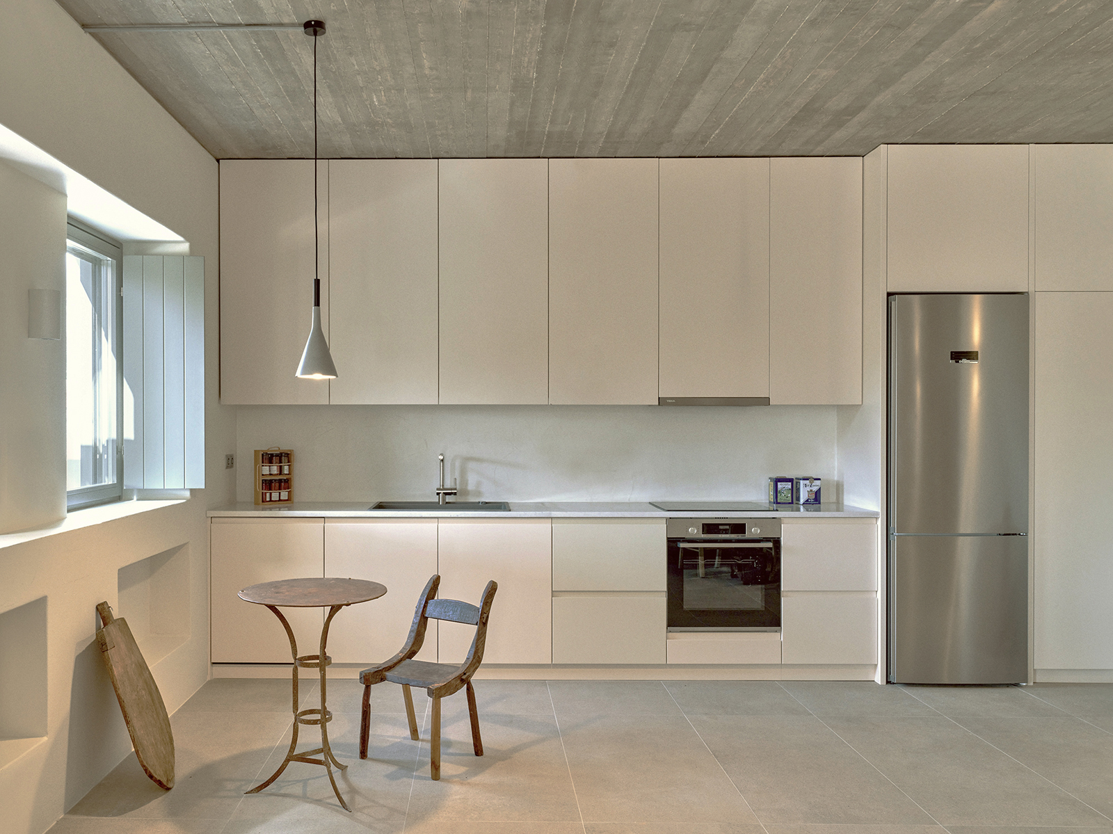 The house masonry is rendered with plaster, while all outdoor architectural elements are constructed using exposed stone sourced exclusively from the site—reinforcing the architectural intention of contextual integration with the landscape. Along the plot’s perimeter, existing dry-stone walls were preserved and structurally reinforced; where absent, new dry-stone walls were constructed using only on-site stone, maintaining material continuity and accentuating the project’s commitment to vernacular integrity.