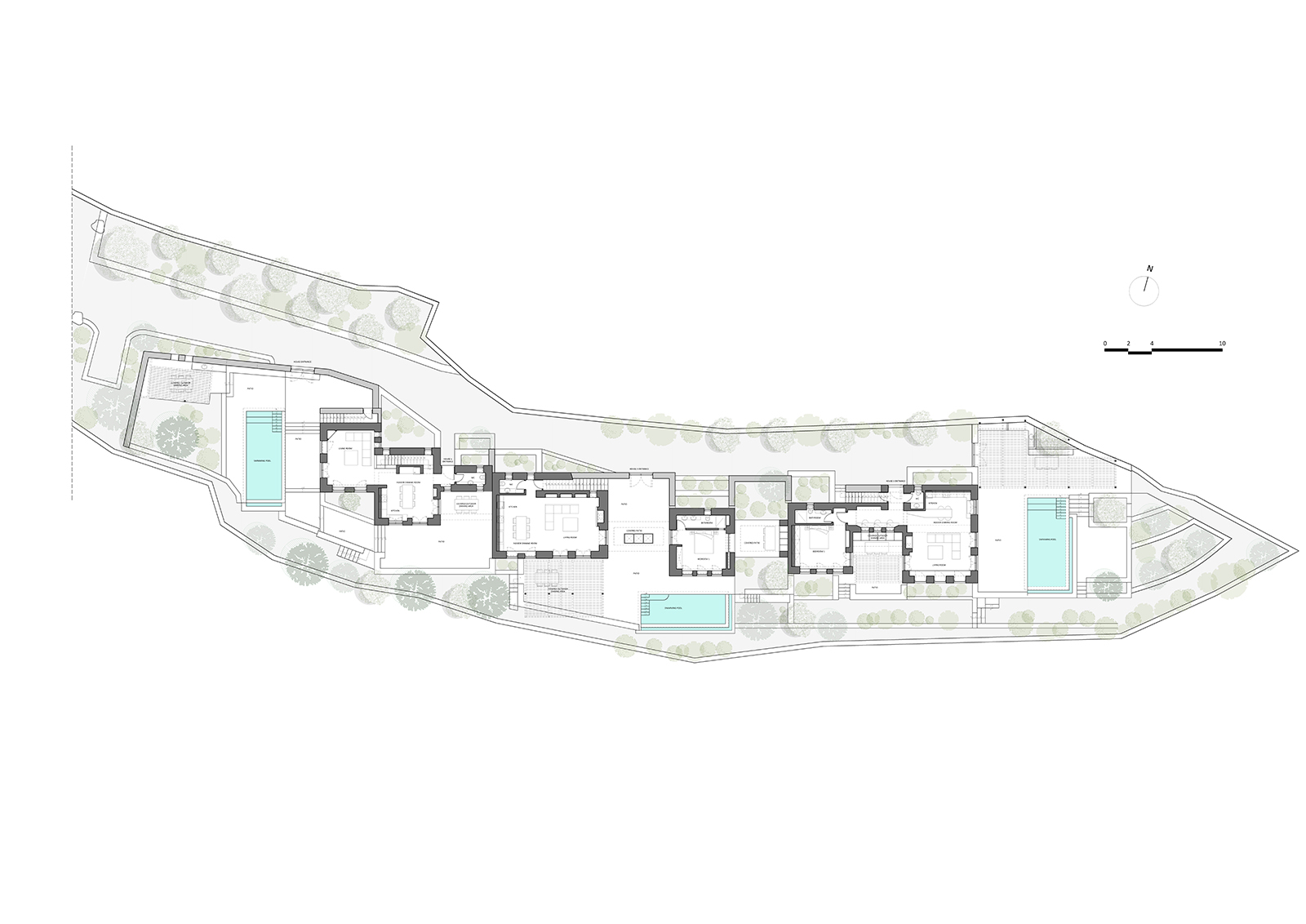 Pezoules House consists of three independent residences, each articulated across two or three levels. The ground floor accommodates living areas, dining spaces, and semi-outdoor seating areas integrated into the main volume. All bedrooms with en-suite bathrooms are strategically distributed to offer spatial separation from the communal zones. The exterior spaces have been designed to ensure minimal intervention in the natural terrain, achieved through the placement of building volumes around preexisting old olive trees.