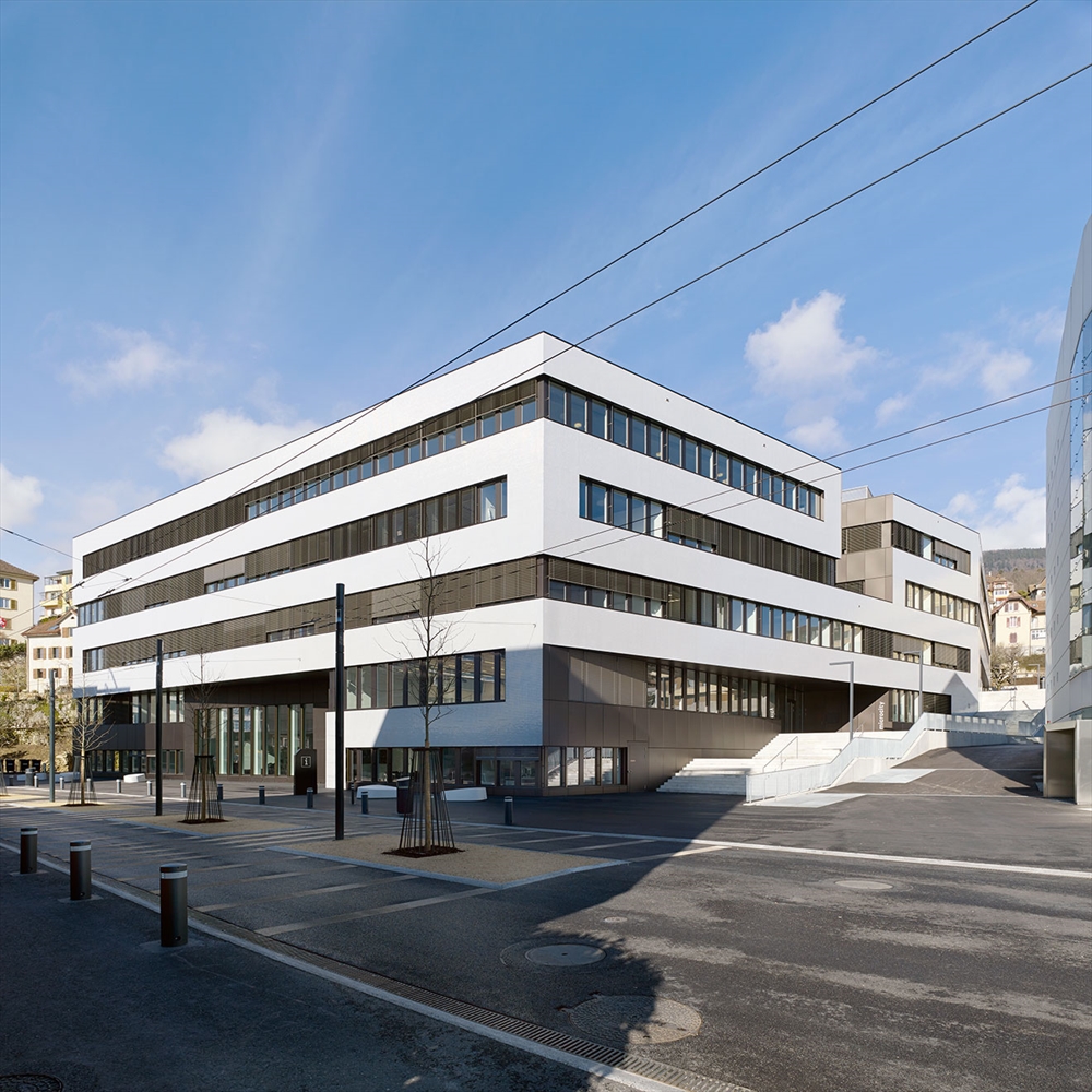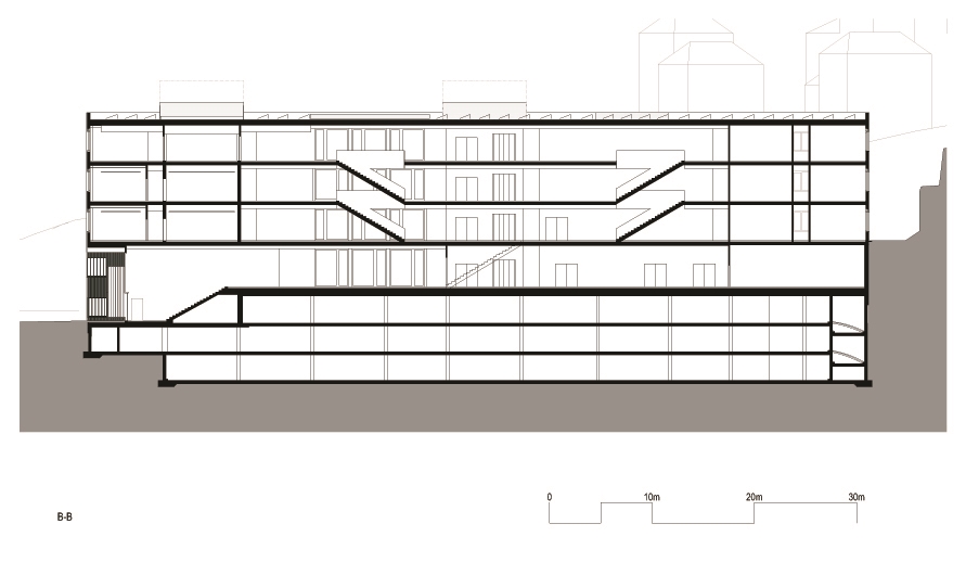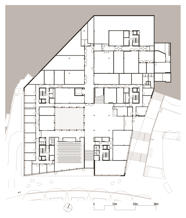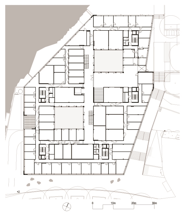 The interplay with the compact nature of the proposed building and the creation of new exterior spaces allows the topography of the terrain to accommodate a dialogue that is “tailored” for the location. The park with exclusively native plant species and a retention basin for rainwater creates connections with the neighbouring quarter and turns it into prestigious area of the new campus. The wall of cliffs to the north is also comprehensively greened to create a richcontrast between the green areas and the building.