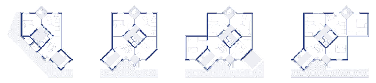 Each residence is designed to de-hierarchize living spaces, eliminating a main central area or a predefined space for a dominant figure.