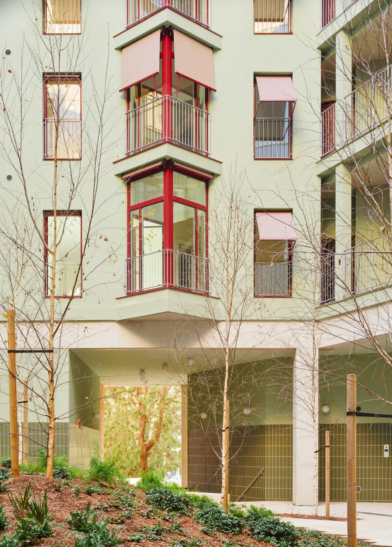 Approaching from the street, residents enter a spacious green courtyard — a climate refuge where neighbors share leisure and care.