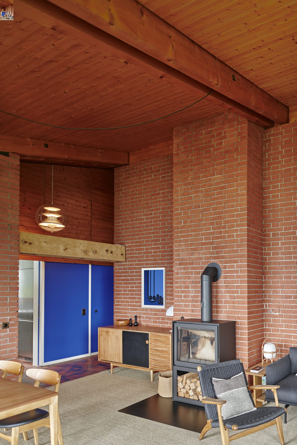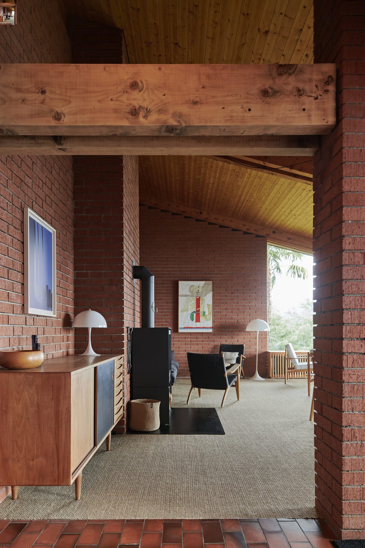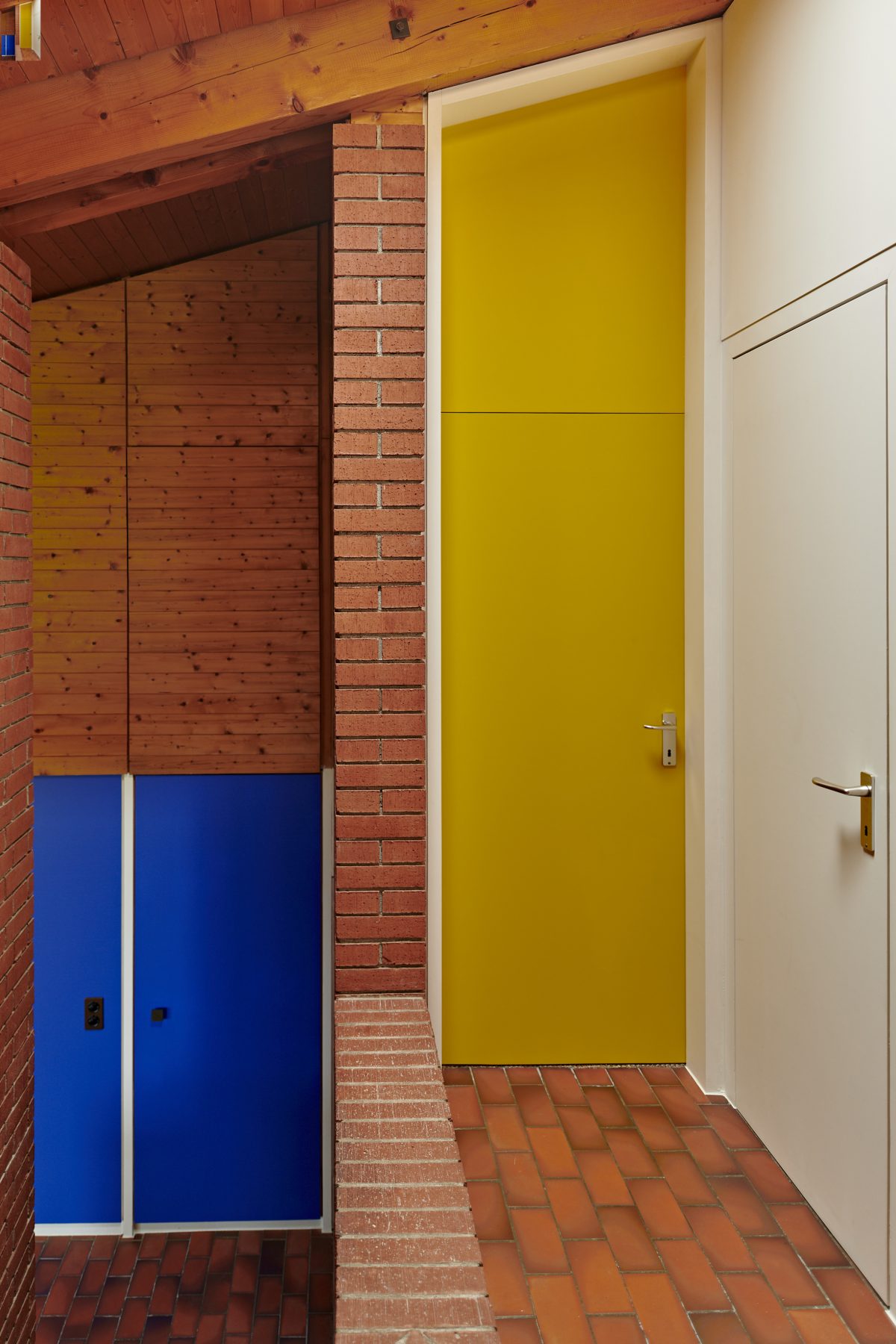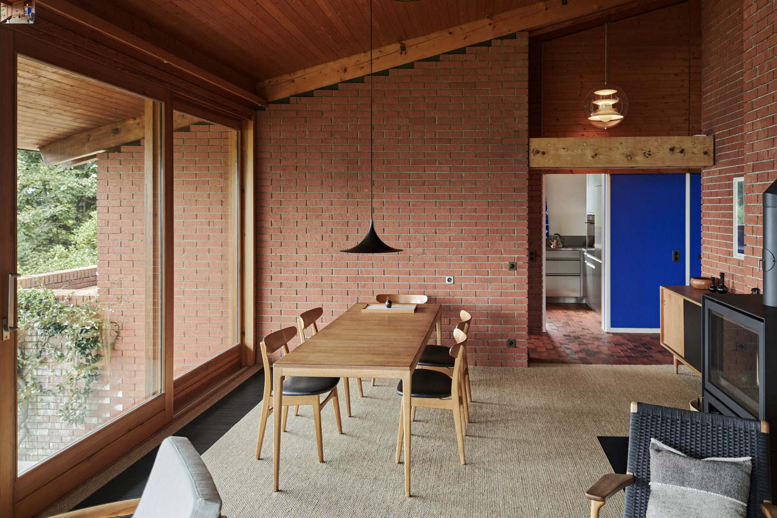 Characterised by exposed brickwork, a load-bearing wooden structure and an asymmetrical gable roof, the house expresses a distinctly modern domestic language rooted in material honesty and spatial clarity.