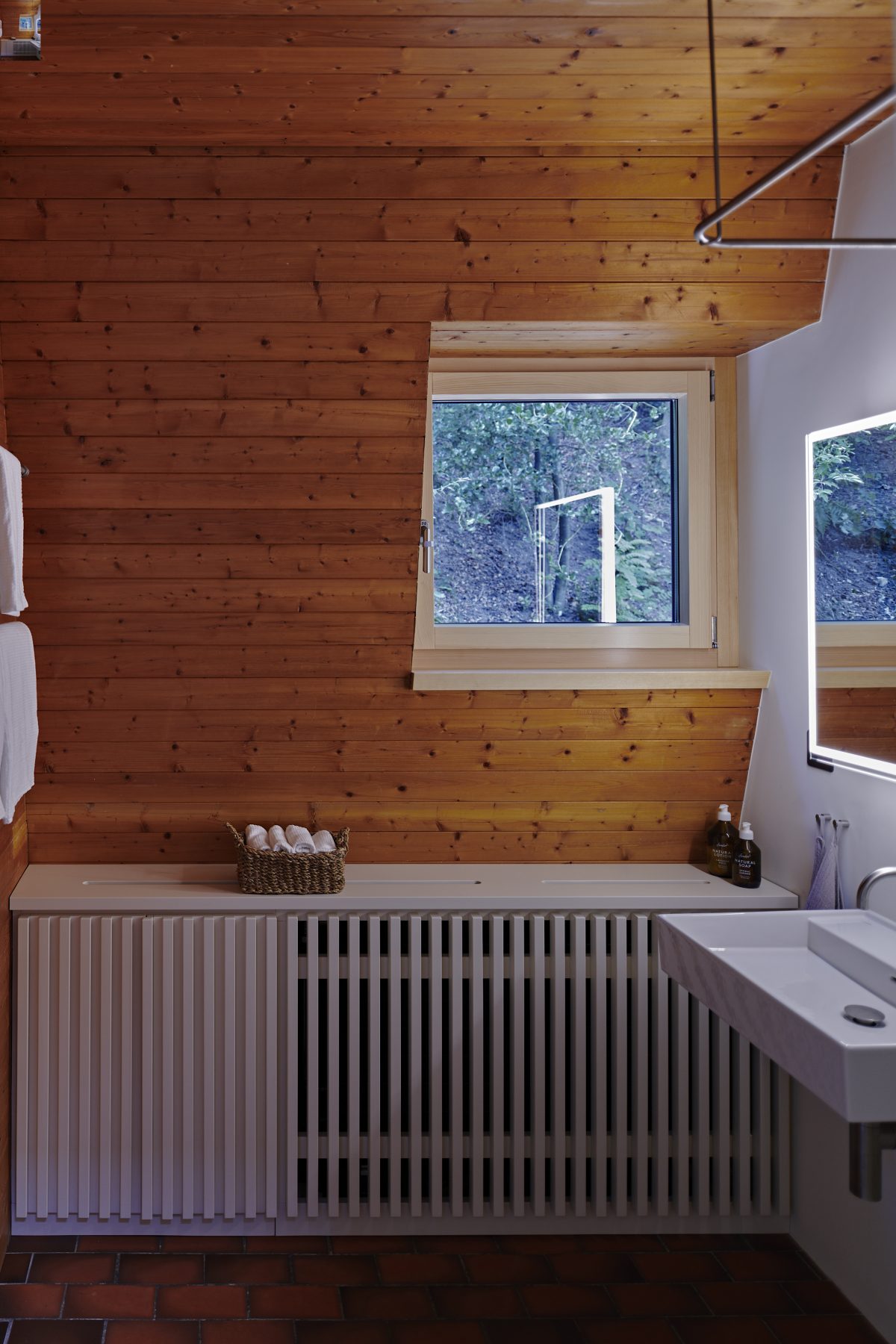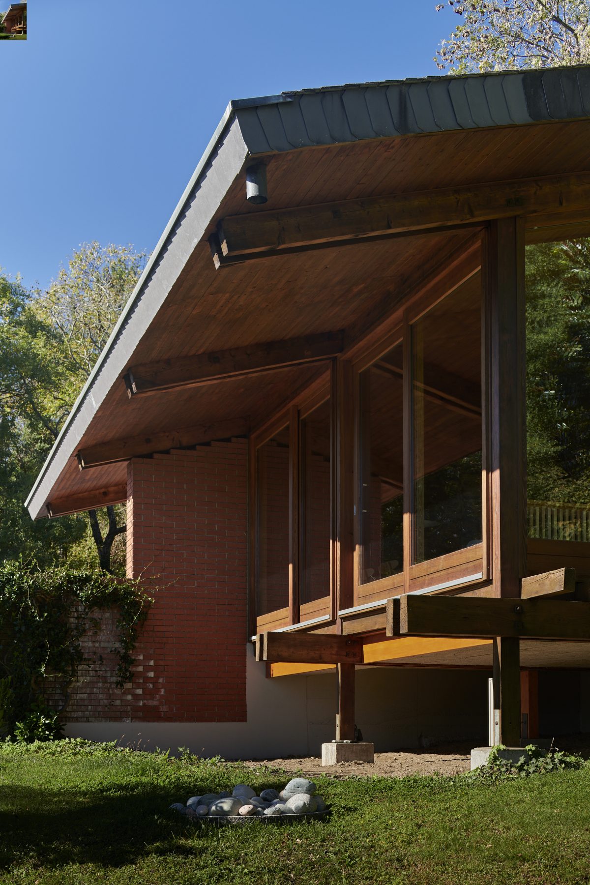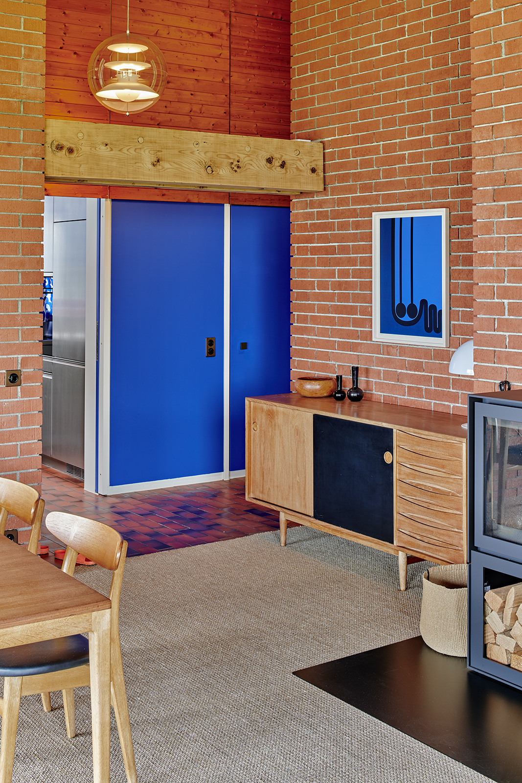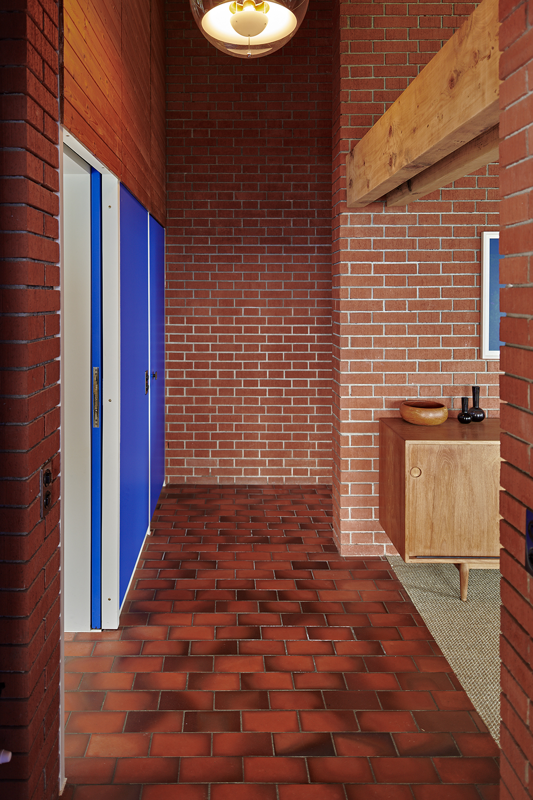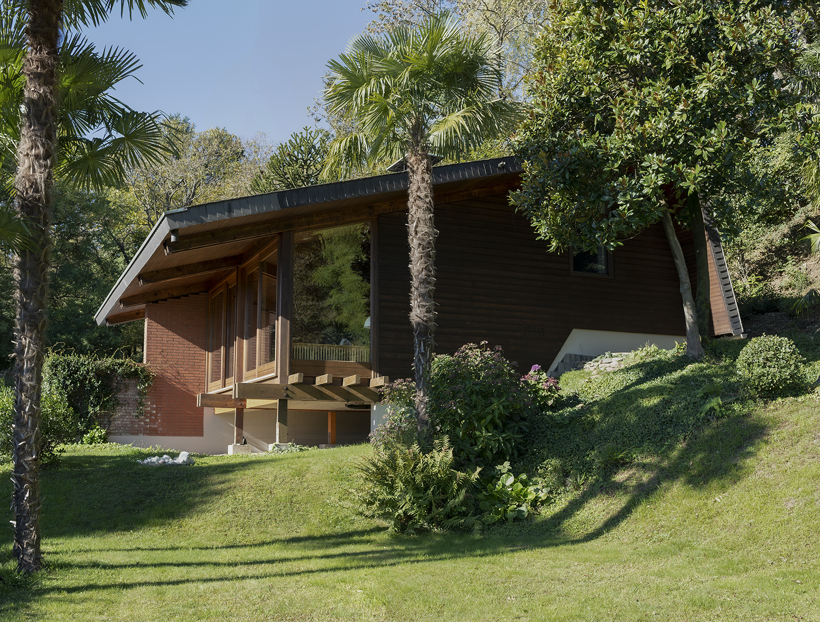 Characterised by exposed brickwork, a load-bearing wooden structure and an asymmetrical gable roof, the house expresses a distinctly modern domestic language rooted in material honesty and spatial clarity.