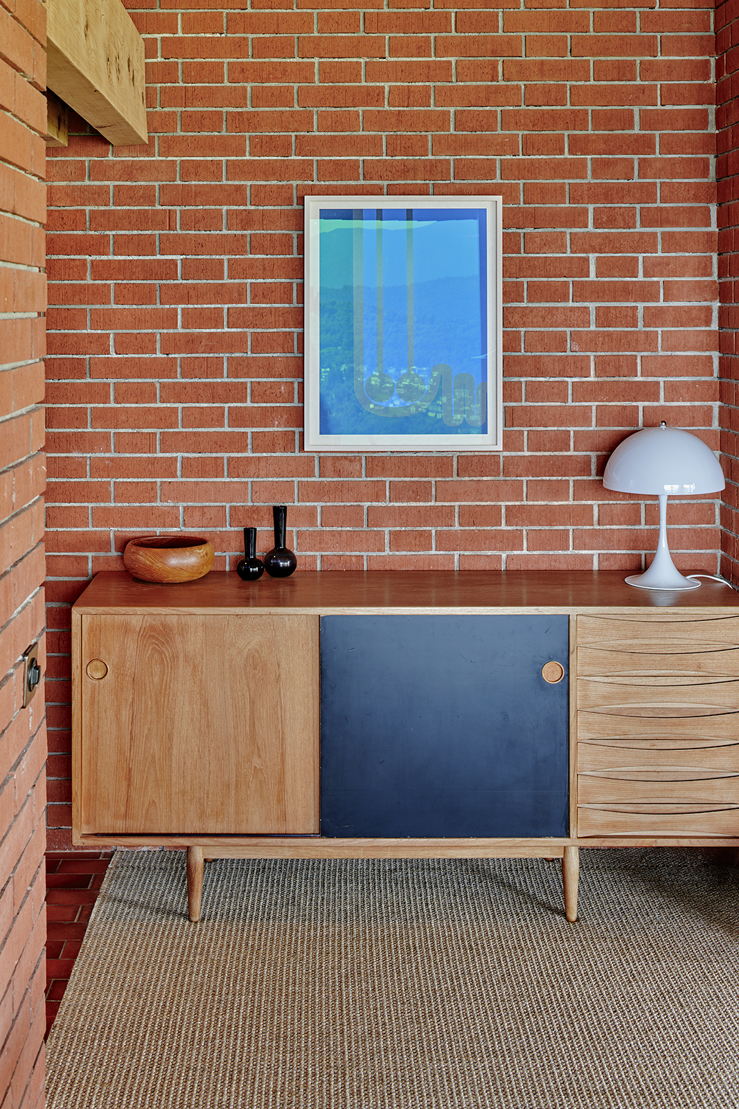 The red Klinker tiles give way to a new Ruckstuhl Flow sisal carpet, while the original colour scheme of lacquered wood surfaces is retained and refined through Le Corbusier’s Les Couleurs palette.