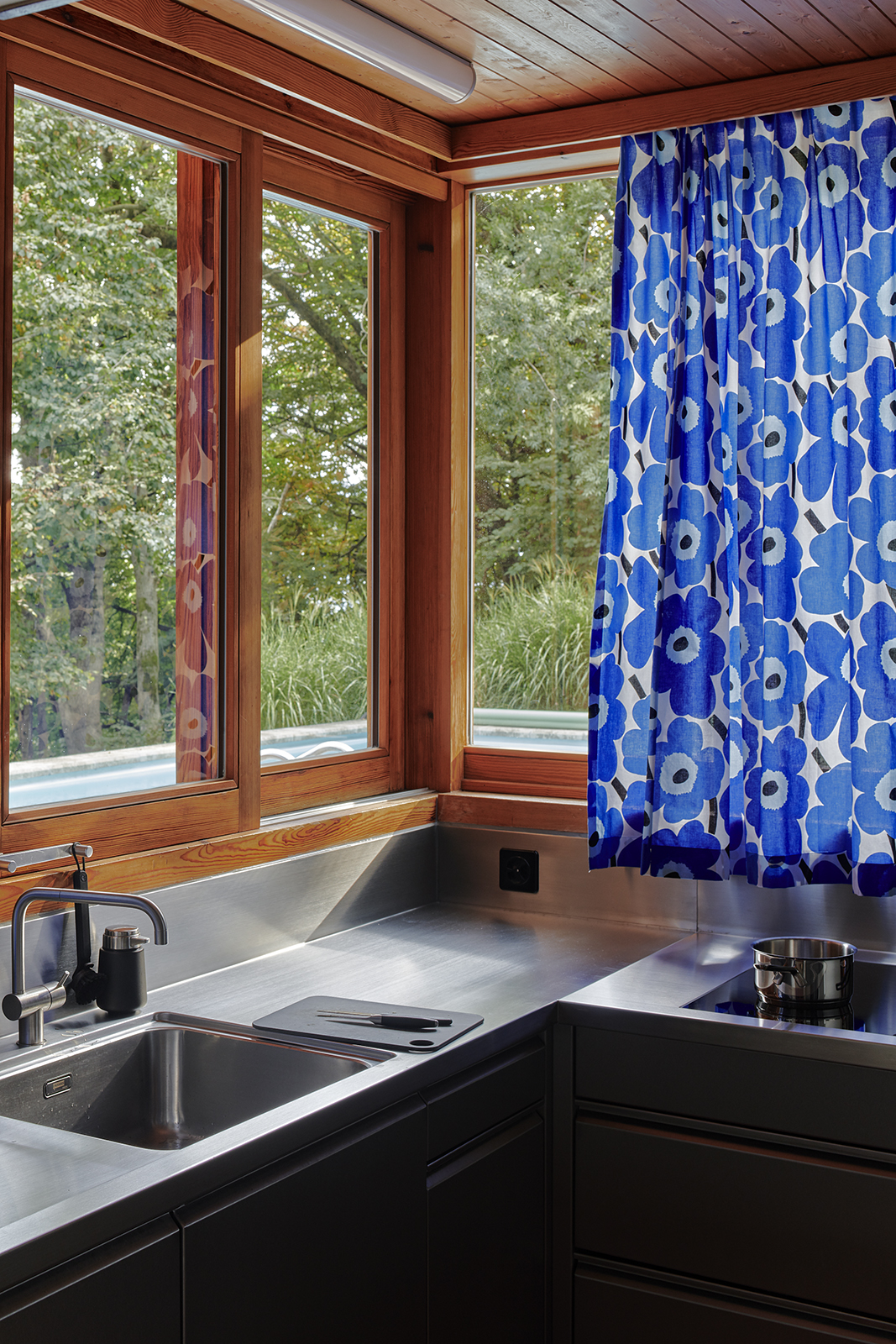 A new stainless-steel kitchen introduces a contemporary layer, contrasting yet respectful, reinforcing the house’s timeless modernist identity.
