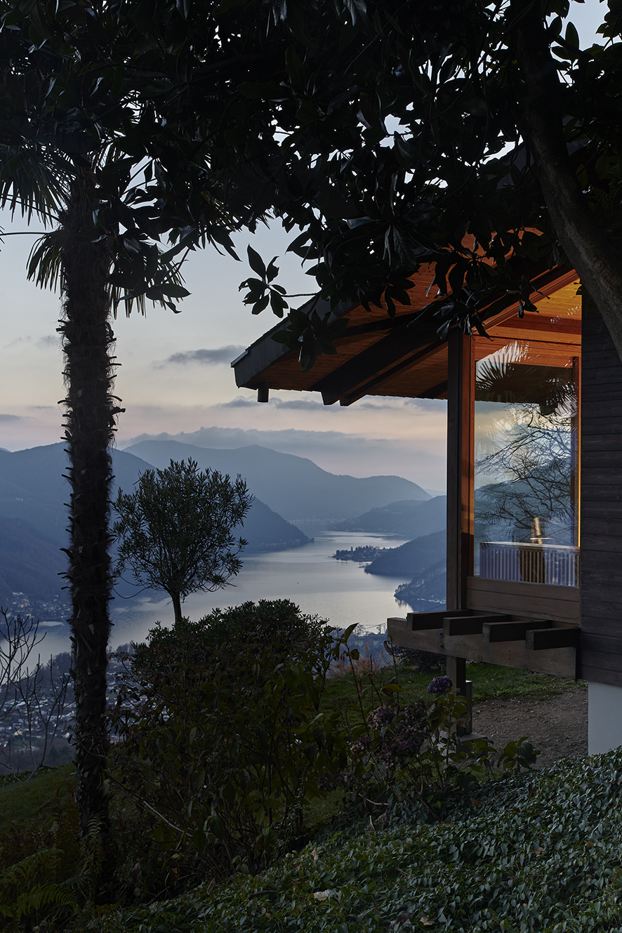 The sloping roof defines the intimate volumes of the sleeping area, while the living room opens generously toward the landscape through large glazed surfaces, framing panoramic views of the Agno–Porto Ceresio branch of Lake Lugano. The façade facing the woods is entirely clad in prefabricated roofing tiles, reinforcing the building’s robust and almost infrastructural character.