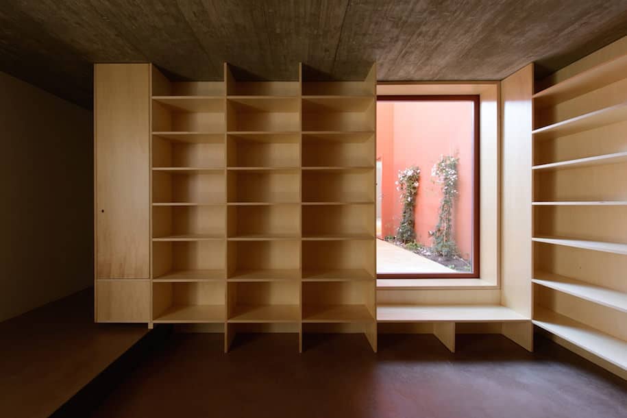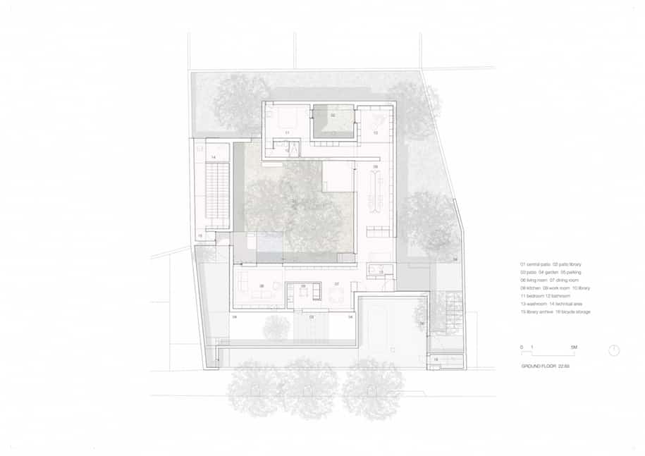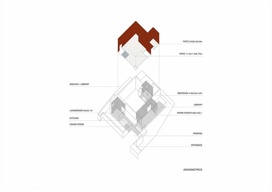 The house develops around a courtyard through a path, from the common areas to South/East, to the most private spaces to the North. A path that includes two rooms with 5m high, a kitchen, a dining room and a library. At the Northern edge of the house is the most private area, the bedroom and the bathroom.
