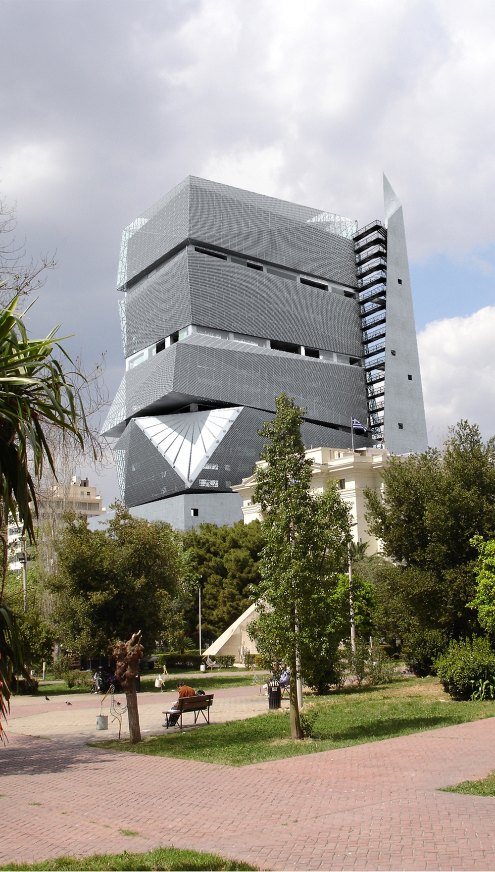 The Piraeus Tower is a typical office and retail building, with a cafeteria over the suspended socle and a restaurant on the top floor. The intervals between the four proposed volumes are meant to remain vacant, and occasionally house public uses, open to the city. The additional staircase and elevator will connect the surface of the city through the terrace to the public floors cutting through the body of the building.