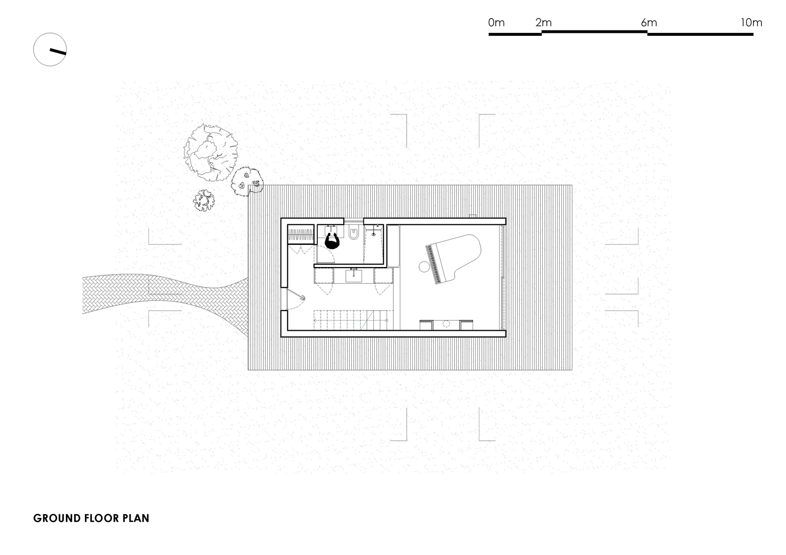 In the second space, the entrance threshold and parallel areas of the staircase, circulation, kitchen, and bathroom shape the ground floor level, and the loft is formed by the necessary sleeping space; where small windows designed to the south and west, and larger ones to the east in order to achieve maximum natural lighting and ventilation.The proposal for the music studio concerns a high-quality lightweight steel structure.