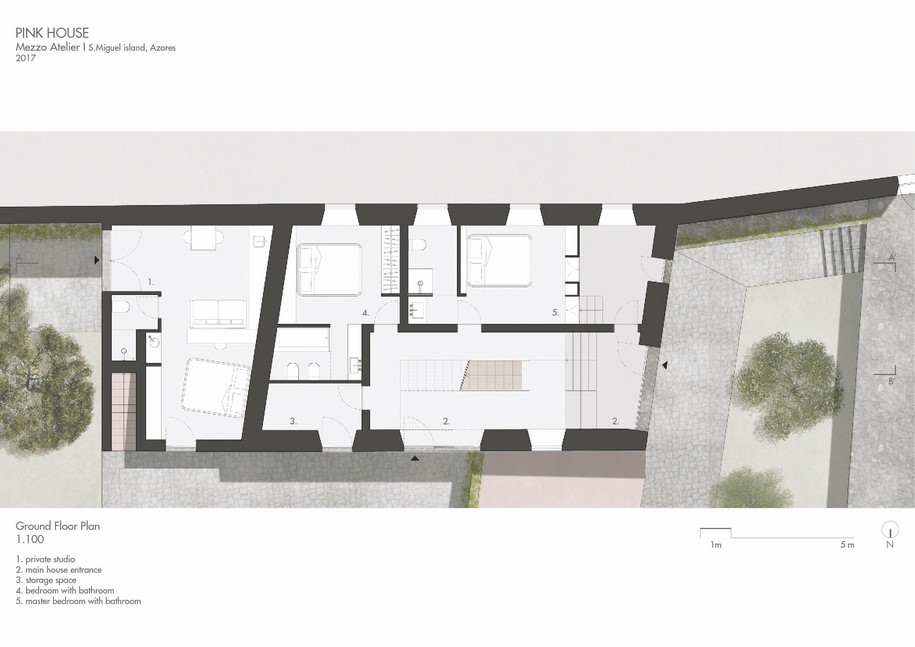 The bigger house develops in two levels: the ground floor opens to the surrounding exterior spaces and reaches out to it’s different heights, creating a semi-level floor where a social space gives access to the private suites and service area.