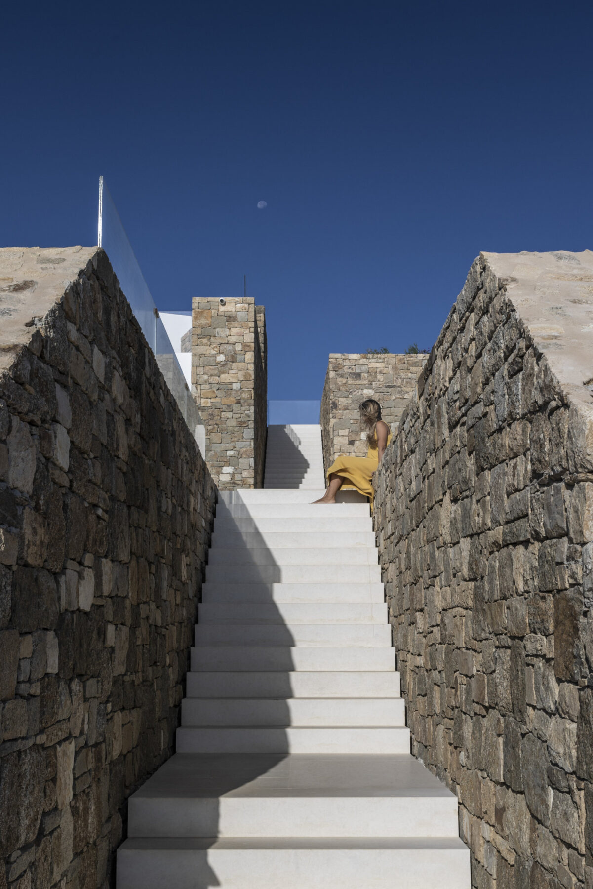 The prominent outdoor staircase, crafted with impressive scale, bisects the pool with substantial marble blocks, creating delineated triangles. These triangular spaces accommodate the brasero sitting area. Anticipating potential developments on the lot bellow, the architects placed the water element in the southern part of the property to obstruct views towards the lower land, ensuring an uninterrupted sea view from our level.