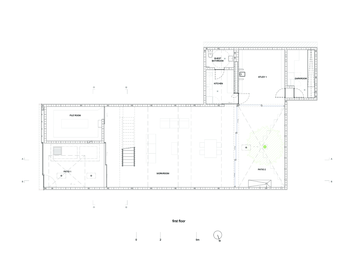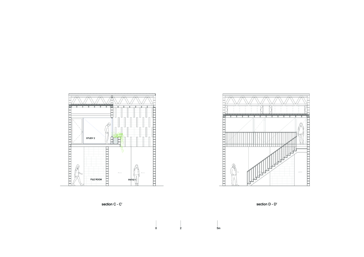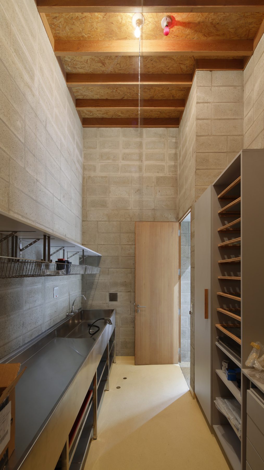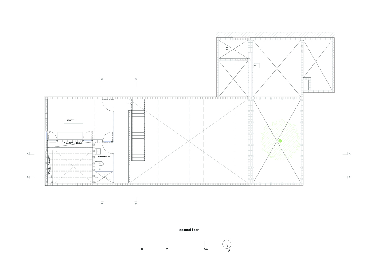 Around this central nucleus, the program unfolds with deliberate restraint: a kitchenette and two adaptable rooms that may function either as studios or as temporary residences for visiting artists. Only the bathrooms and the darkroom remain fully enclosed, preserving privacy and meeting the technical demands of analog photographic practice. From the main workspace, a staircase ascends to an upper gallery and a private study with an en-suite bathroom, offering an elevated vantage point that reconfigures the spatial perception and establishes a horizontal dialogue with the vegetation in the cantilevered planters.