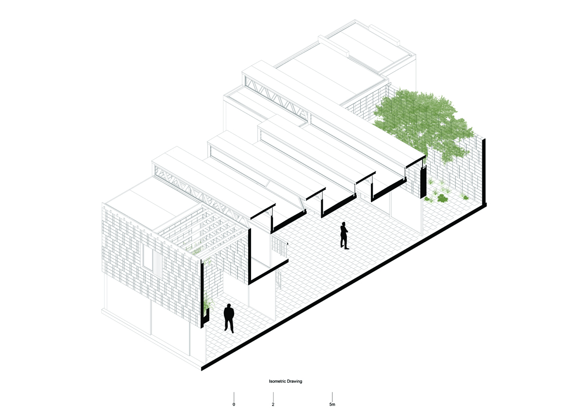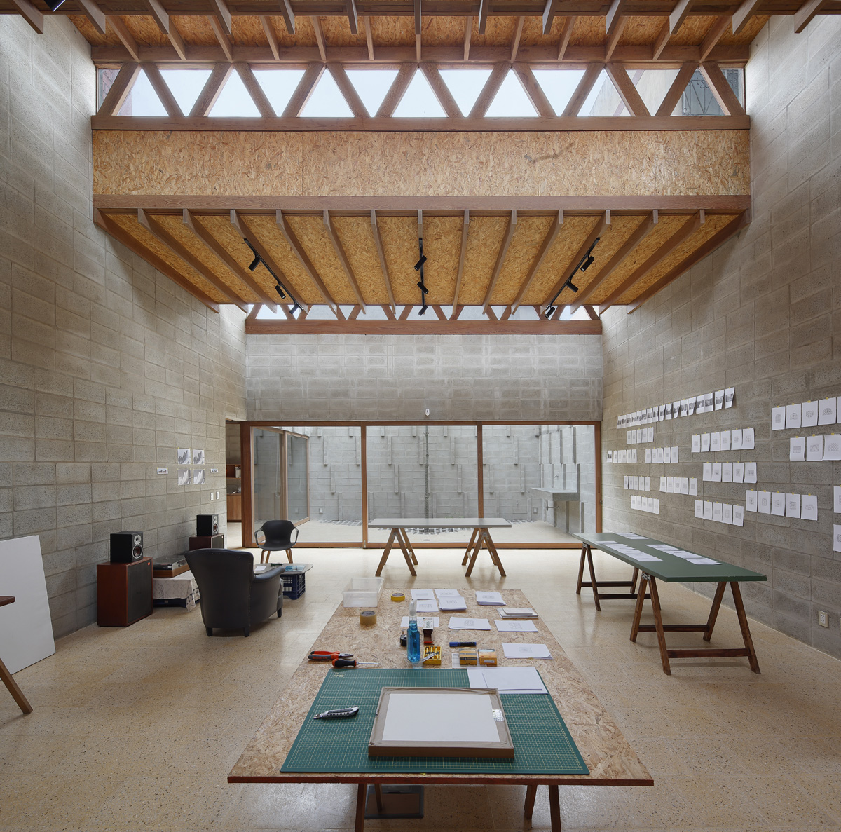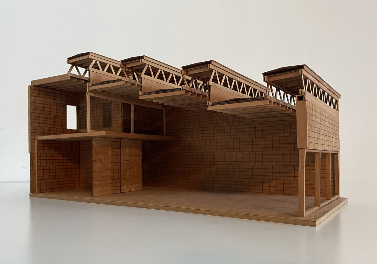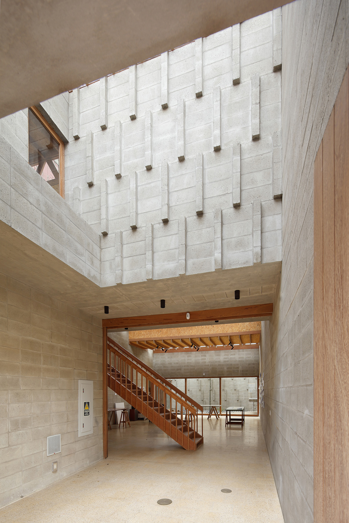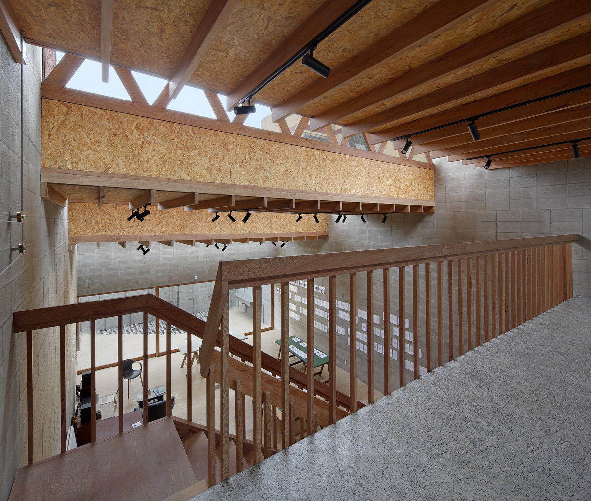 Perimeter walls of reinforced concrete block define a resolute enclosure, while a system of eight huayruro wooden trusses, each spanning 6.7 meters, supports the folded roof and simultaneously braces the masonry envelope, forming a coherent structural armature. The roofline descends gradually from the second level toward the rear courtyard, generating a dynamic sectional profile. Along this trajectory, the trusses also shape four skylights that puncture the roof, flooding the interiors with diffused overhead light and enabling cross ventilation through pulley-operated clerestory windows