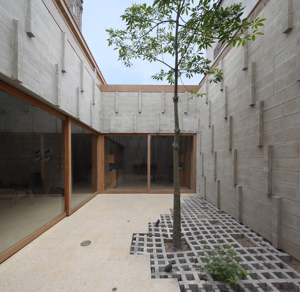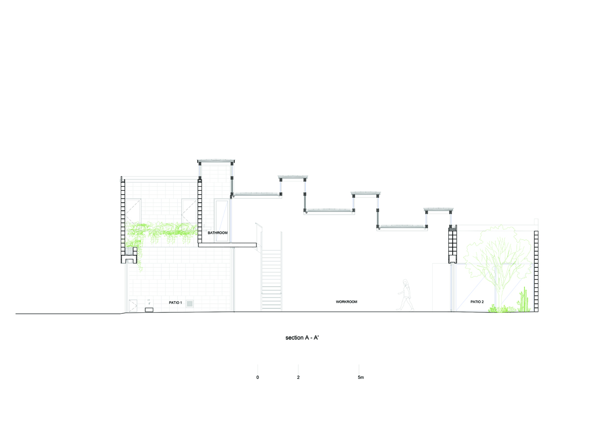 Handcrafted yellow terrazzo tiles extend seamlessly from the interior to the rear courtyard, where they culminate in a concrete-slat planter housing a ceibo tree, accompanied by cacti and succulents selected in response to Lima’s arid coastal climate and the contemplative character of the studio. Ultimately, the project frames architecture as an adaptable container for artistic practice, where making and exhibiting coexist within a single spatial continuum.