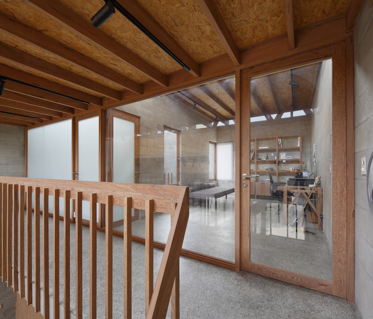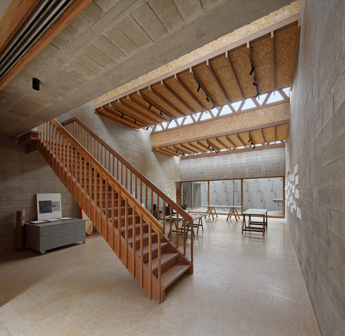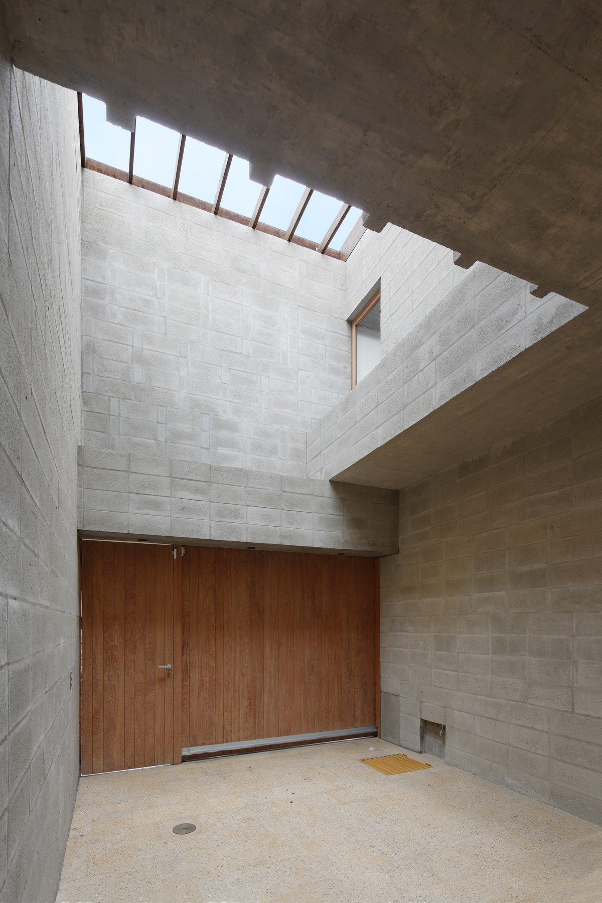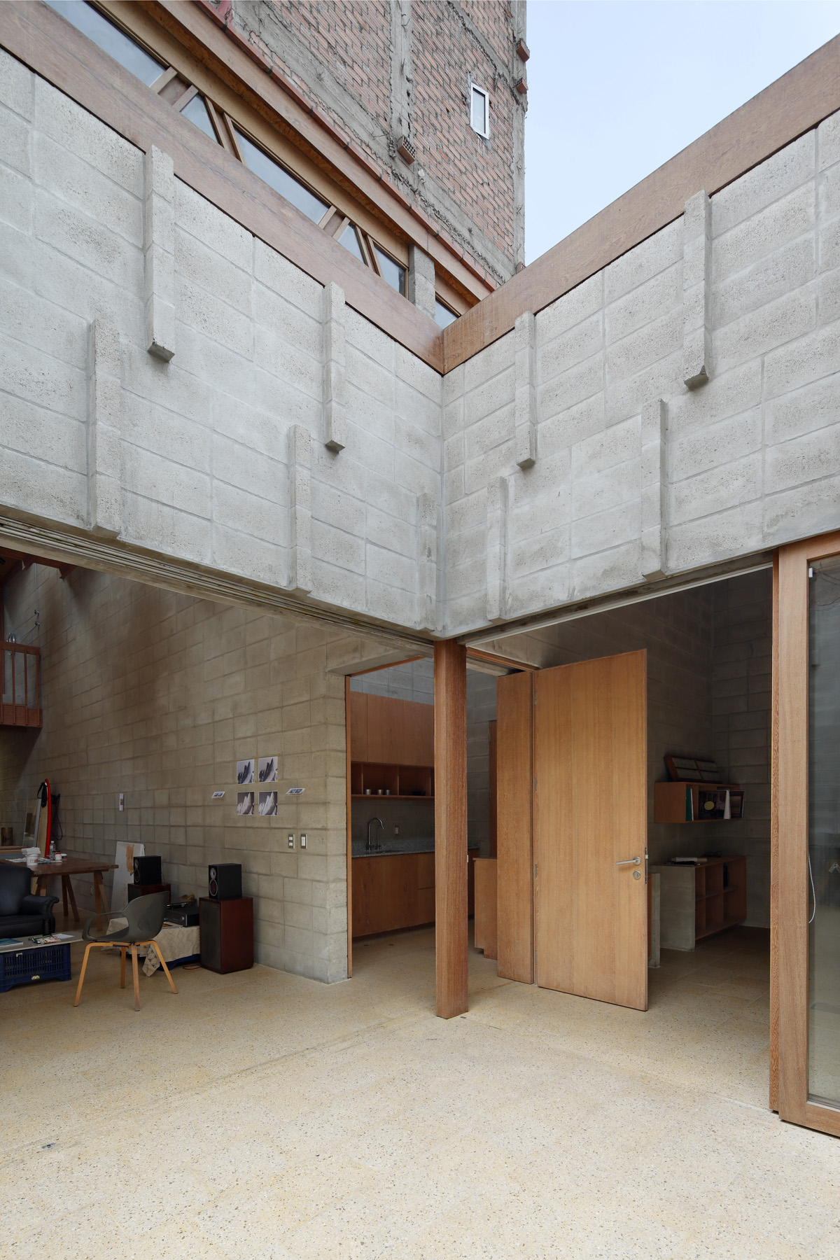 Huayruro wood—a highly resistant tropical species—articulates structure, carpentry, partitions, gates, furniture, and the stair, infusing the interiors with tactile warmth and material continuity. The inner faces of the concrete-block walls are rendered smooth, while in the courtyards they adopt a textured relief suitable for concealed lighting and the potential growth of climbing vegetation.