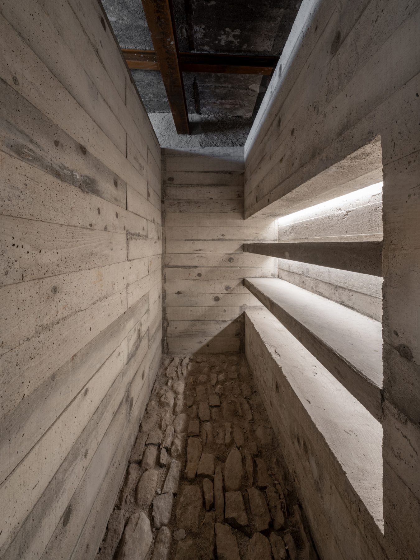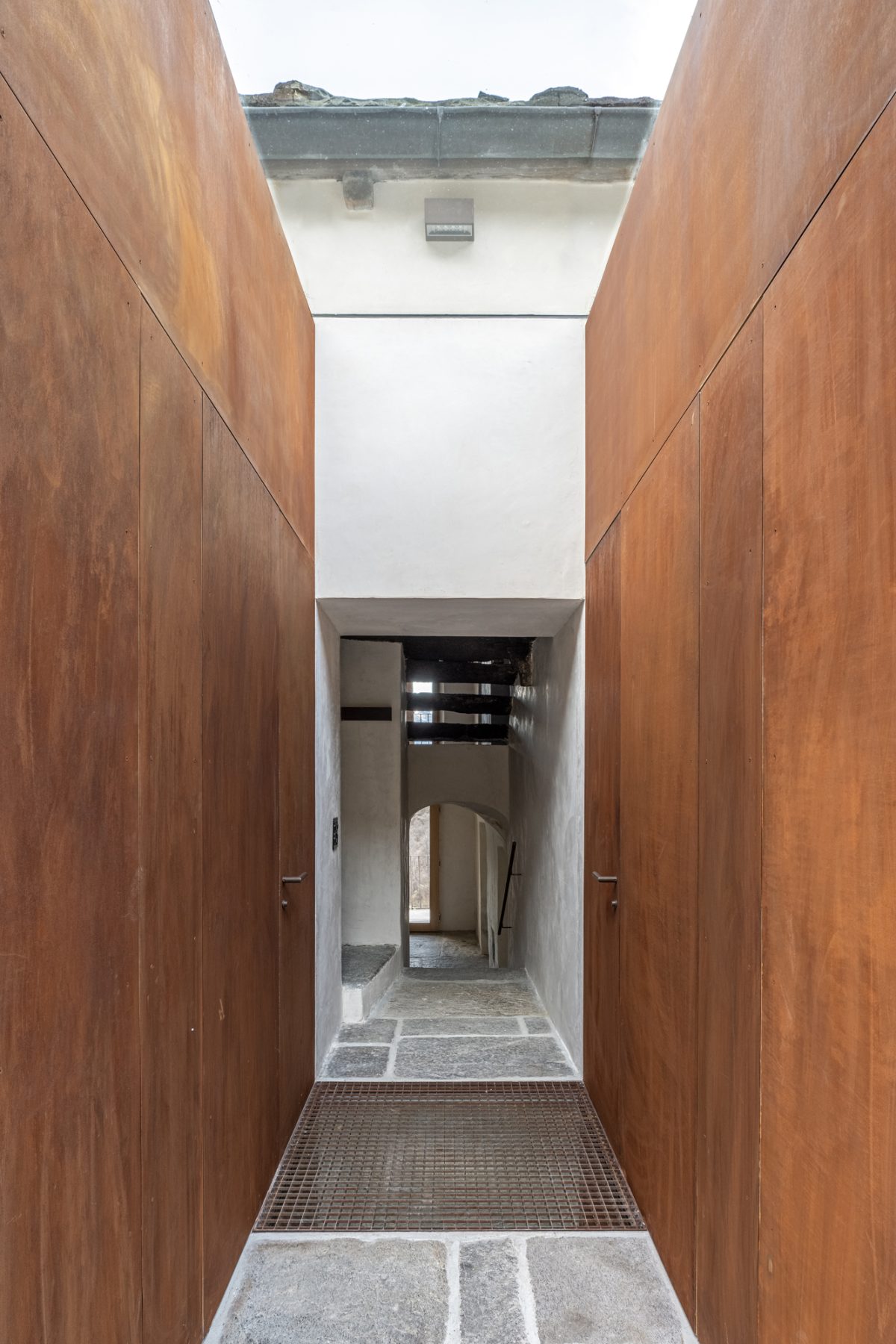 Although the new flat-sloped access staircase is symmetrical to the house, it is not precisely symmetrical in detail, so as not to exaggerate the monumentality of the house “Romagnolo”.