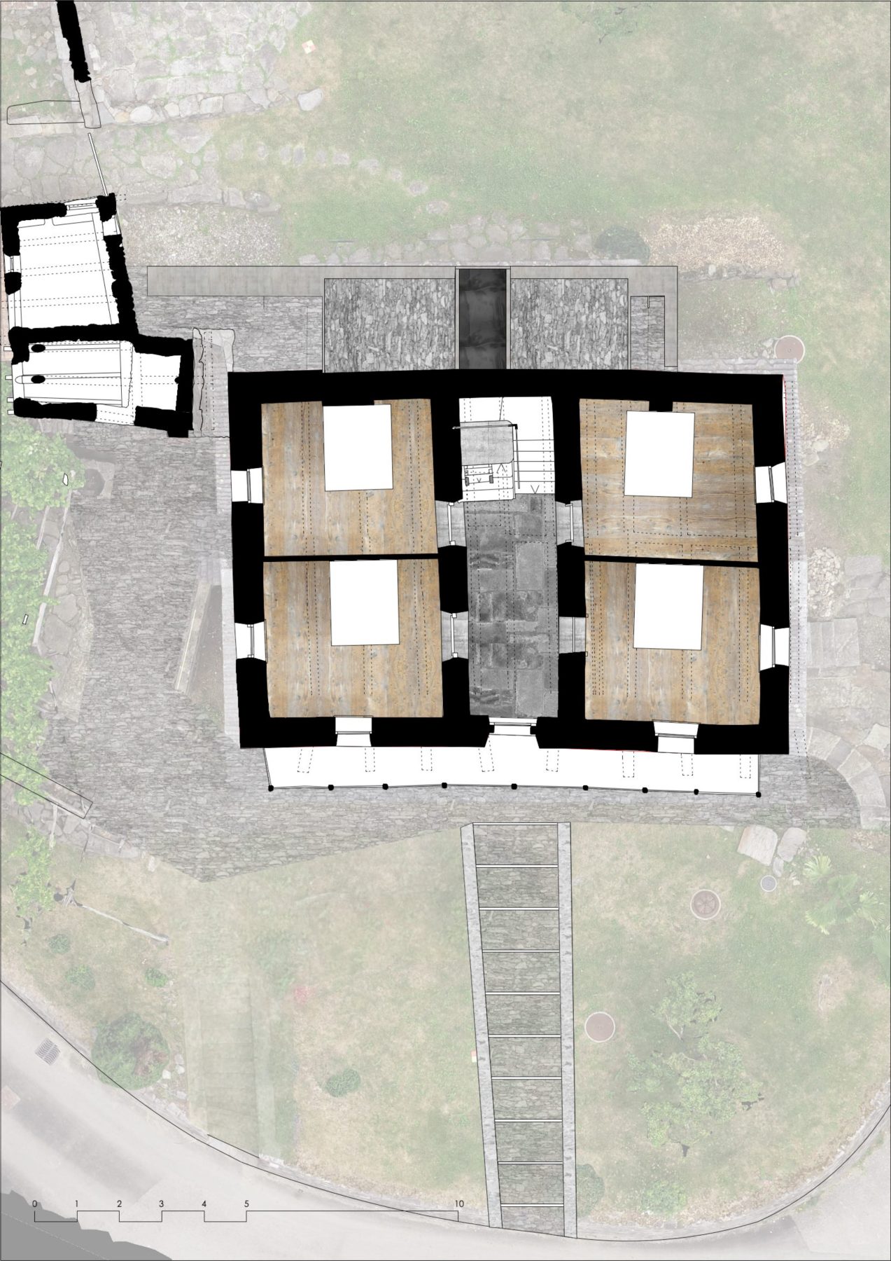 Following the same basic idea, the inner forecourt in front of the baths has a glazed roof; thus this zone is also experienced as an outdoor space inside, albeit covered with glass, one is already outside the historic house here, the baths are outside the house in the garden, as it were.The flat roof has a natural stone paving, also stone like the historic sloping roof, but in a more contemporary, abstract form.