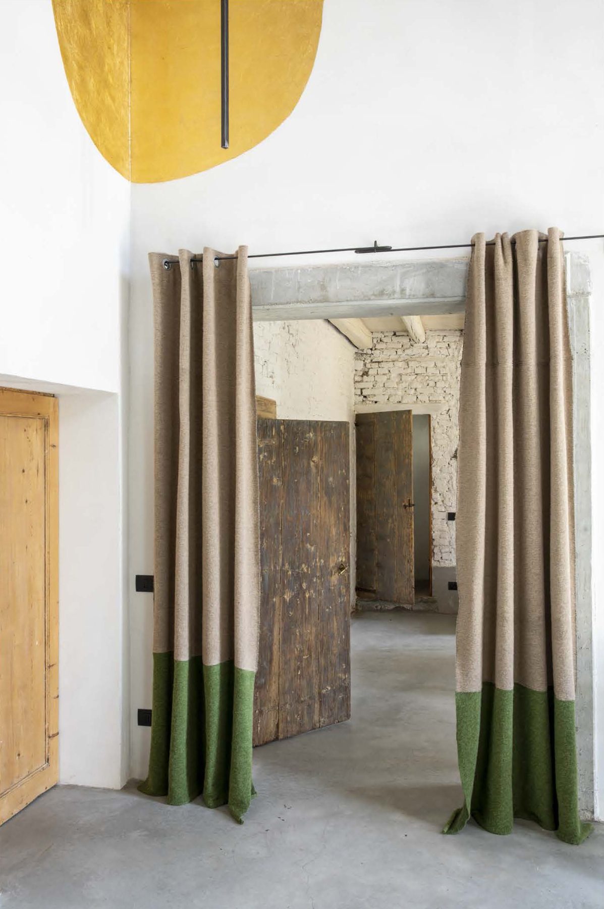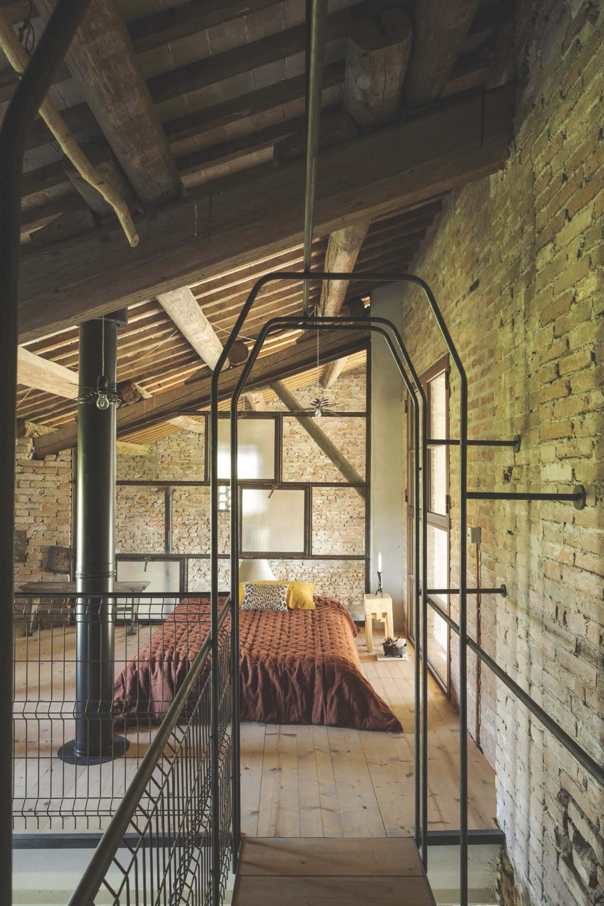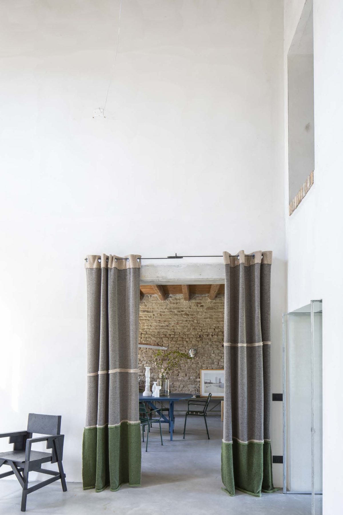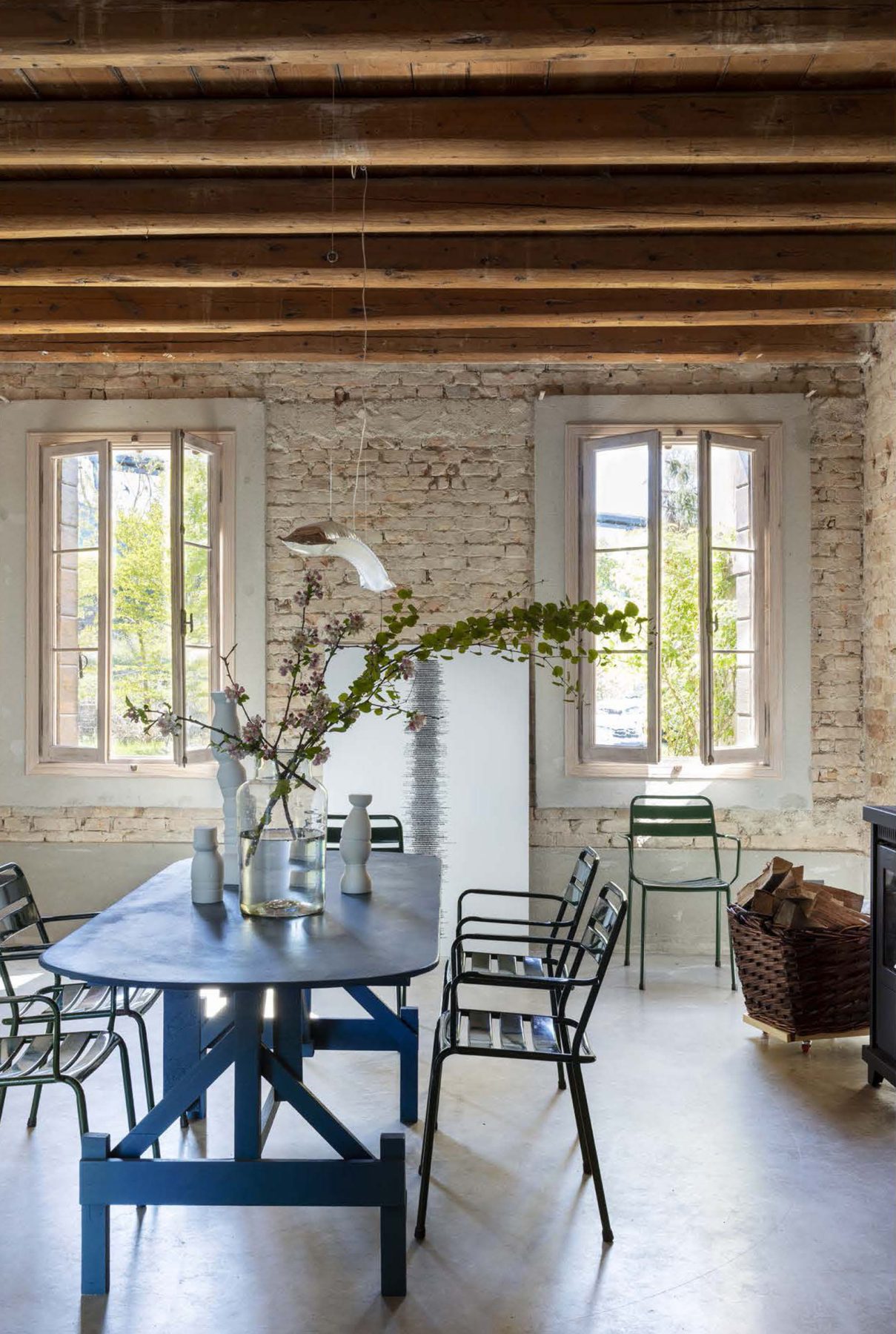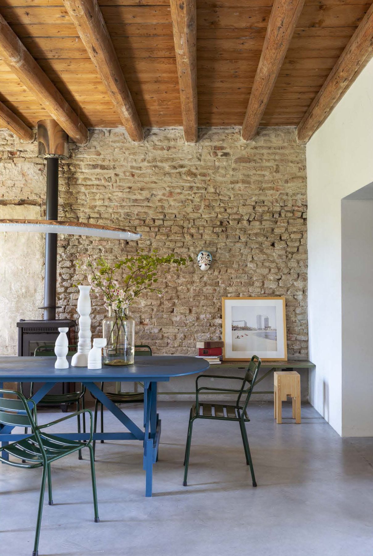 The interiors were stripped down to their bare structure, left exposed to create large double-height spaces that restore a sense of openness and freedom. The intervention does not erase the memory of the past but enhances it through simple, direct material choices: bespoke iron lamps, a concrete kitchen, and frugal objects that echo the sobriety and rawness of the rural setting.