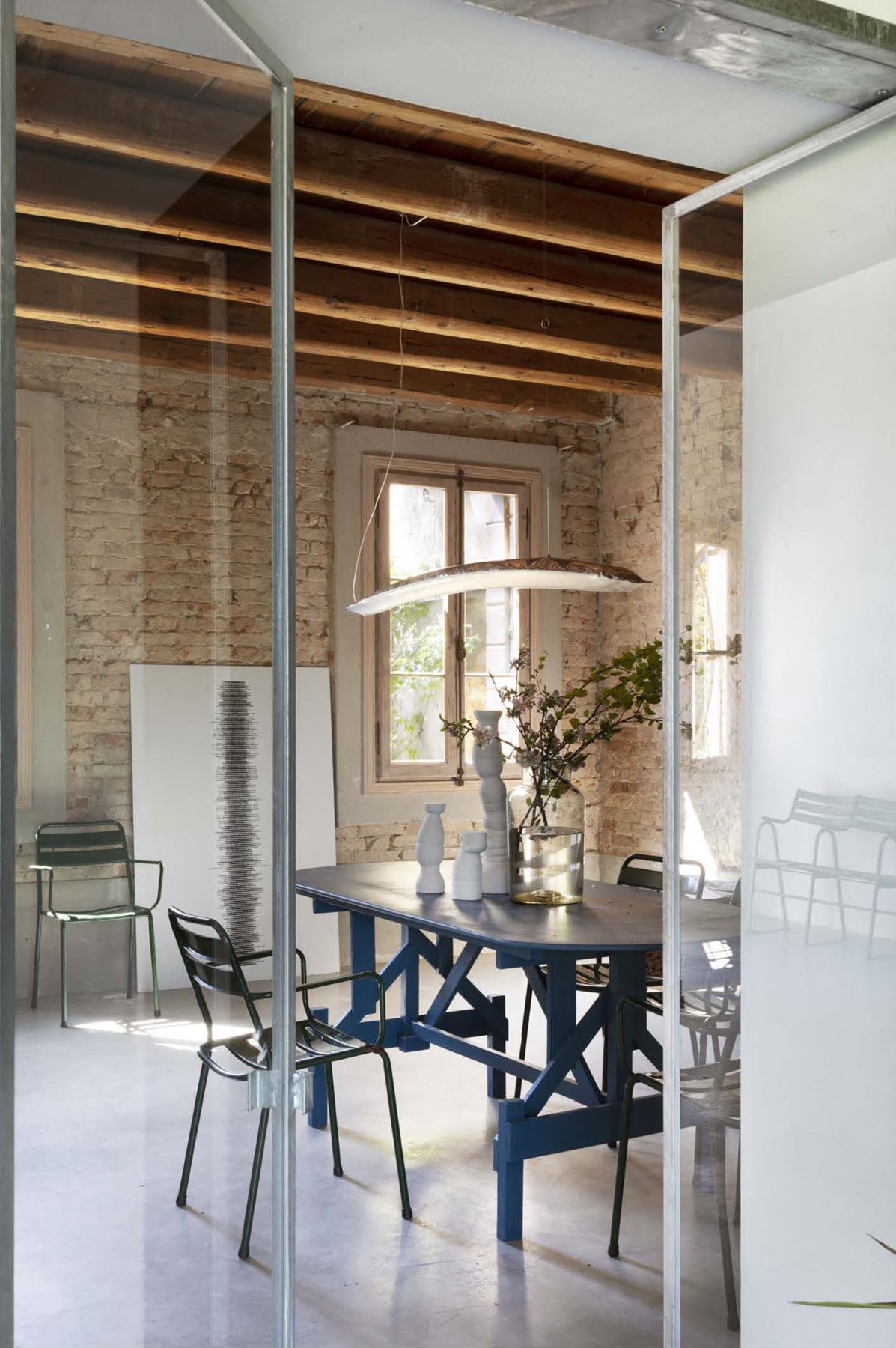 This approach extends to the treatment of window and door frames. Many original elements were salvaged and reinstalled, alongside new iron details designed with extremely slender profiles. Frames, railings, and constructive details appear as minimal, almost graphic lines, establishing a dialogue with the roughness of the existing materials.