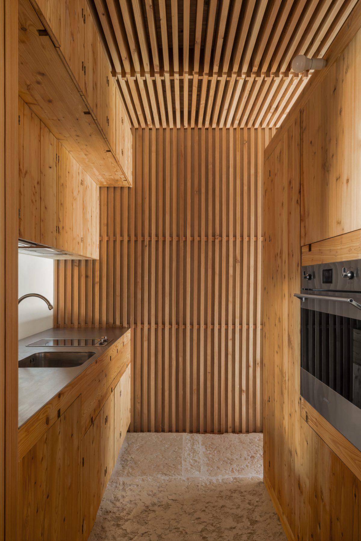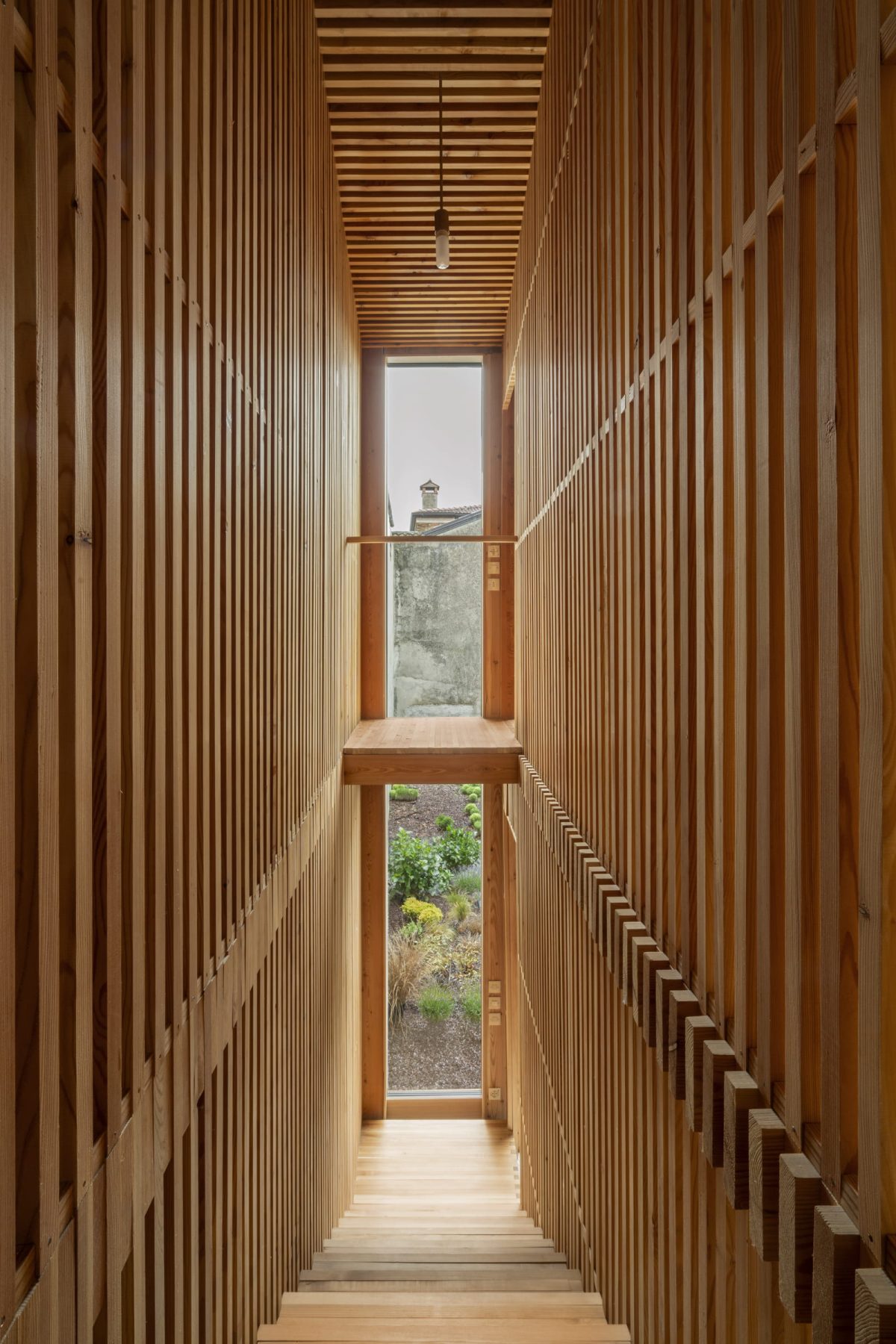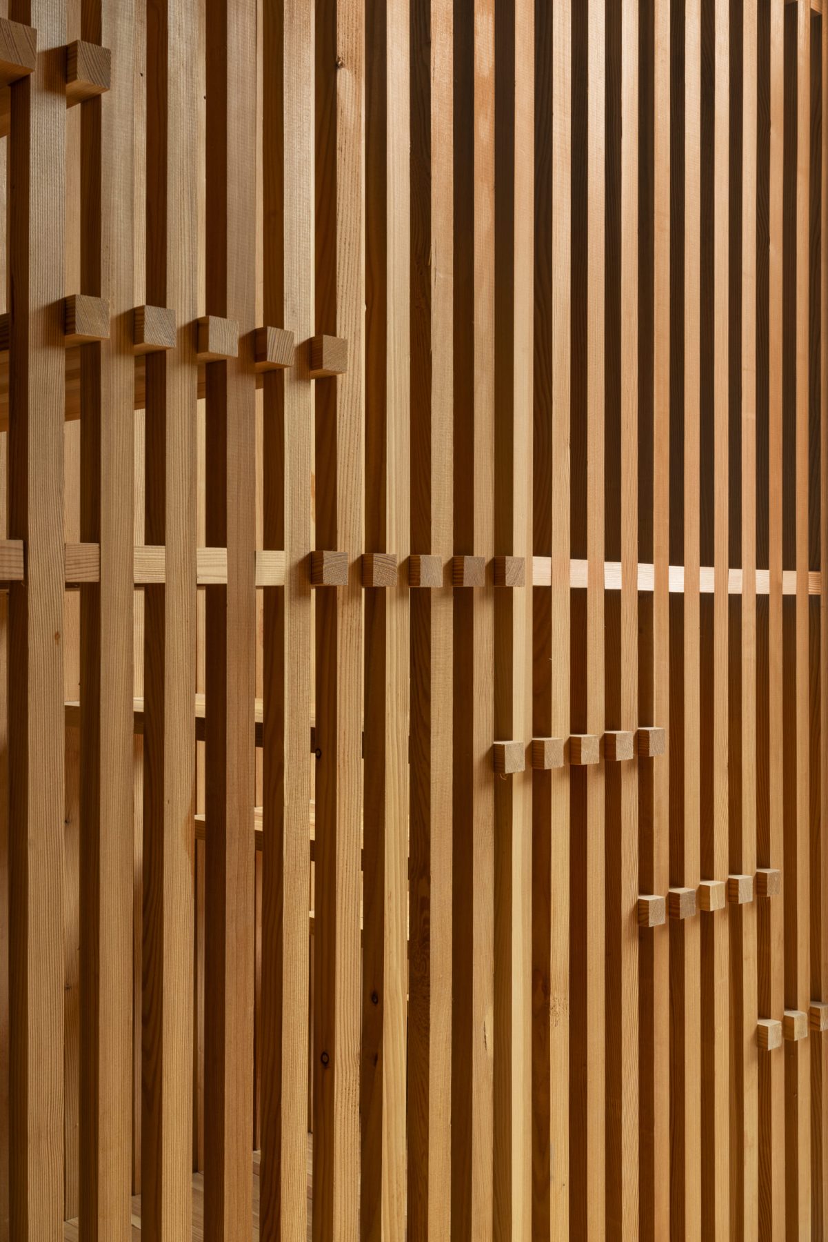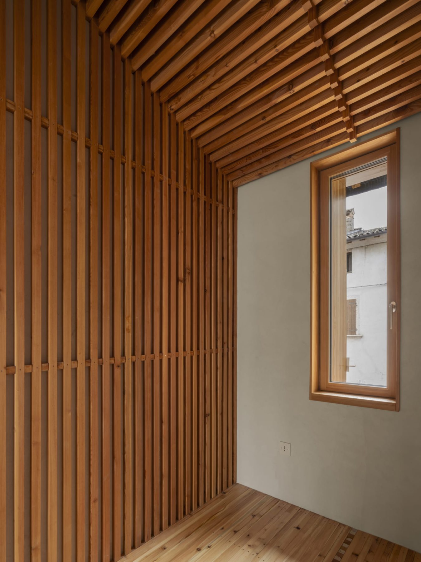 Structurally, the project explores the limits of wood. We minimized the influence area of the floors, allowing for pillar sections as small as 3×3 cm.