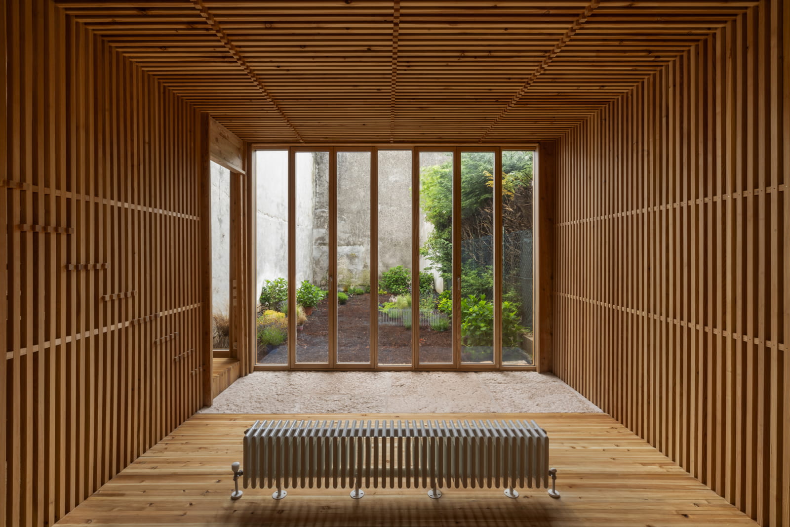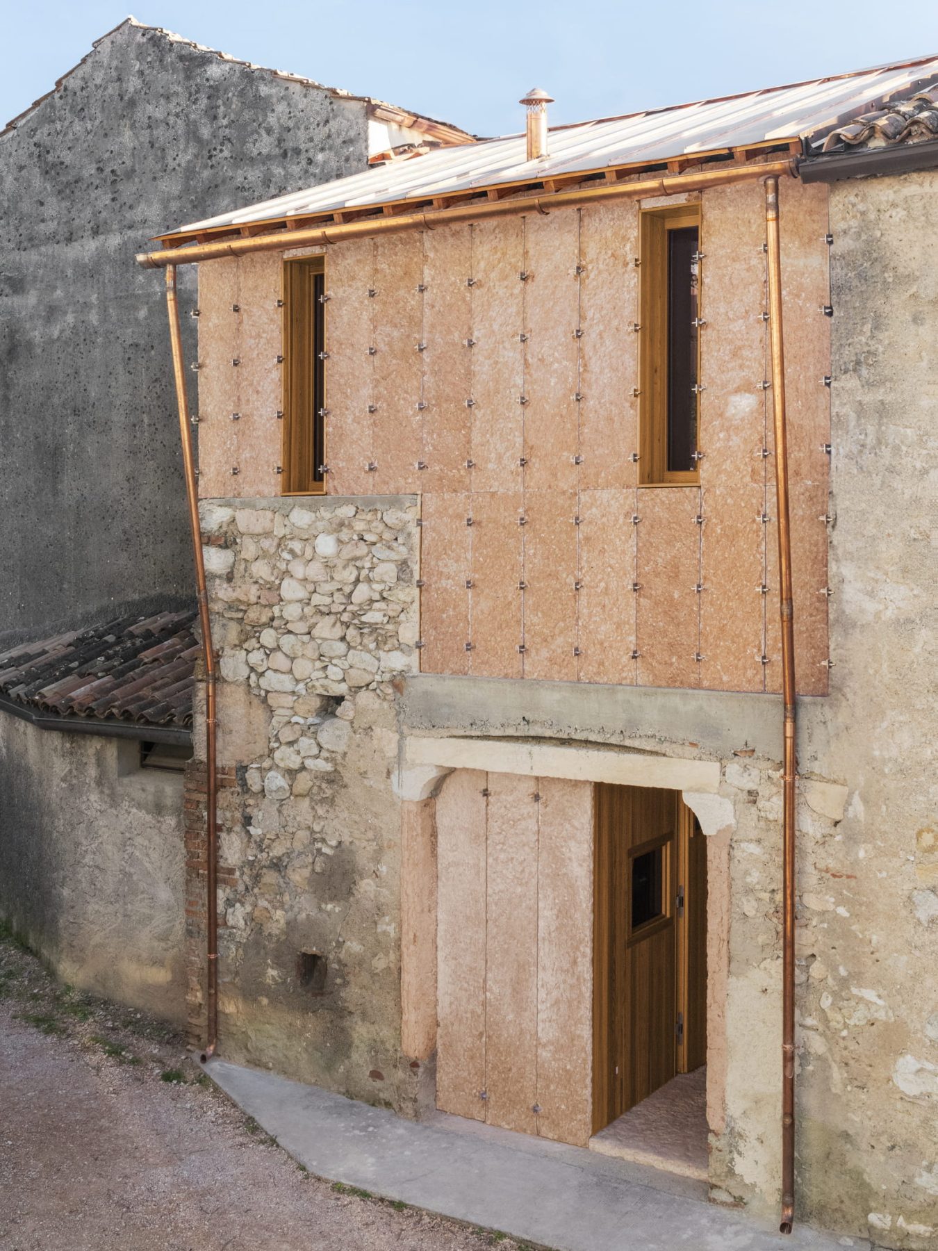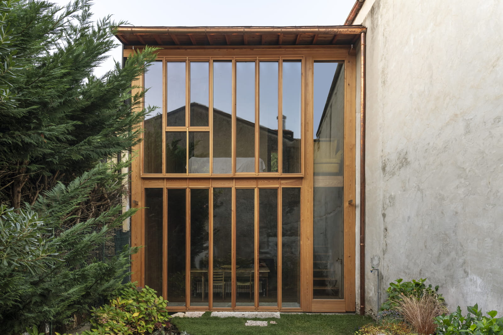 The building, originally a small barn with a trapezoidal floor plan, has two façades, one facing a shared northern courtyard and the other opening to a private southern garden.