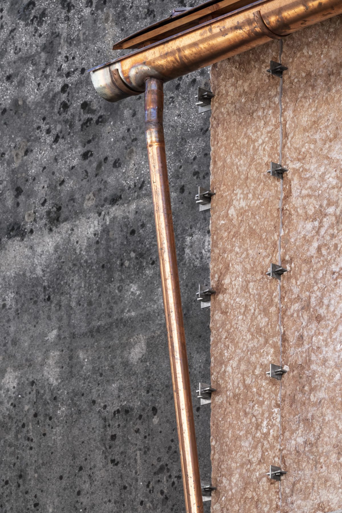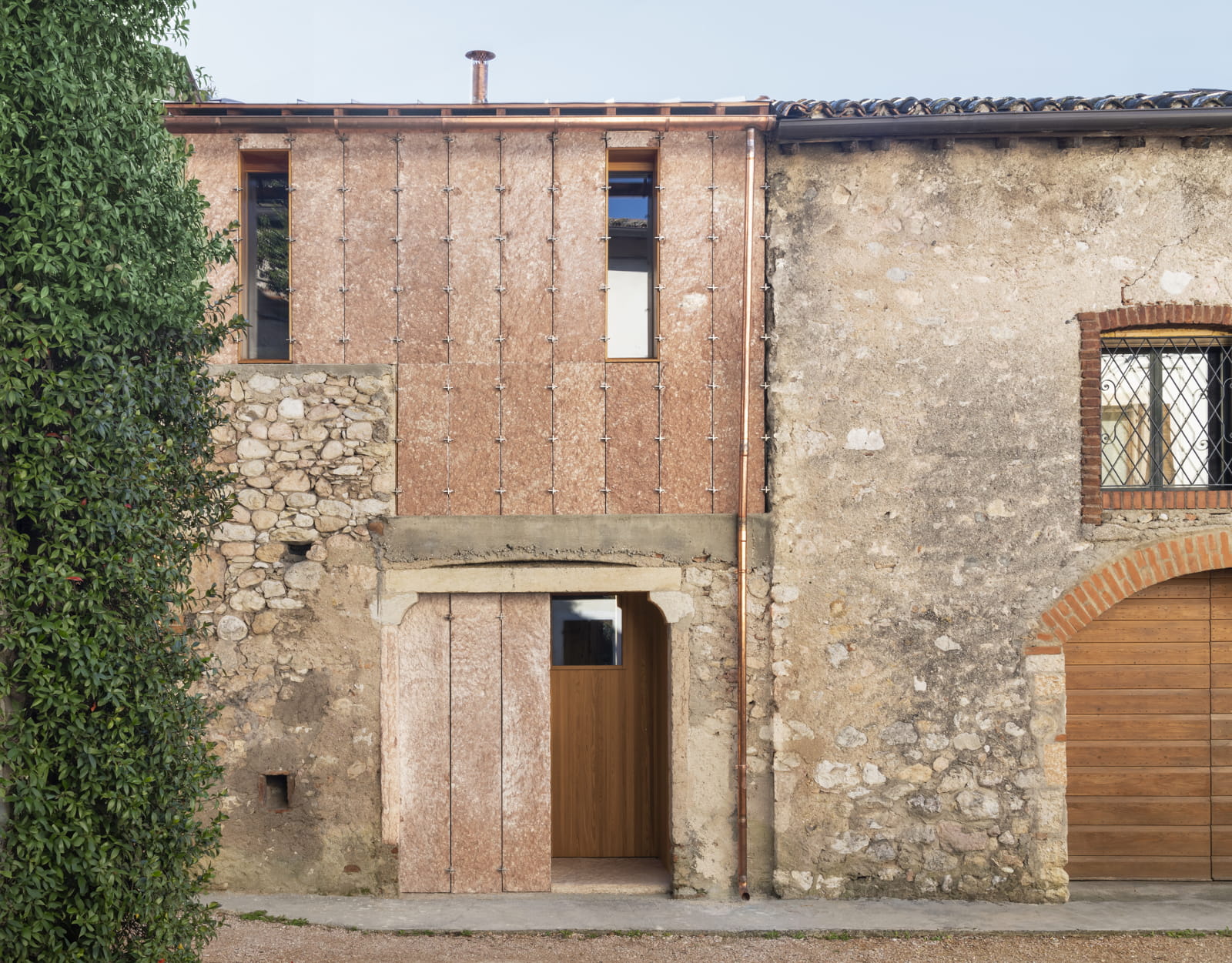 The main façade, built with dry-laid prun stone, inspired from local vernacular architecture (the Lessinia region).