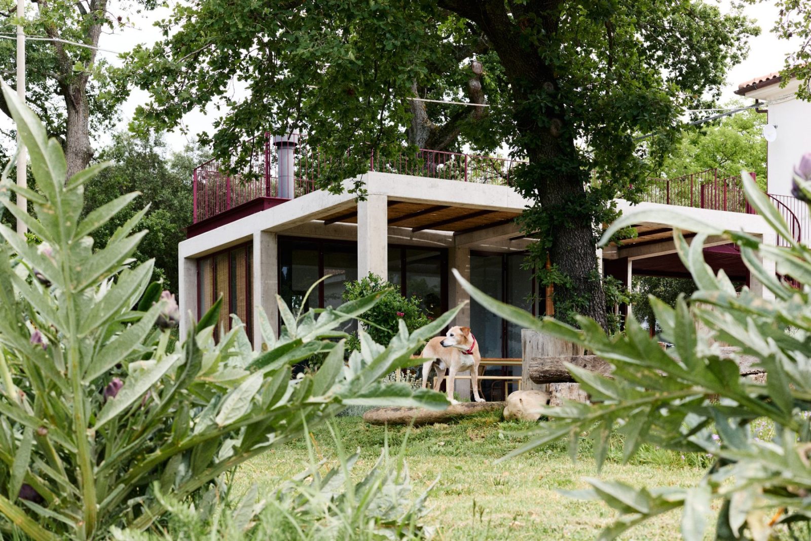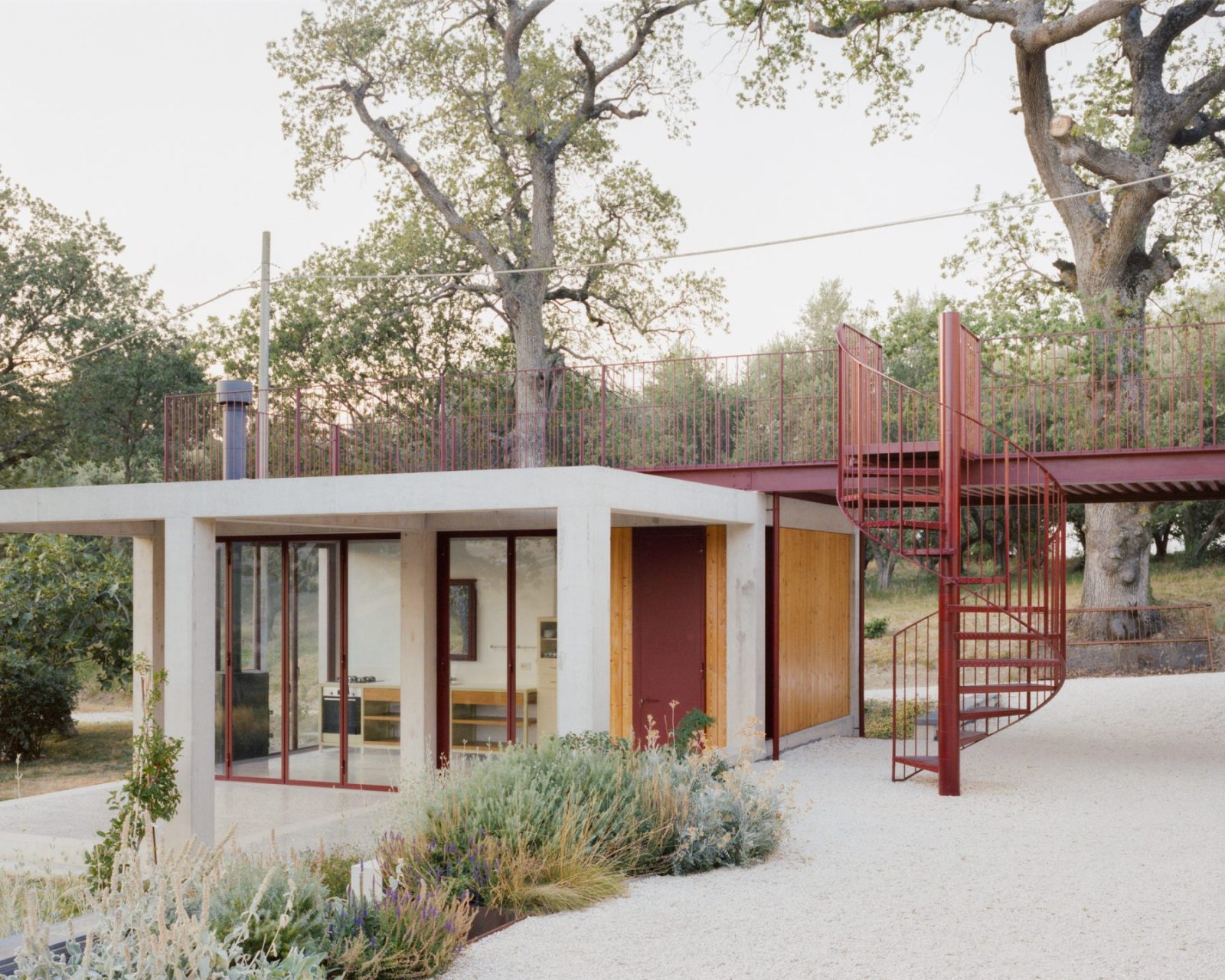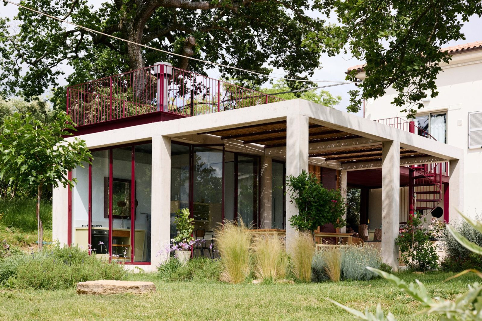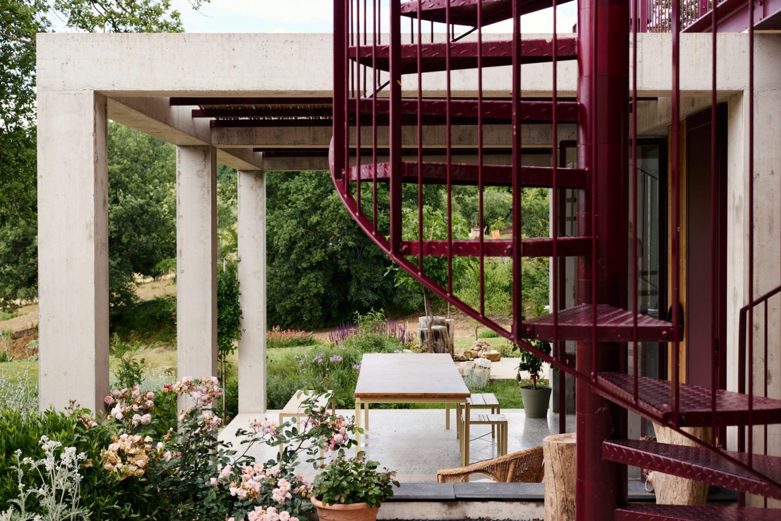 Mecozzi Verdini extend a countryside villa near Loretello in Italy’s Marche region with Annesso Rosso, a red concrete annexe connected to the existing house by a slender steel bridge. Conceived as a modern architectural fragment, the intervention engages the surrounding rural landscape by mediating between natural hills, the domestic garden, and cultivated agricultural fields, establishing a dialogue between nature, architecture, and contemporary rural living.